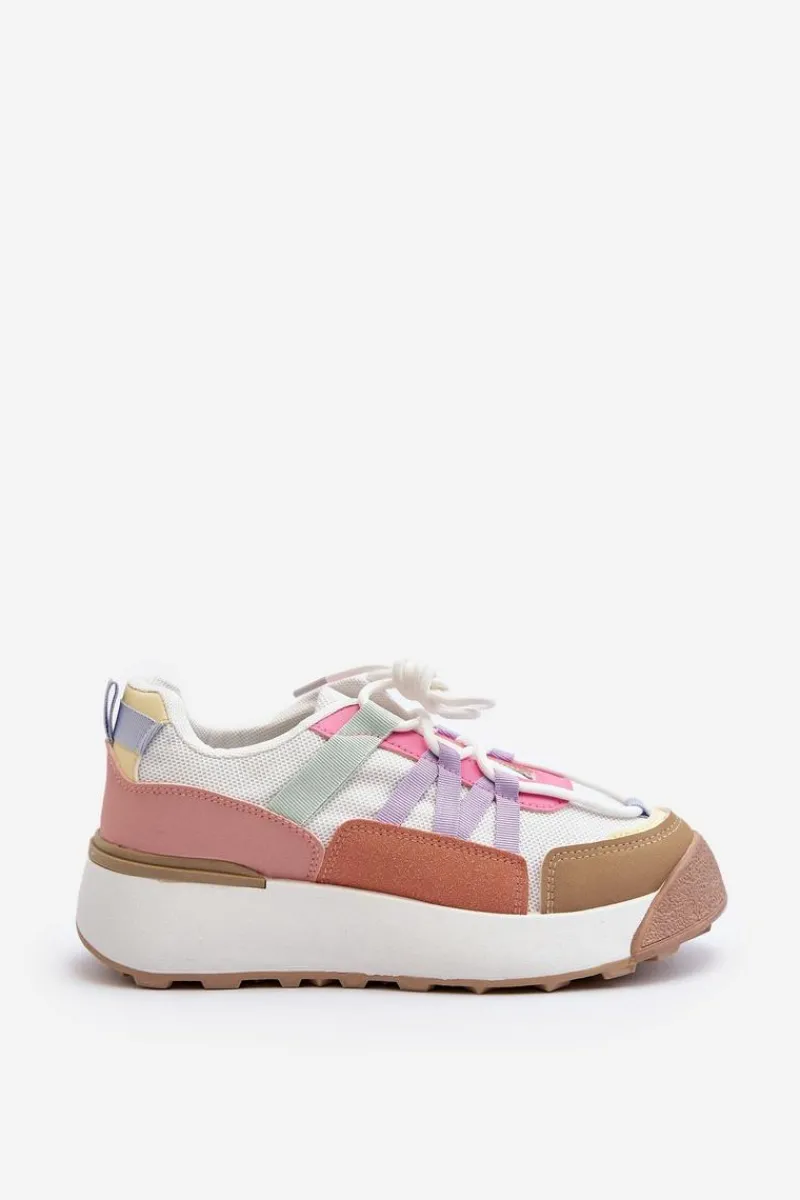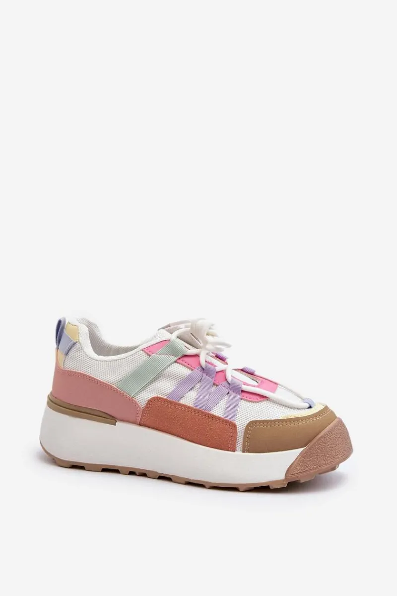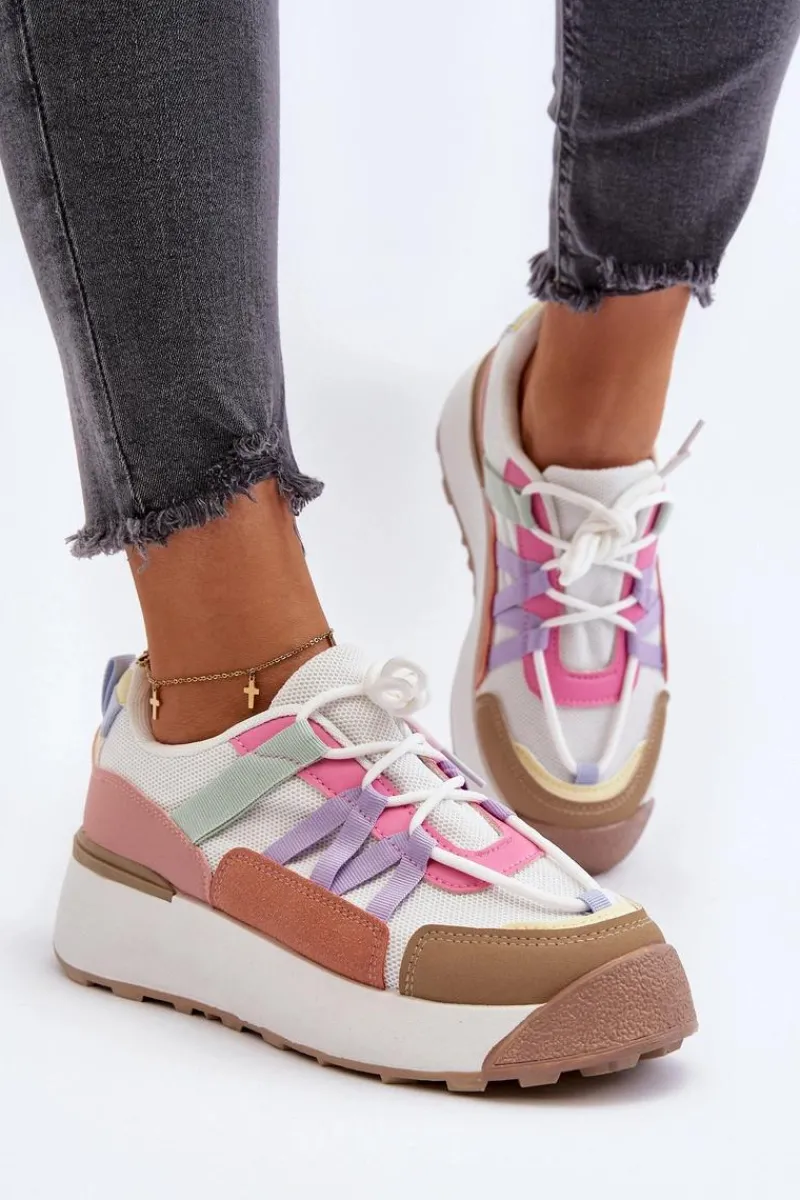 Damskie buty sportowe wykonane z połączenia materiału tekstylnego i eko skóry. Osadzone na masywnej platformie, która delikatnie uniesie Twoją sylwetkę. Model sznurowany. Wkładka z pianki zapewni wygodę podczas użytkowania. Koniecznie musisz je mieć! Przy wyborze rozmiaru prosimy kierować się tabelą rozmiarów.