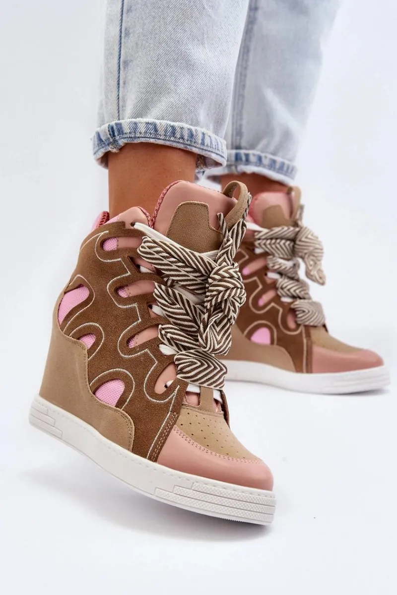 Sneakersy damskie wykonane z połączenia eko skóry i materiału tekstylnego. Osadzone na ukrytym koturnie, który delikatnie uniesie Twoją sylwetkę. Model ten posiada podwójne sznurowanie. Koniecznie powinnaś mieć ten fason w swojej garderobie, jeżeli cenisz sobie modny design! Przy wyborze rozmiaru prosimy kierować tabelą rozmiarów.