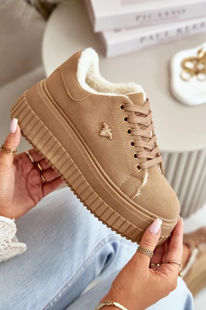 Damskie sneakersy na masywnej podeszwie to modny i wygodny wybór na chłodniejsze dni. Wnętrze butów jest ocieplane miękkim futerkiem, które zapewnia ciepło i komfort noszenia. Noski zaokrąglone, co dodaje klasycznego wyglądu i zapewnia dodatkową przestrzeń dla palców, zwiększając wygodę. Na cholewce umieszczono złoty detal, który dodaje elegancji i stylu, przyciągając wzrok. Te sneakersy są idealne zarówno do codziennych stylizacji, jak i do bardziej casualowych zestawów, gwarantując komfort i modny wygląd przez cały dzień. Przy wyborze rozmiaru prosimy kierować się tabelą rozmiarów.