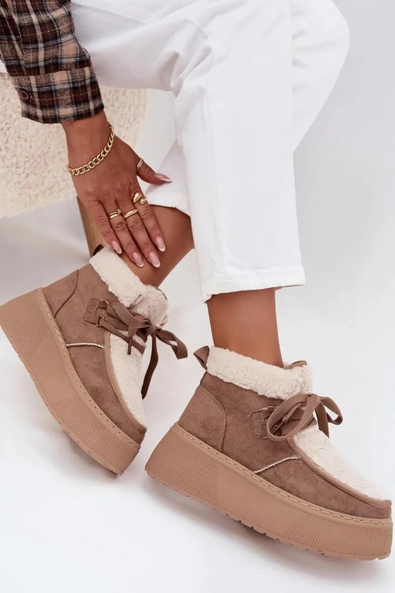 Śniegowce damskie wykonane z miękkiego eko zamszu to idealny wybór na zimowe dni. Model wsuwany ze sznurowaniem świetnie dopasowuje się do stopy, a wnętrze ocieplane futerkiem gwarantuje ciepło i wygodę. Osadzone na solidnej platformie, skutecznie izolują od chłodnego podłoża. To praktyczne i stylowe obuwie, które doskonale sprawdzi się w codziennych, zimowych stylizacjach. Przy wyborze rozmiaru prosimy sugerować się tabelą rozmiarów.