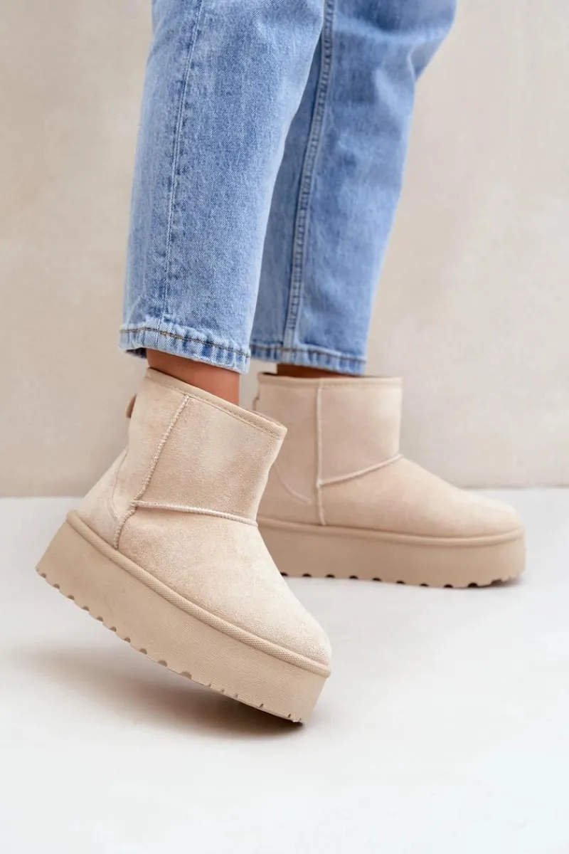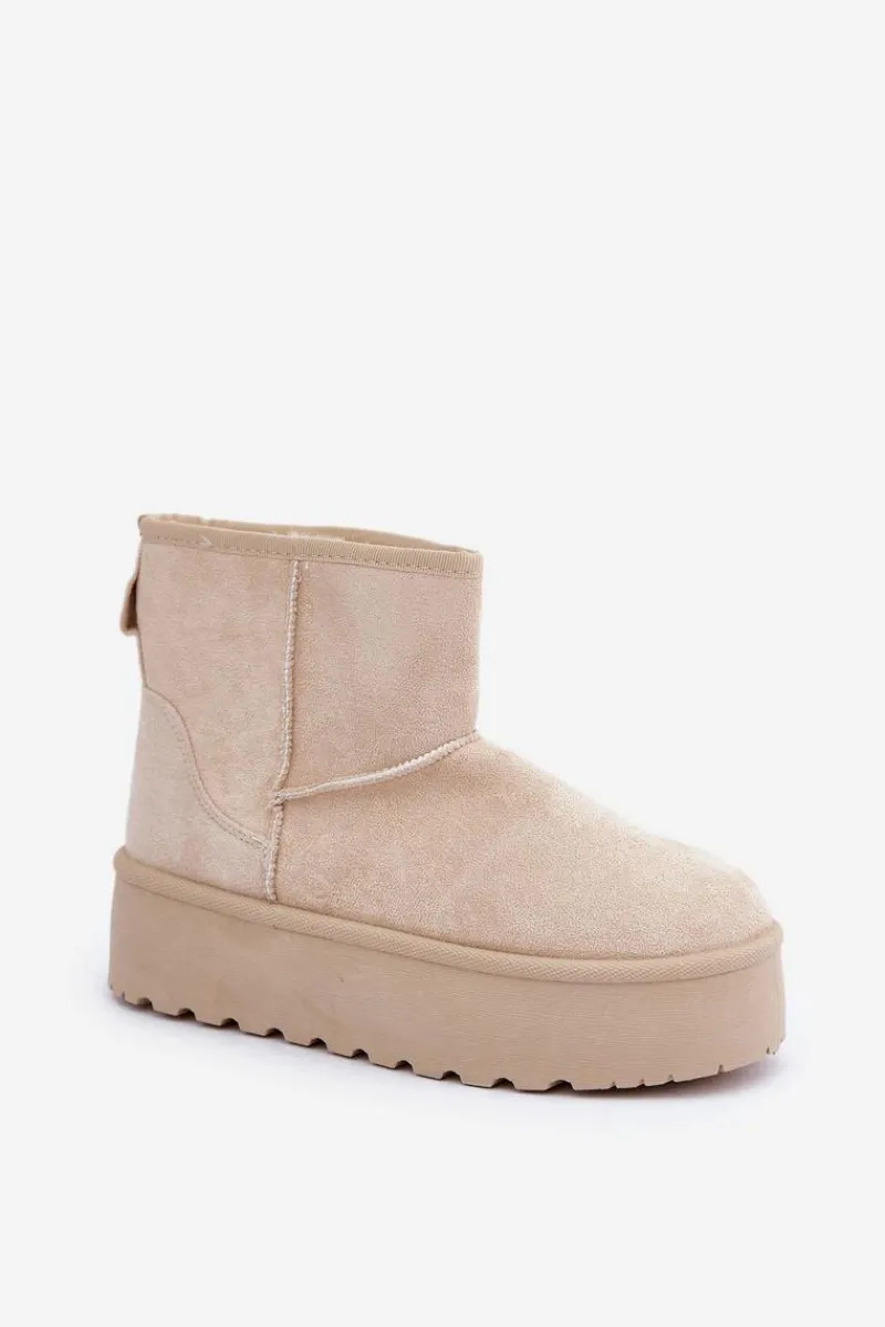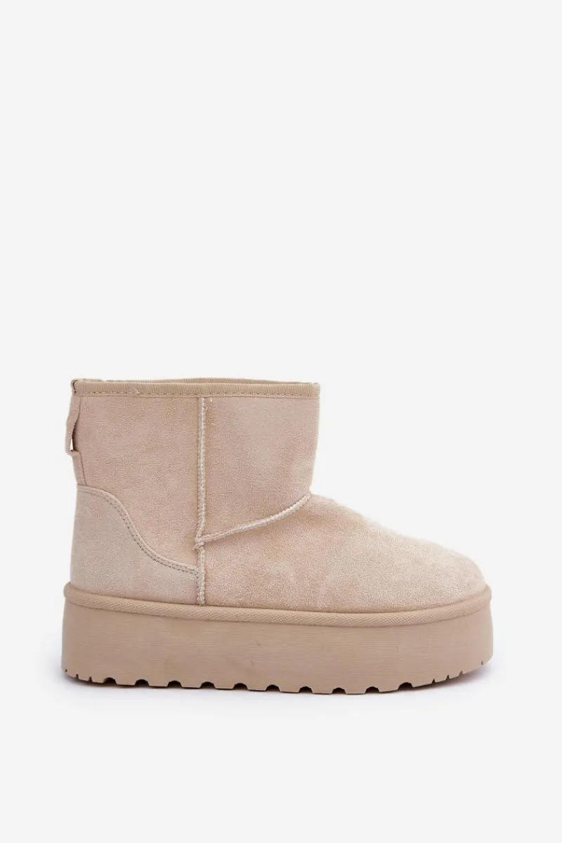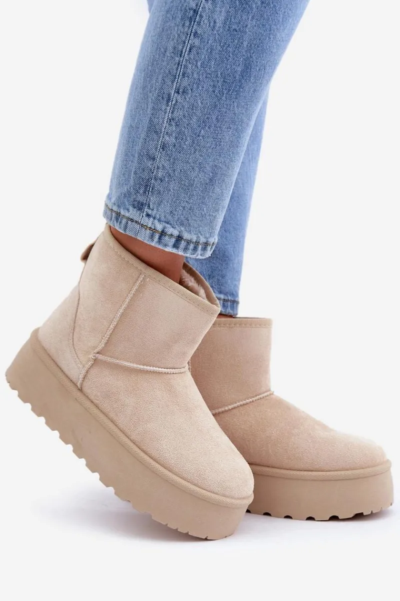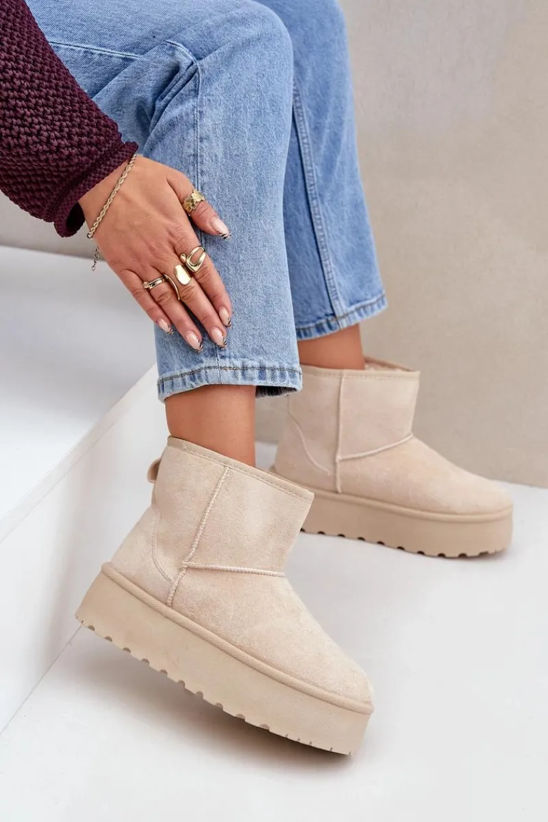 Damskie śniegowce wykonane z eko zamszu. Zamontowane na platformie. Wnętrze wyłożone futerkiem, dzięki czemu są doskonałym wyborem na chłodne dni, zapewniając ochronę przed zimnem. Ich stylowy fason pozwala na łączenie ich z różnymi stylizacjami, dodając każdemu zimowemu outfitowi unikalnego charakteru! Przy wyborze rozmiaru prosimy sugerować się tabelą rozmiarów.