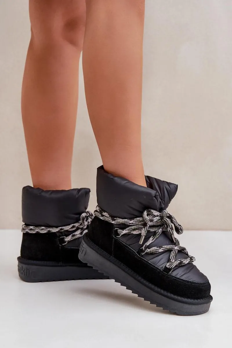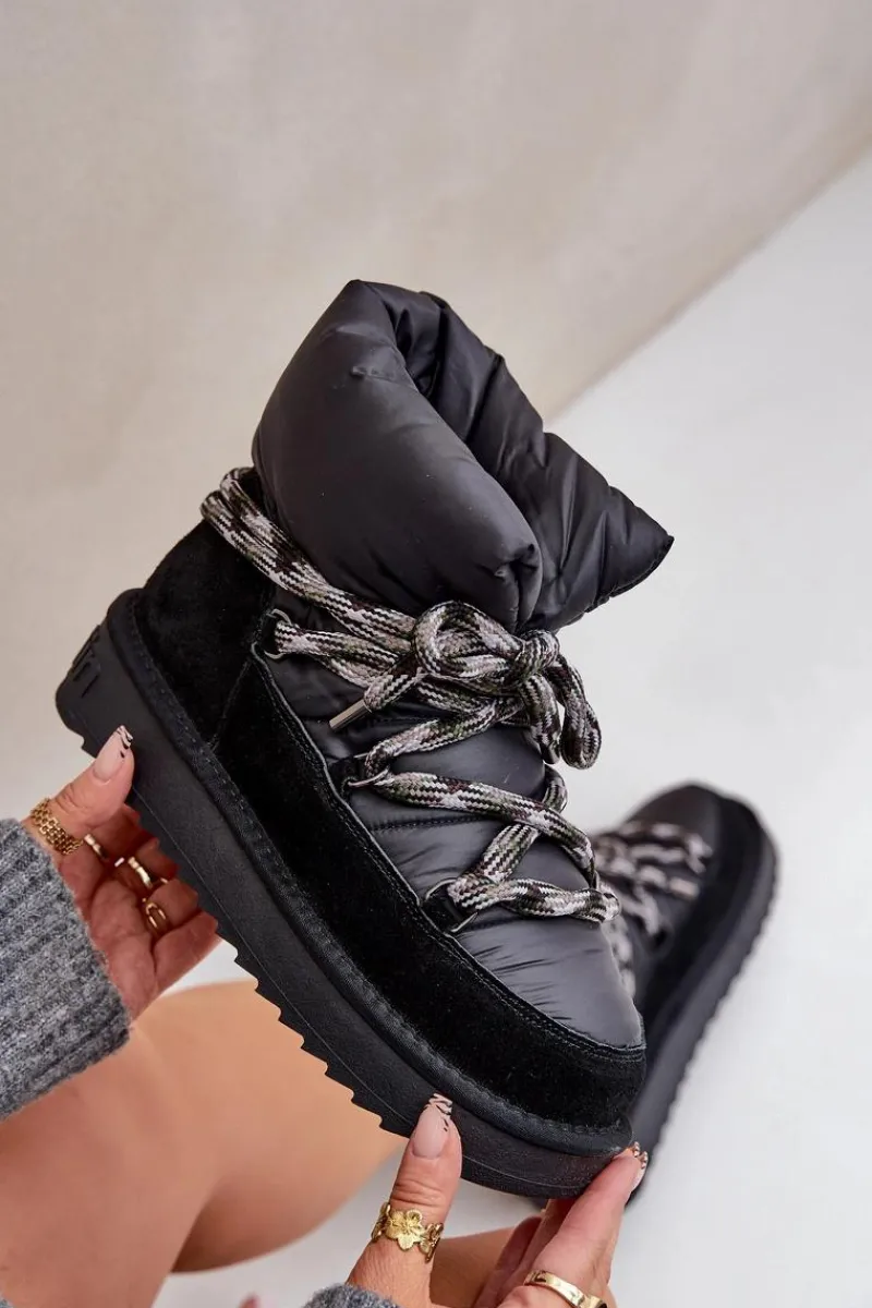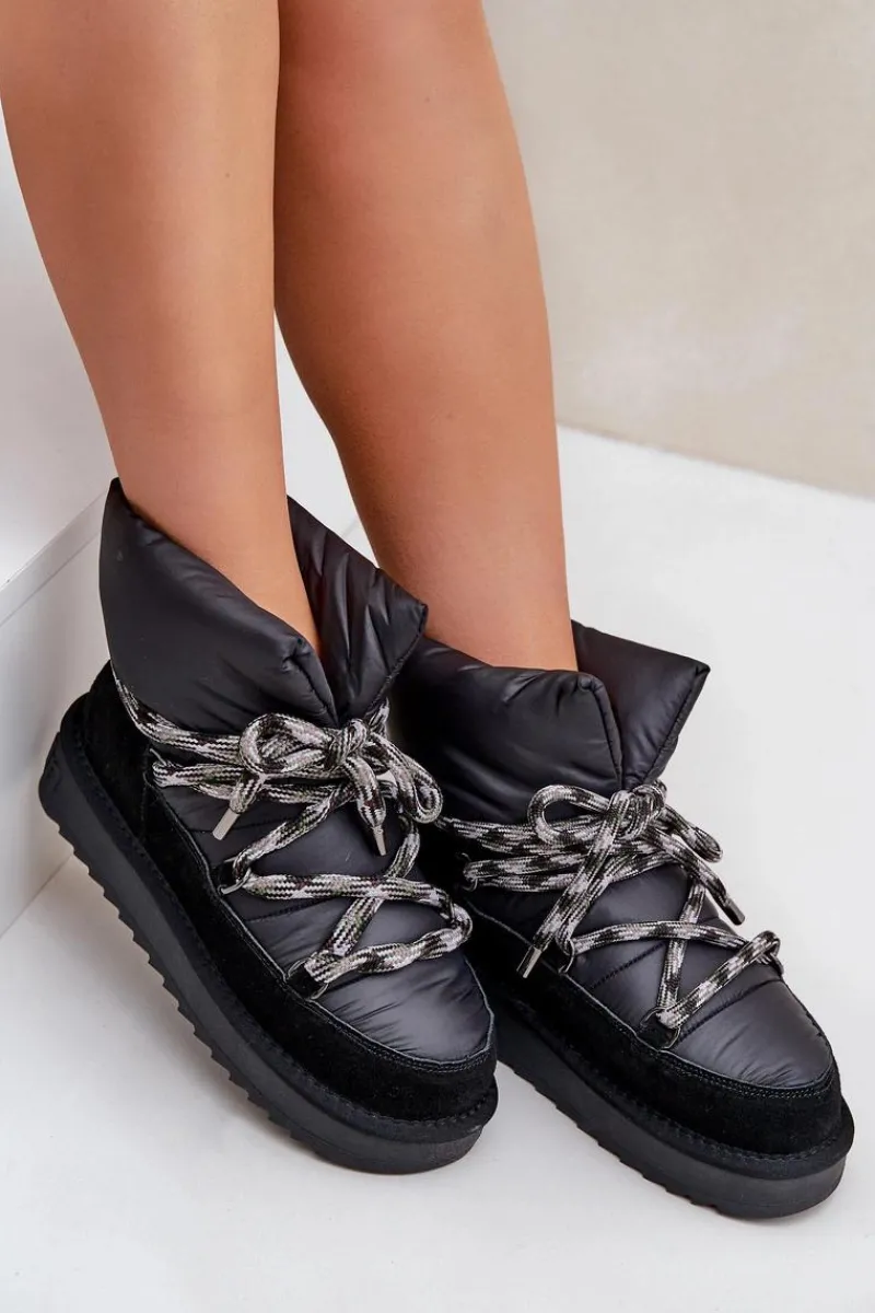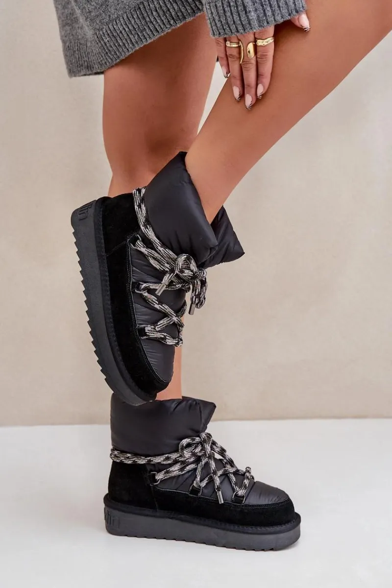 Damskie śniegowce wykonane z połączenia wysokiej jakości tkaniny syntetycznej i naturalnego zamszu. Osadzone na podeszwie z gumowego tworzywa. Prosty krój z syntetyczną podszewką zapewniającą doskonałe ciepło. Grube sznurowanie zapewni doskonałe dopasowanie do stopy. Koniecznie powinnaś je mieć w swojej zimowej garderobie! Przy wyborze rozmiaru prosimy sugerować się tabelą rozmiarów.