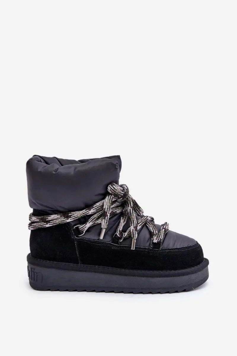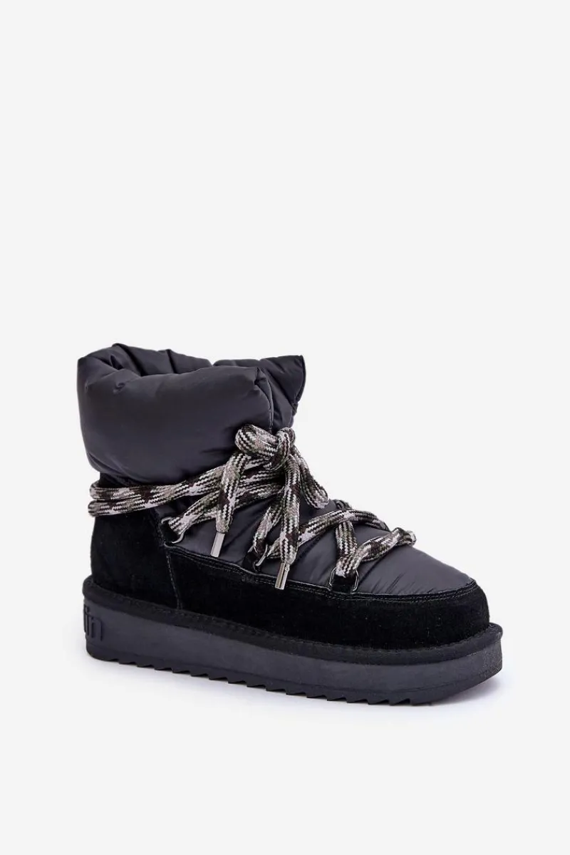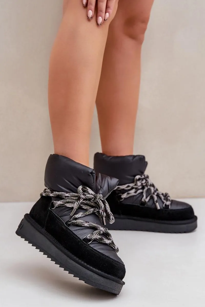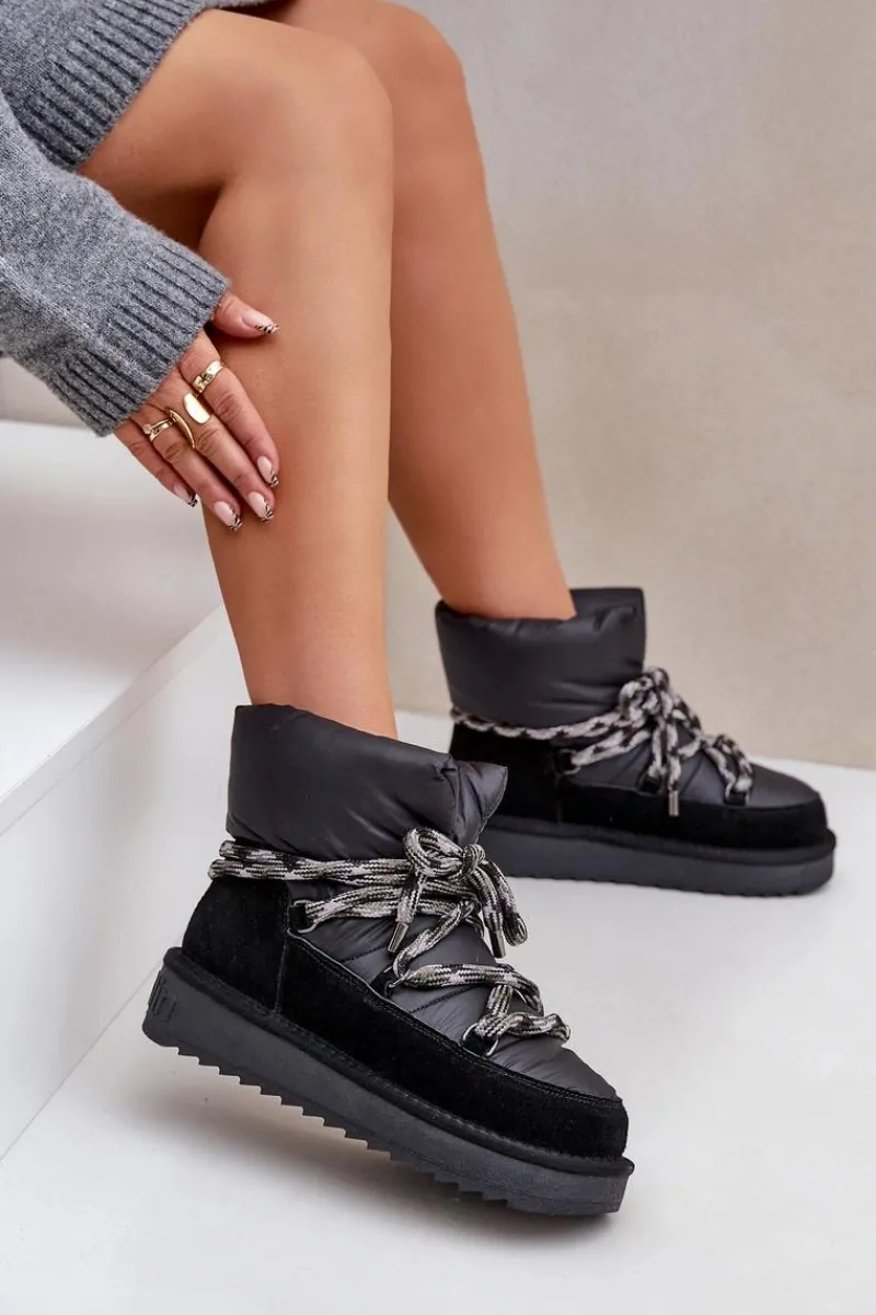 Damskie śniegowce wykonane z połączenia wysokiej jakości tkaniny syntetycznej i naturalnego zamszu. Osadzone na podeszwie z gumowego tworzywa. Prosty krój z syntetyczną podszewką zapewniającą doskonałe ciepło. Grube sznurowanie zapewni doskonałe dopasowanie do stopy. Koniecznie powinnaś je mieć w swojej zimowej garderobie! Przy wyborze rozmiaru prosimy sugerować się tabelą rozmiarów.