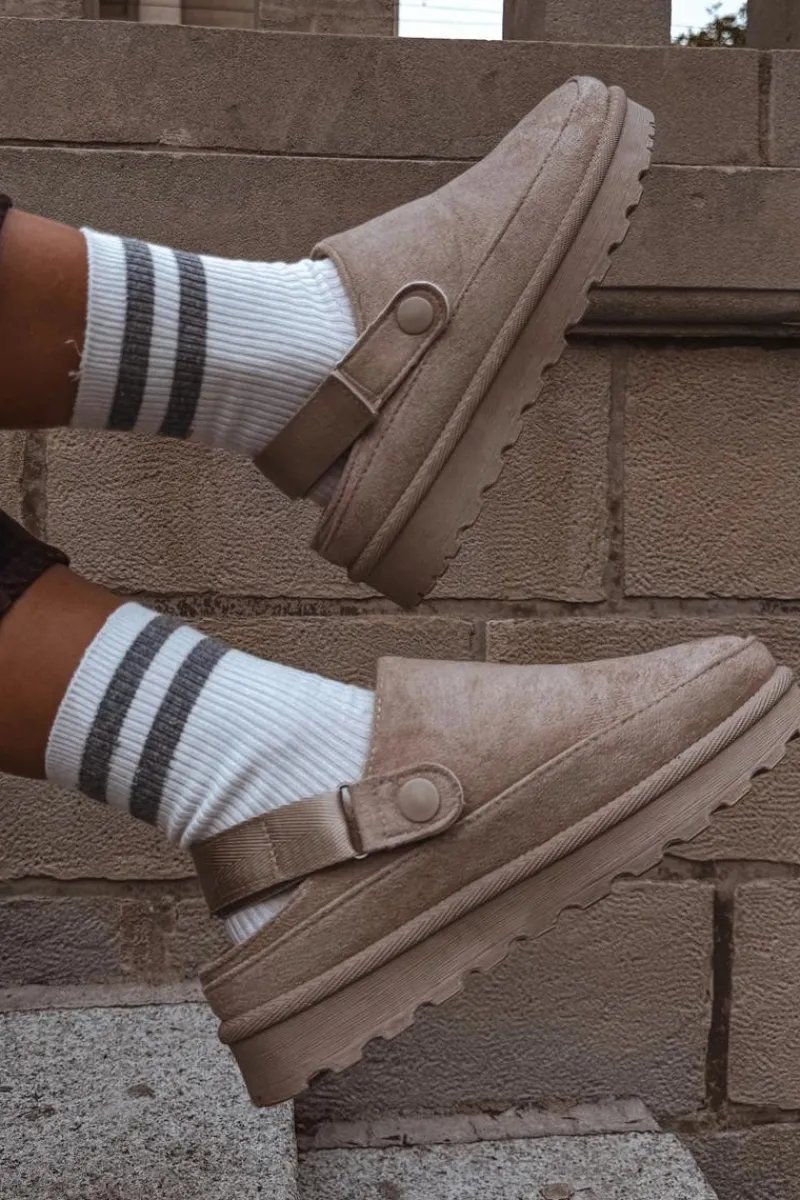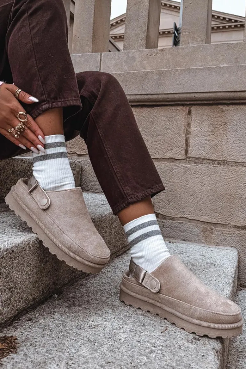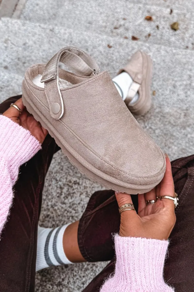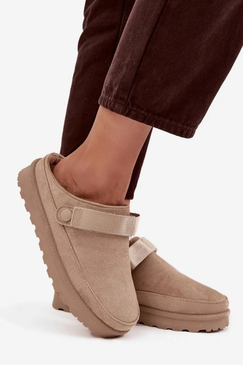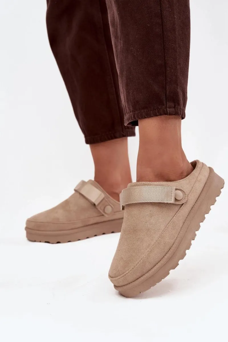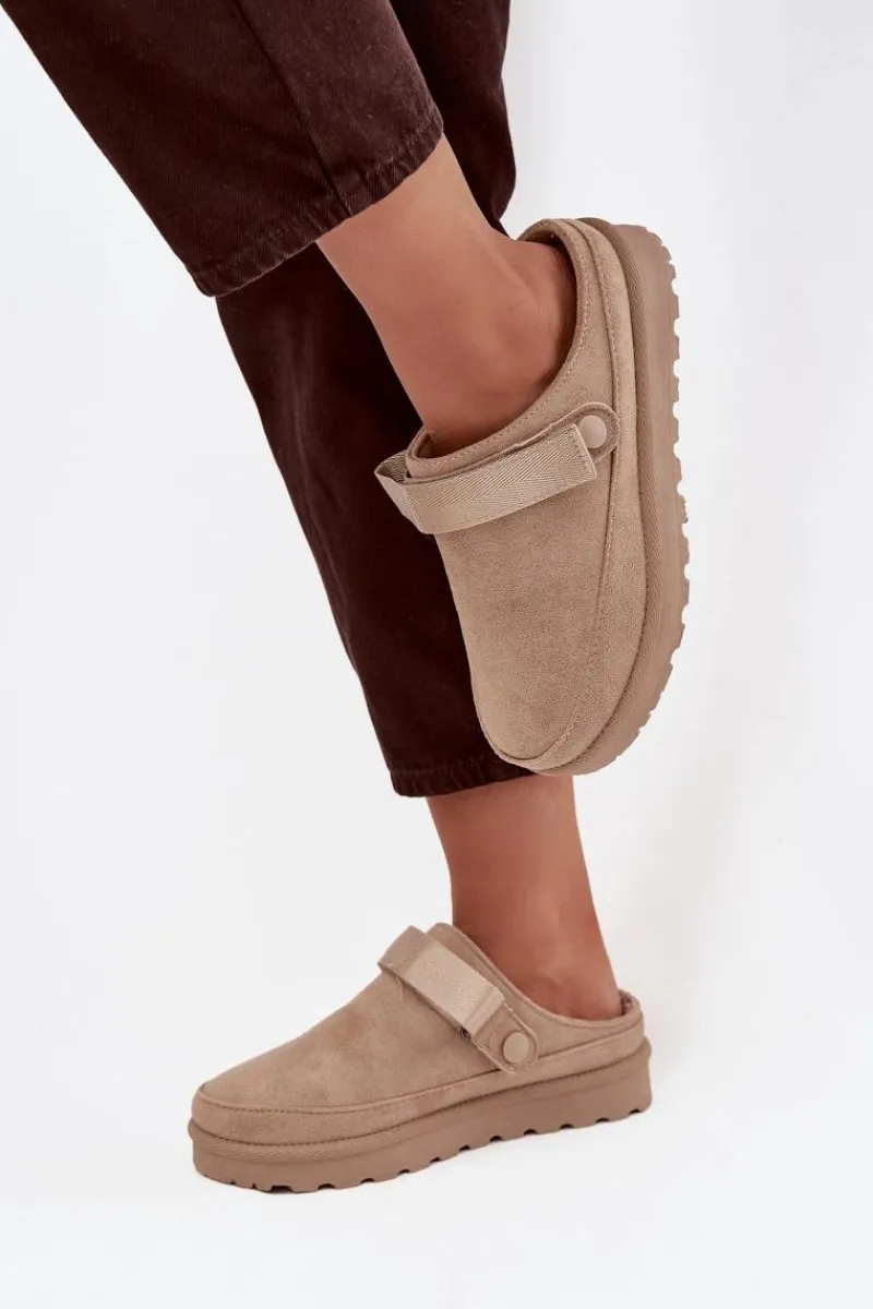 Damskie klapki wykonane z eko zamszu. Osadzone na platformie. Wnętrze ocieplone przyjemnym futerkiem, co zapewnia komfort w chłodniejsze dni. Dodatkowo posiadają ruchomy pasek zapinany na rzep, który stabilizuje piętę i umożliwia idealne dopasowanie. Idealne na co dzień, łączą styl z funkcjonalnością. Przy wyborze rozmiaru prosimy sugerować się tabelą rozmiarów.