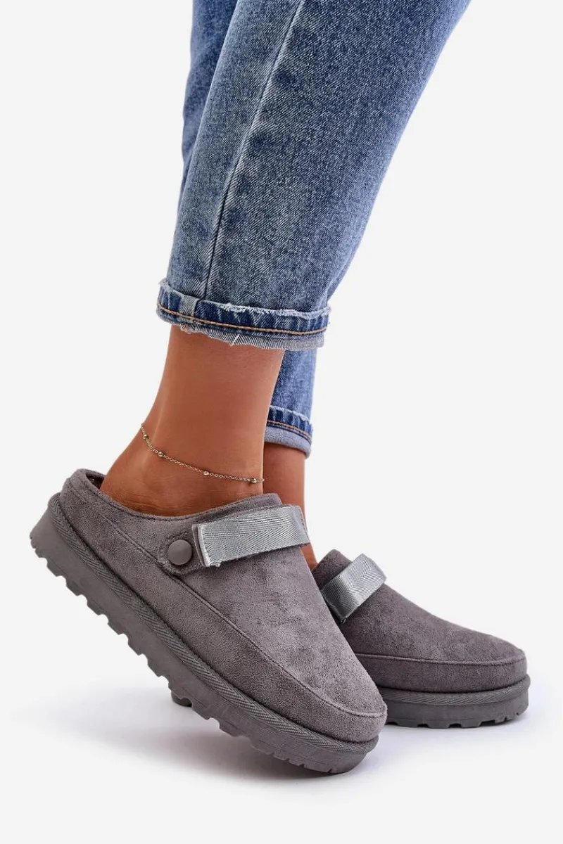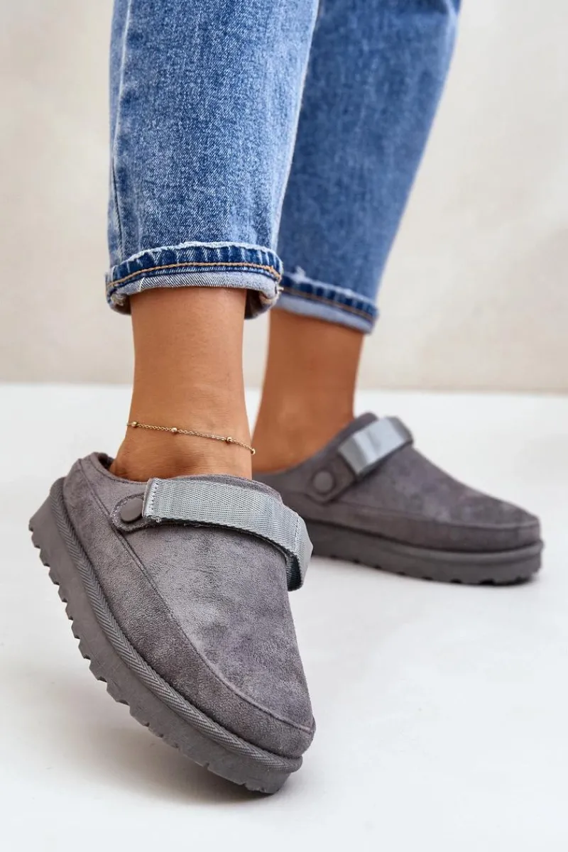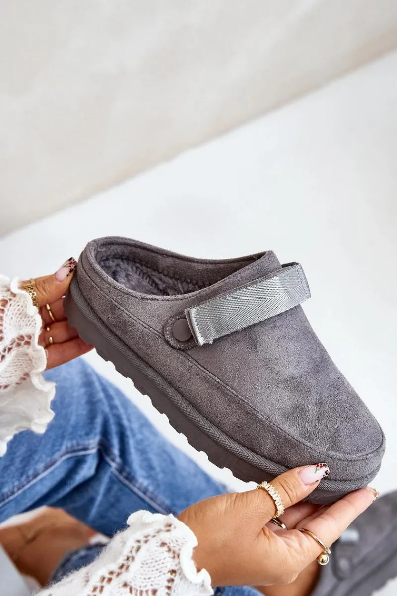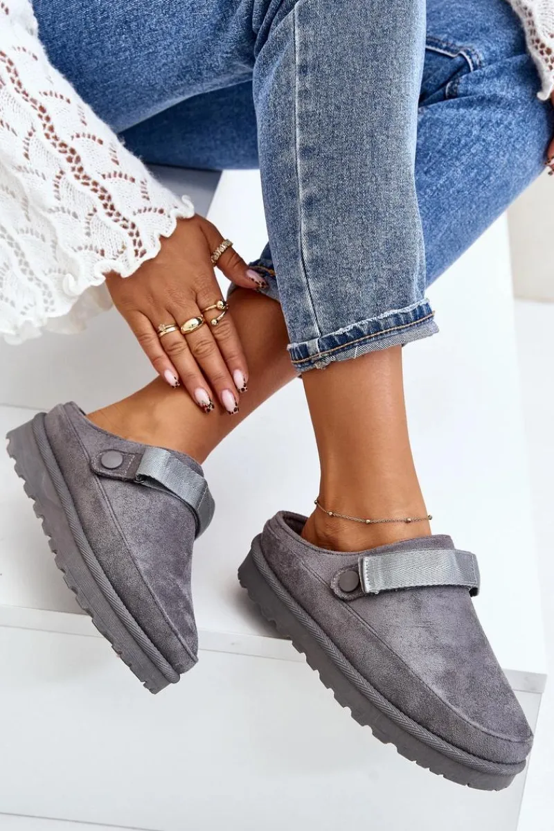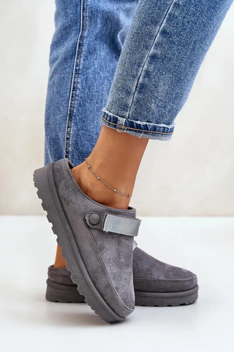 Damskie klapki wykonane z eko zamszu. Osadzone na platformie. Wnętrze ocieplone przyjemnym futerkiem, co zapewnia komfort w chłodniejsze dni. Dodatkowo posiadają ruchomy pasek zapinany na rzep, który stabilizuje piętę i umożliwia idealne dopasowanie. Idealne na co dzień, łączą styl z funkcjonalnością. Przy wyborze rozmiaru prosimy sugerować się tabelą rozmiarów.