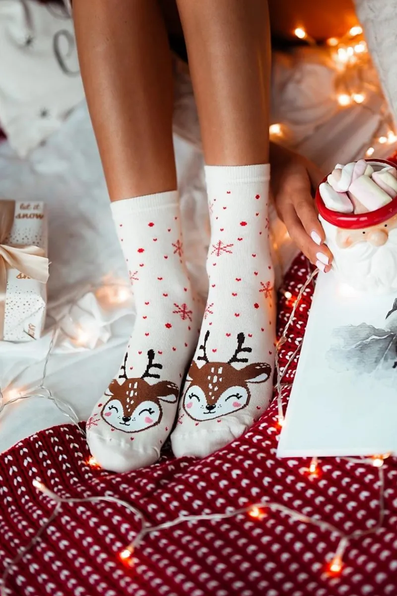 Świąteczne Skarpetki Damskie Reniferek Ecru Skarpetki|Skarpetki