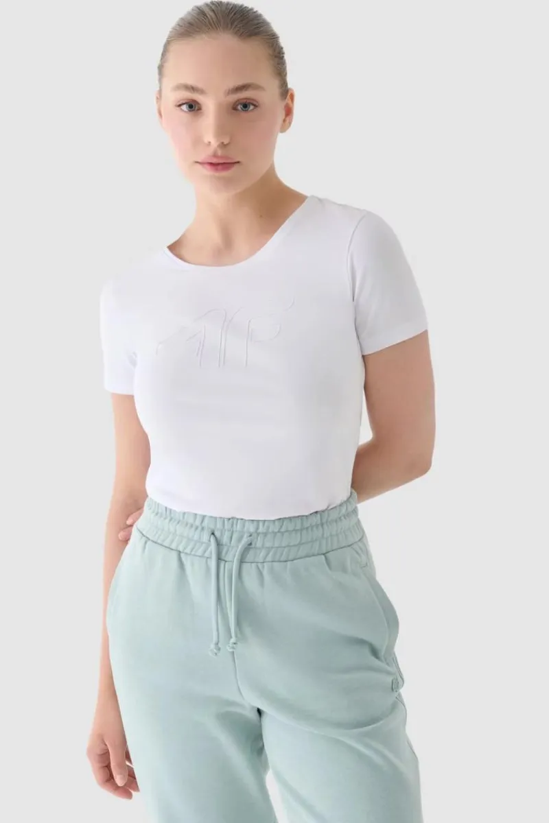 T-shirt damski idealnie sprawdzi się jako element zarówno casualowych, jak i sportowych stylizacji na co dzień. Posiada dopasowany krój slim, który przylega do ciała oraz standardową długość sięgającą do linii bioder. Splot single jersey z jednostronną gładką powierzchnią sprawia, że koszulka jest elastyczna i komfortowa w noszeniu. Koszulka z nadrukiem damska dzięki gramaturze 180 gsm jest miękka w dotyku i dobrze się układa. Nie prześwituje oraz zapewnia trwałość i wygodę podczas całorocznego noszenia. T-shirt 4F damski jest wykonany w 95% z bawełny, dzięki czemu jest miękki, trwały i przyjemny w dotyku. Dzięki dodatkowi elastanu (5%) jest rozciągliwa i wygodnie układa się na sylwetce. Okrągły dekolt jest zakończony lekkim ribowaniem. Z przodu widoczny nadruk „4F” Materiał główny: Bawełna 95%, Elastan 5%