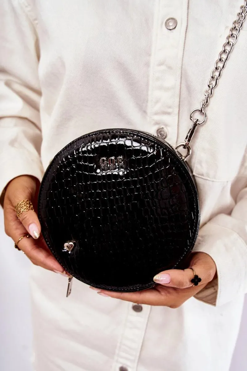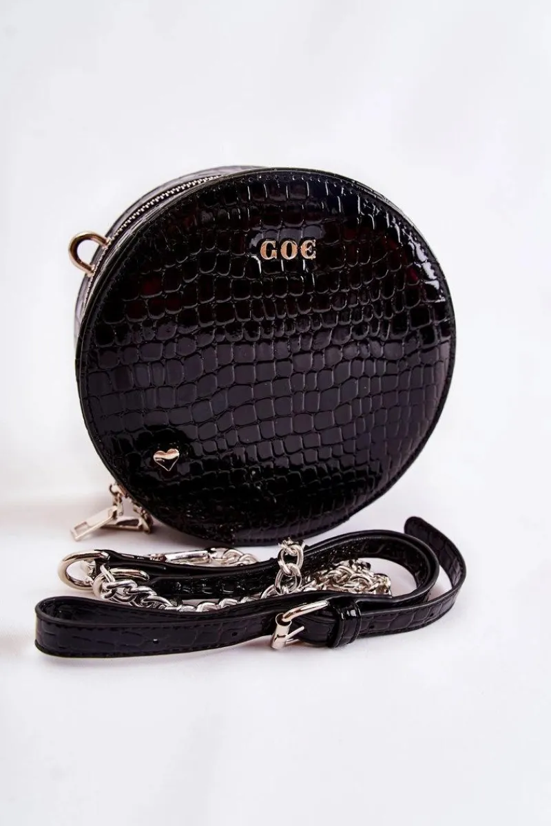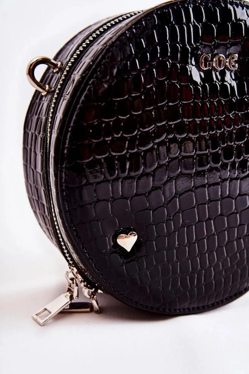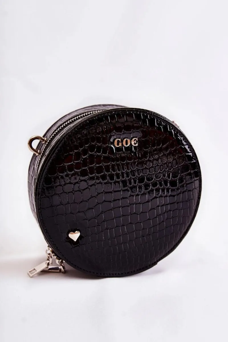 Piękna torebka – kuferek od marki GOE! Wykonana z wysokiej jakości materiału. Na przodzie znajduje się logo marki GOE oraz ozdobny emblemat w postaci serduszka. Torebka posiada jedną komorę, która jest zamykana na zamek błyskawiczny. W środku znajdują się jedna otwarta kieszonka oraz jedna zamykana na suwak. Podszewka wykonana z tkaniny w ozdobny wzór. Torebka posiada jeden regulowany, odpinany pasek.