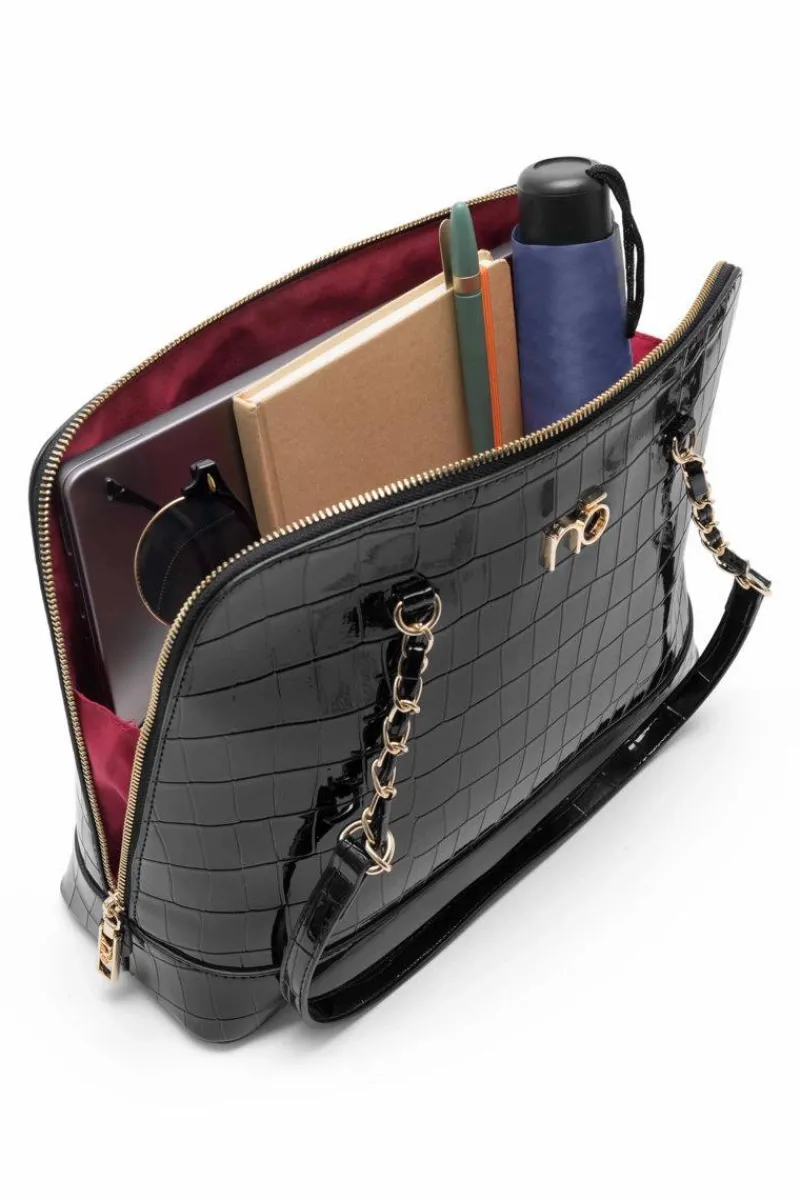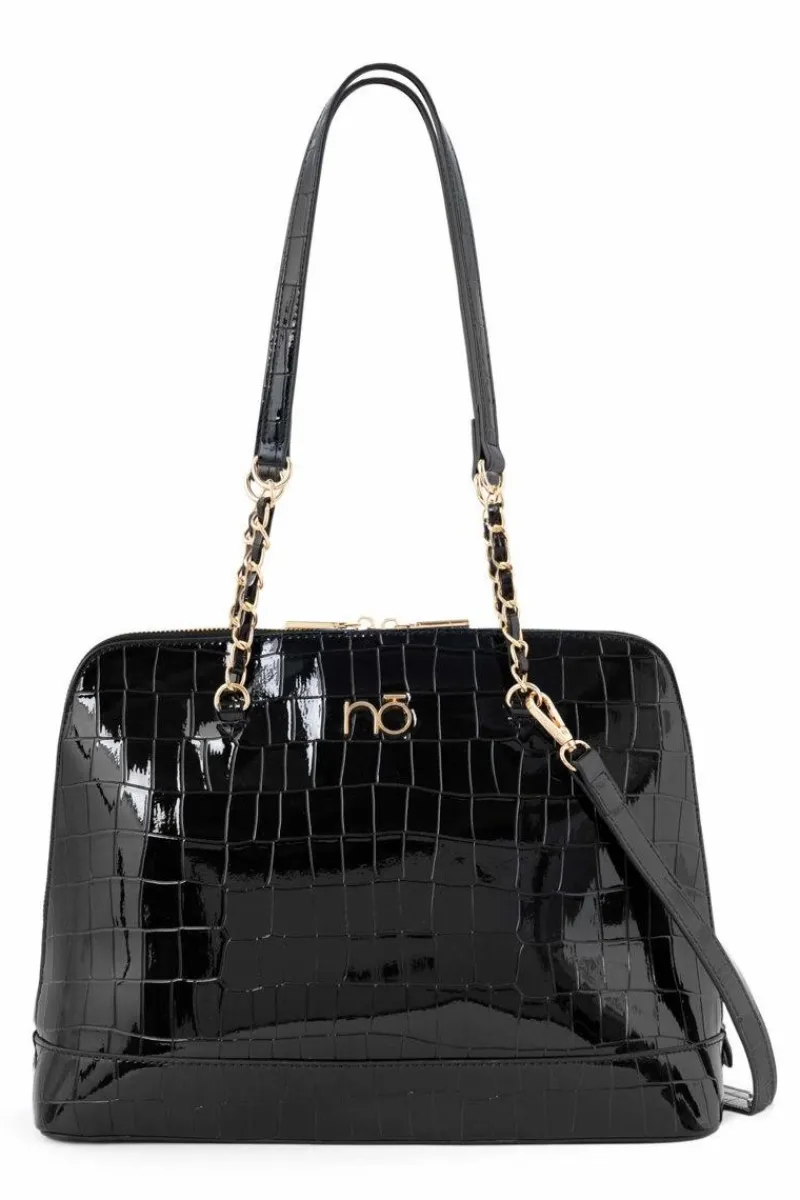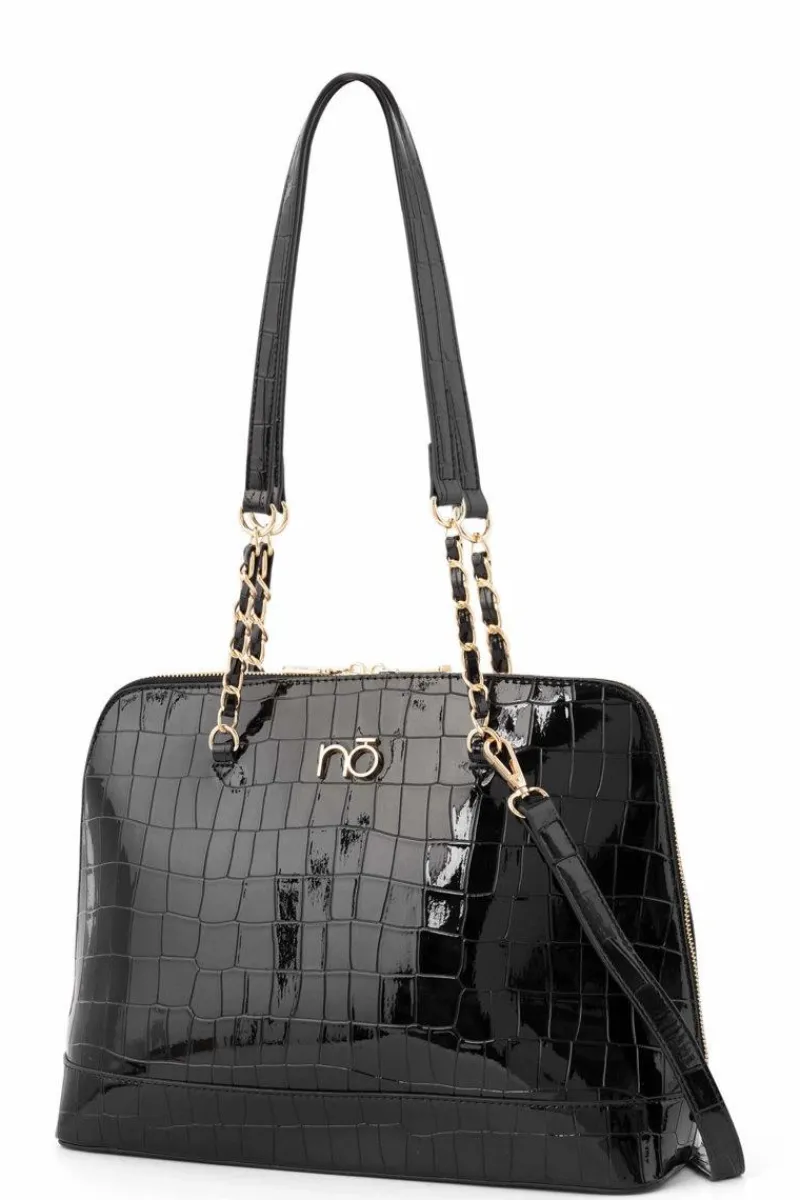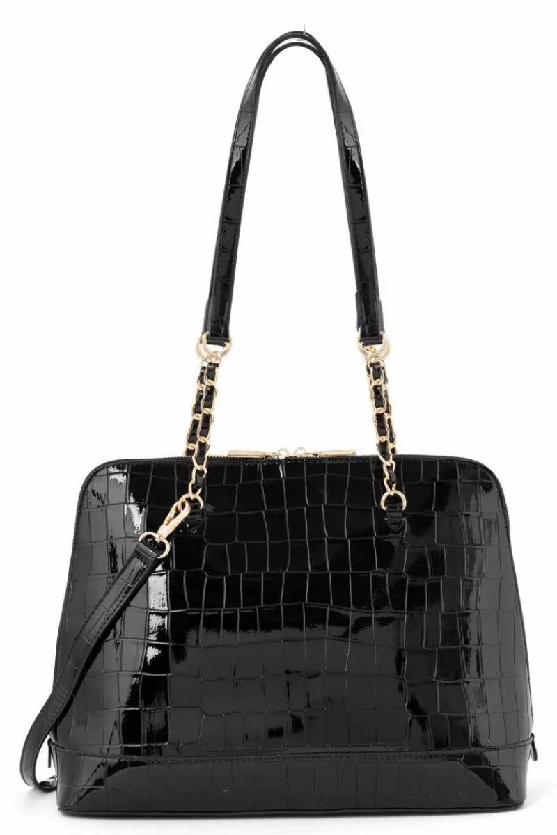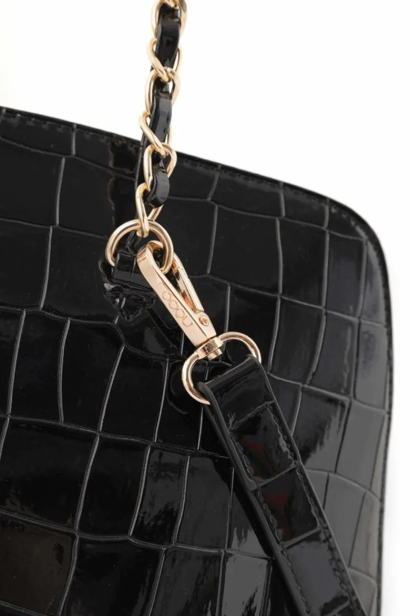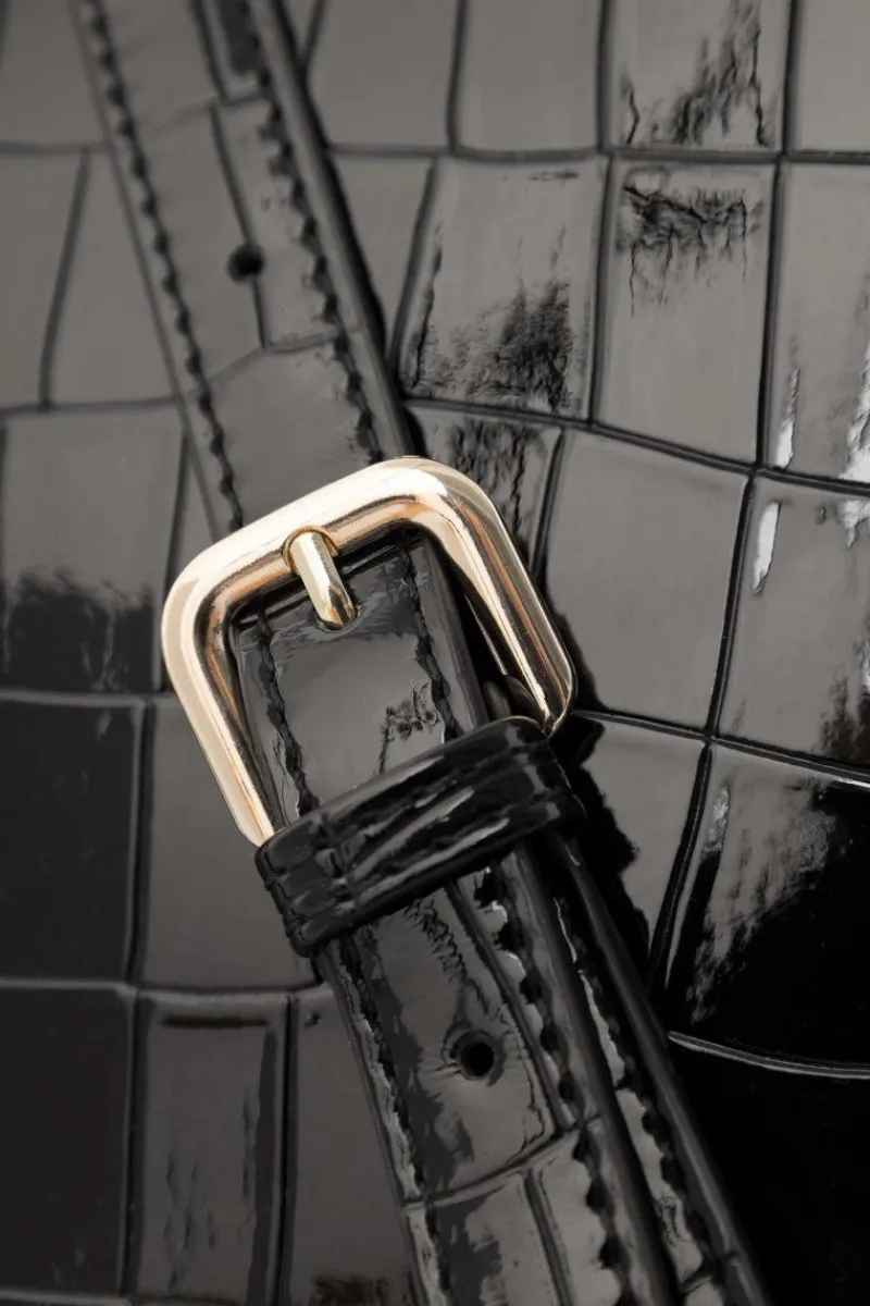 Duża torebka na ramię została wykonana w 100% z poliuretanu, natomiast podszewka w 100% z poliestru. Torebka ma jedną komorę zamykaną na suwak, w której znajdują się dwie otwarte kieszenie oraz jedna zamykana na suwak. Posiada ozdobne tłoczenie imitujące krokodylą skórę oraz logo na przodzie. Lakierowany materiał przyciąga wzrok oraz nadaje niepowtarzalny charakter.