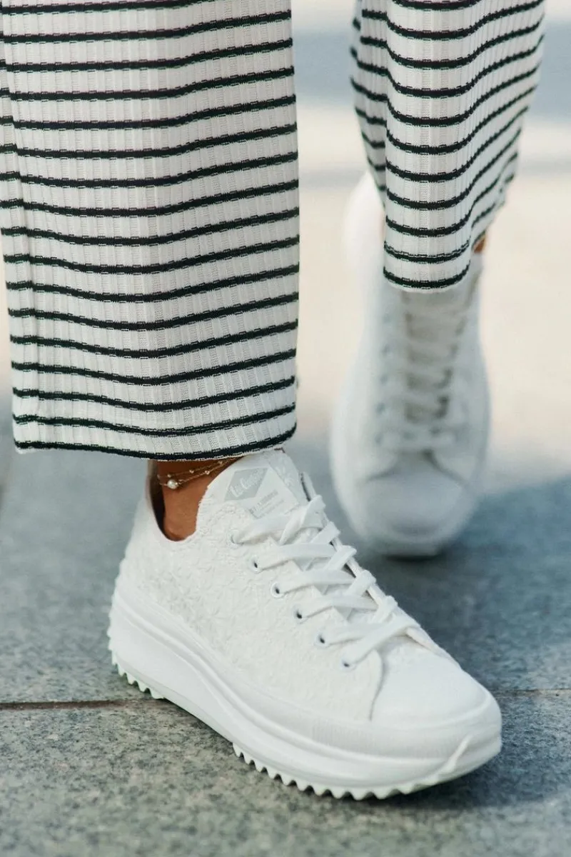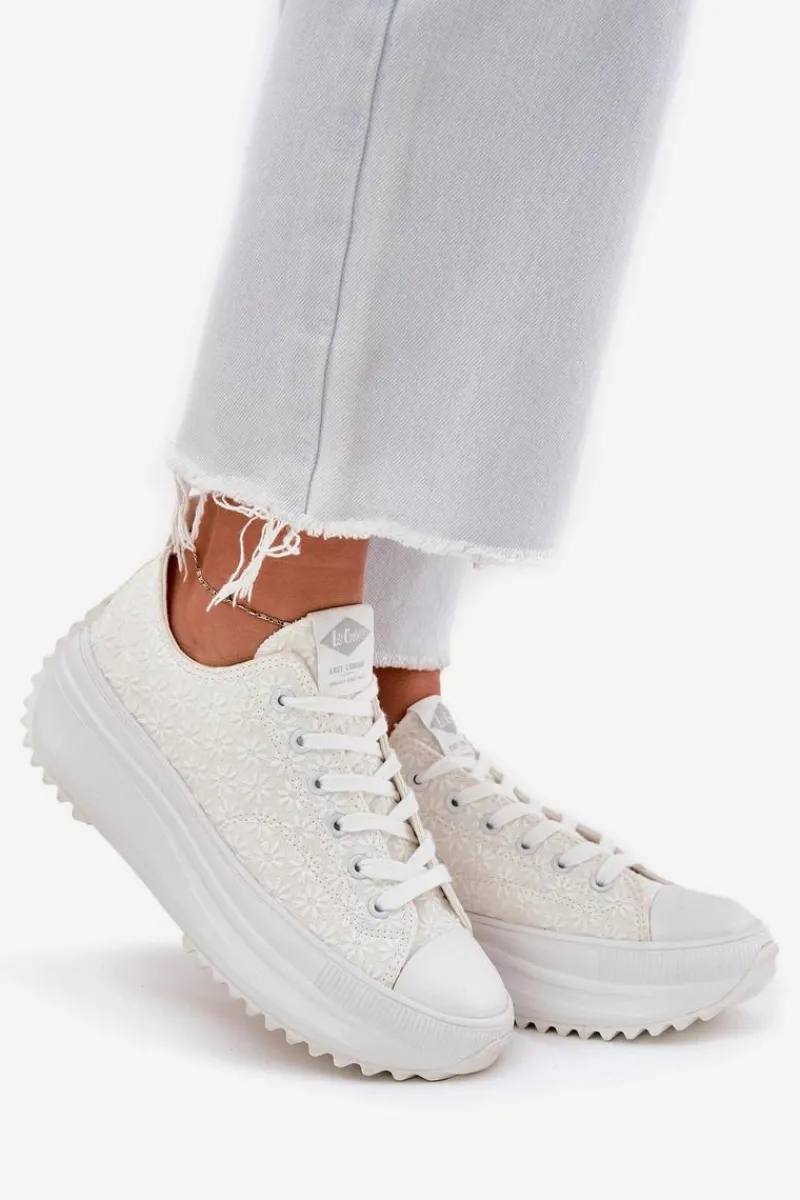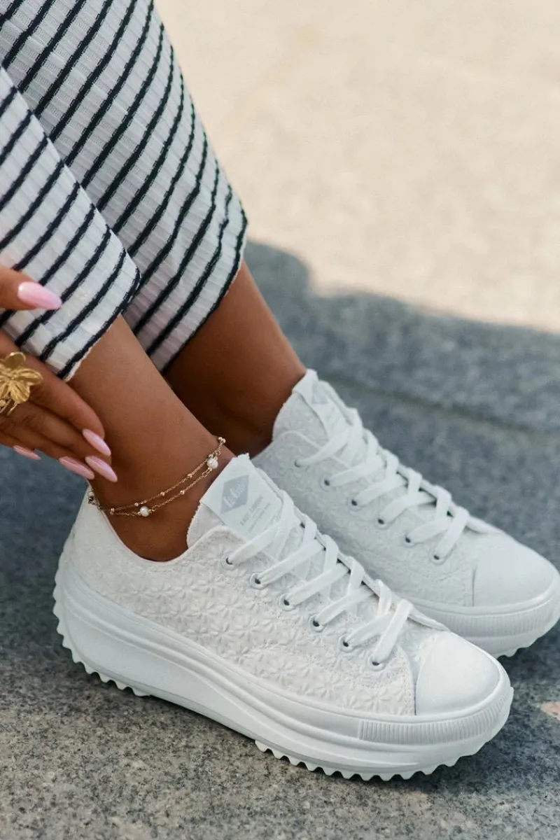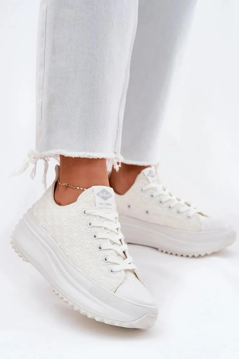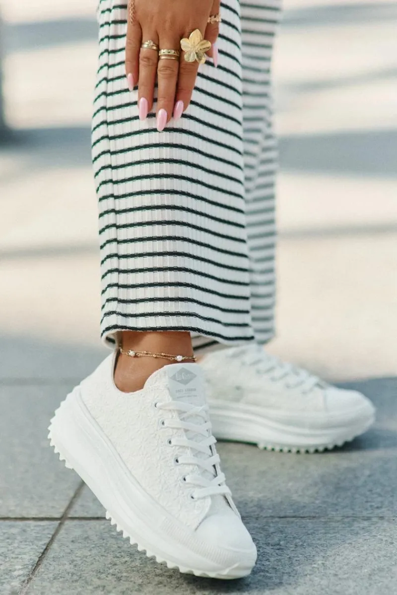 Damskie trampki od marki Lee Cooper to połączenie stylu i wygody. Osadzone na masywnej platformie, zapewniają stabilność oraz lekkość przez cały dzień. Cholewka ozdobiona subtelnym haftem nadaje im wyjątkowego charakteru, a klasyczne sznurowanie umożliwia idealne dopasowanie do stopy. Zaokrąglone noski gwarantują komfort przy każdym kroku. Te trampki doskonale pasują do casualowych oraz tych bardziej eleganckich stylizacji, dodając im modnego i oryginalnego akcentu. Przy wyborze rozmiaru prosimy sugerować się poniższą tabelą rozmiarów.