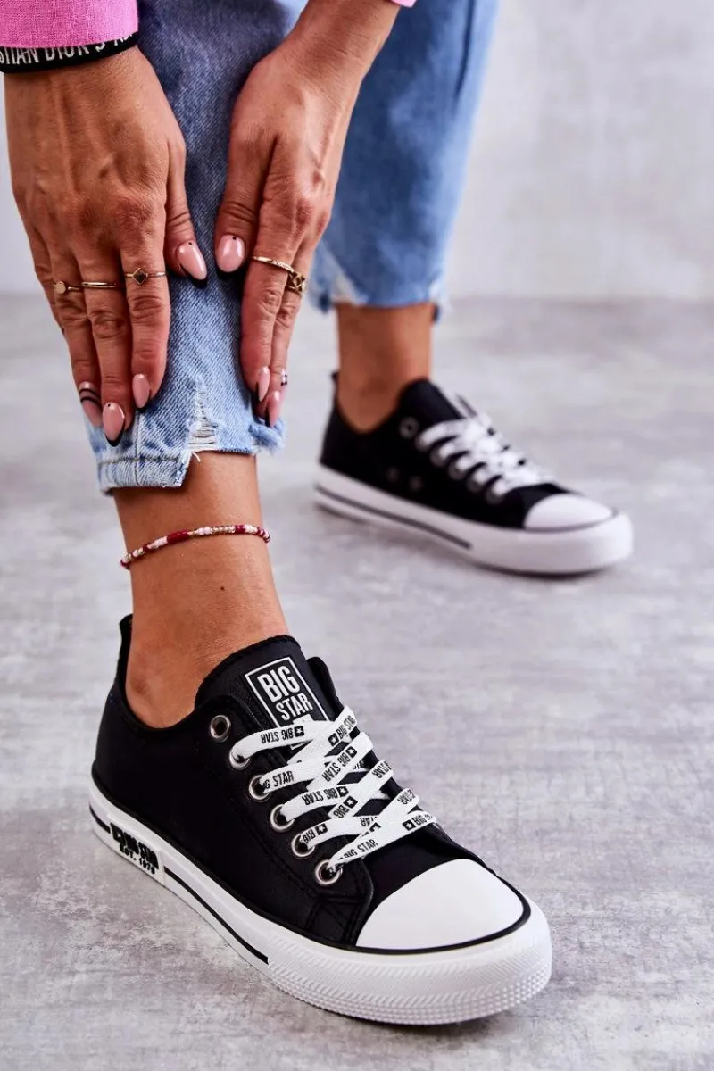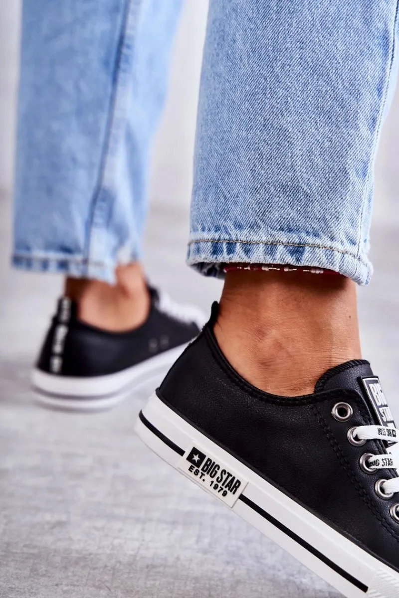 Ponadczasowe trampki damskie marki Big Star zostały wykonane z eko skóry. Posiadają gumowy, wzmacniany nosek. Model charakteryzuje się logowanymi sznurowadłami. Podeszwa wraz z platformą wykonane z gumowego tworzywa, dzięki którym model ten jest antypoślizgowy. Wkładka materiałowa. Klasyczne trampki z pewnością świetnie będą prezentować się w wielu stylizacjach. Przy wyborze rozmiaru prosimy sugerować się tabelą rozmiarów.
