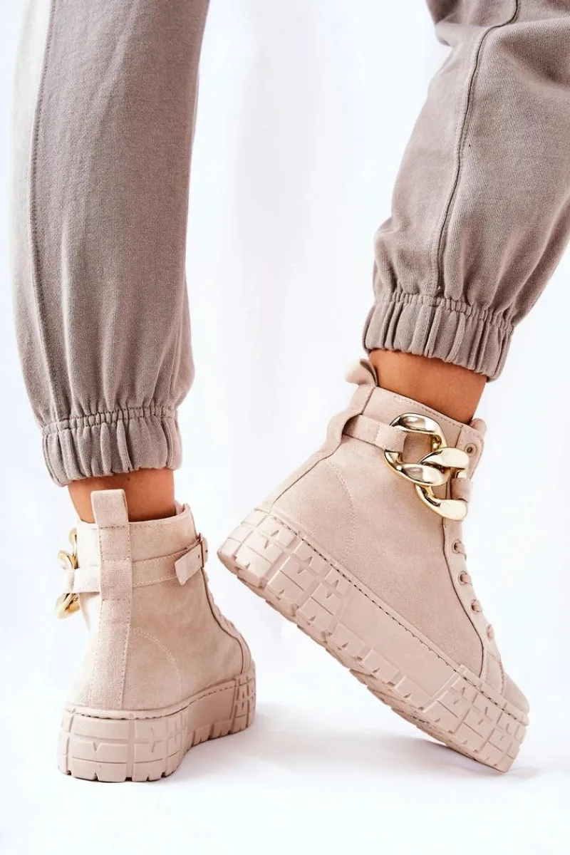 Buty zostały wykonane z zamszowej eko skóry. Wysokie trampki posiadają ozdobny łańcuch na pasku, który jest zapinany na sprzączkę. Można go także całkowicie zdjąć. Buty posiadają wysoką, stabilną platformę. Wśrodku znajduje się materiałowa wkładka. Koniecznie sprawdź także pozostałą naszą ofertę trampek na platformie! Przy wyborze rozmiaru prosimy sugerować się tabelą rozmiarów.
