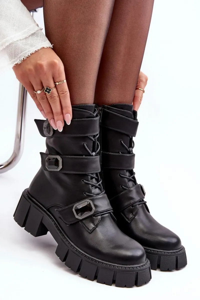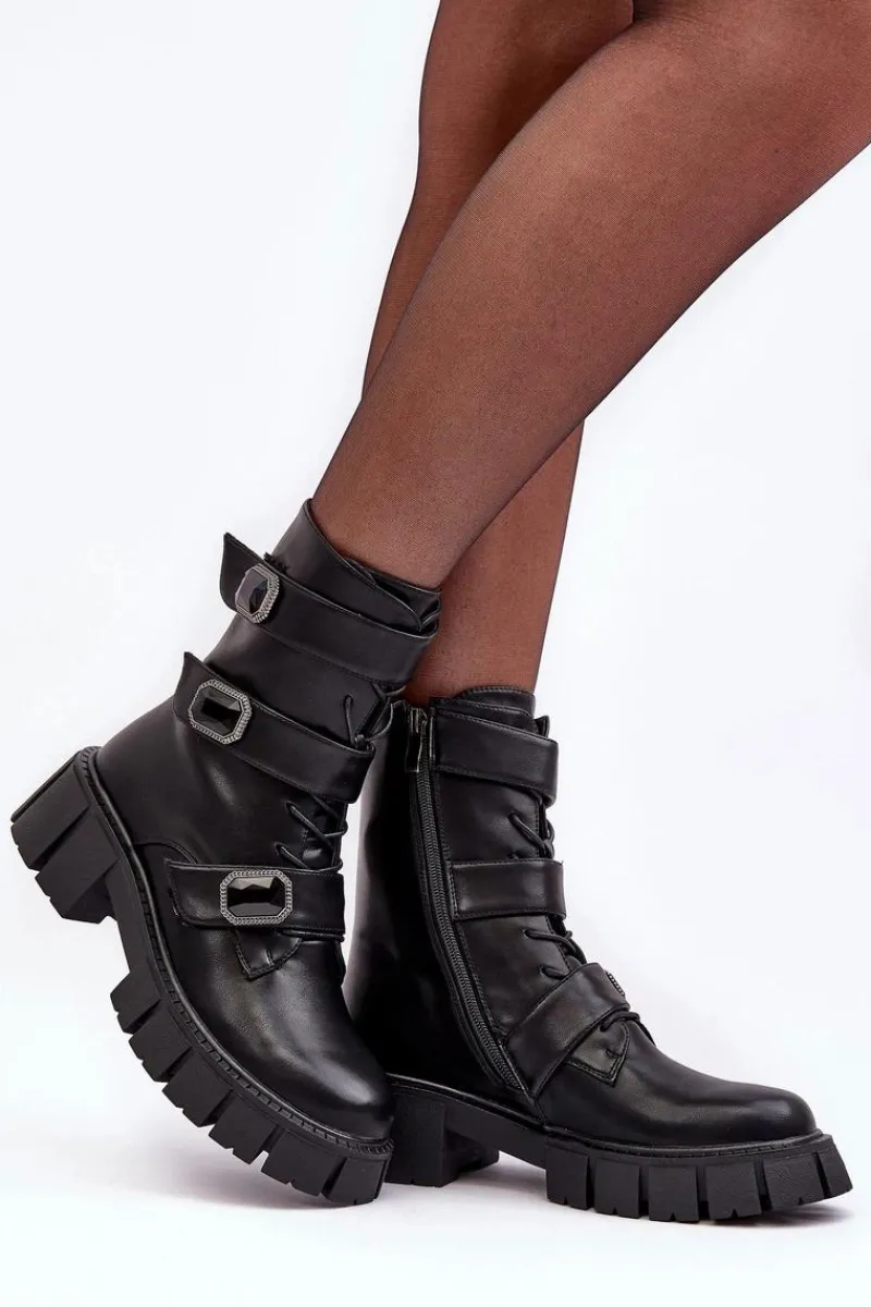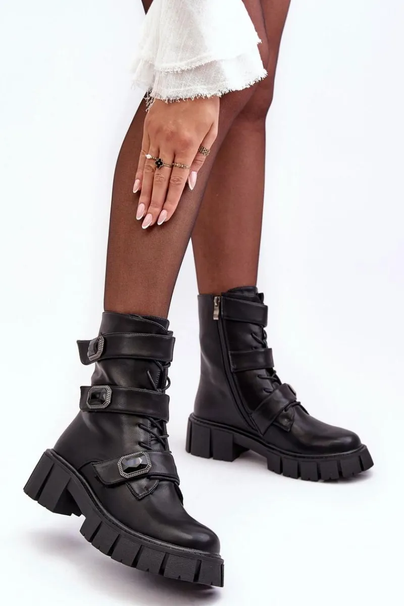 Damskie botki w stylu workerów zostały wykonane z wysokiej jakości eko skóry. W środku ocieplone kocem obuwniczym. Osadzone na płaskim obcasie i platformie. Z przodu sznurowanie oraz paski z ozdobami. Noski zaokrąglone. Usztywniony zapiętek. Ten model na pewno wykorzystasz w wielu stylizacjach! Przy wyborze rozmiaru prosimy sugerować się tabelą rozmiarów.