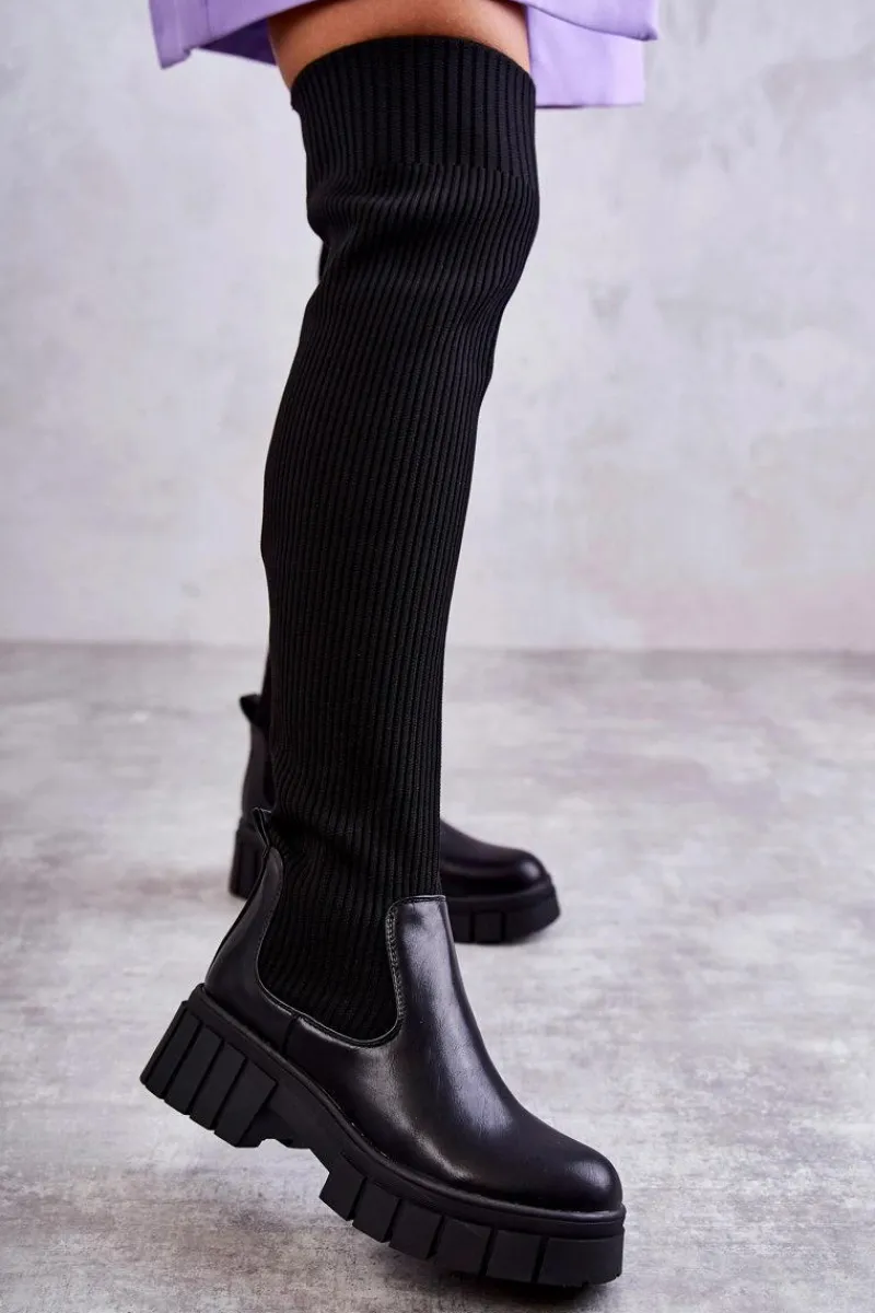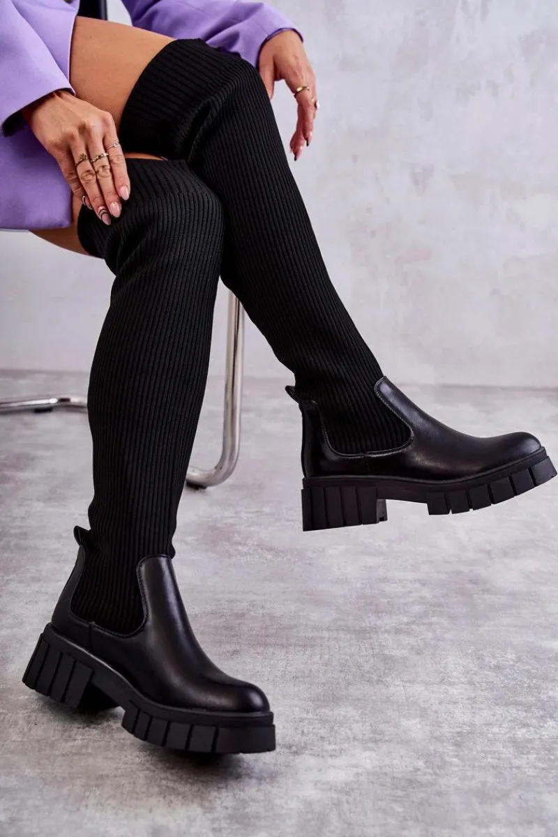 Modne damskie kozaki zostały wykonane z połączenia eko skóry oraz prążkowanej tkaniny. Cholewka za kolano. Model osadzony na płaskim obcasie i delikatnej platformie ze żłobieniami. Buty te posiadają ocieplaną wkładkę. Nosek zaokrąglony. Model wsuwany. Świetnie będą prezentować się z sukienkami lub spódniczkami mini. Przy wyborze rozmiaru prosimy kierować tabelą rozmiarów.