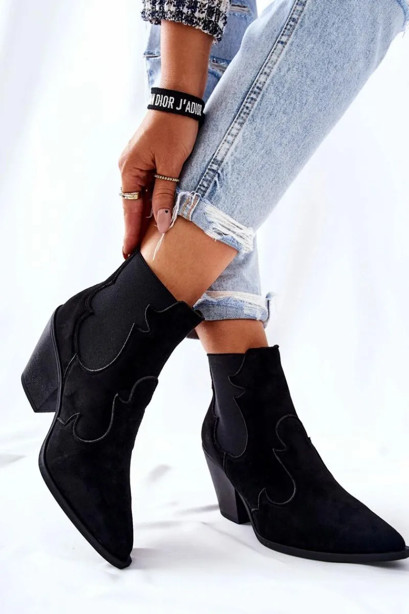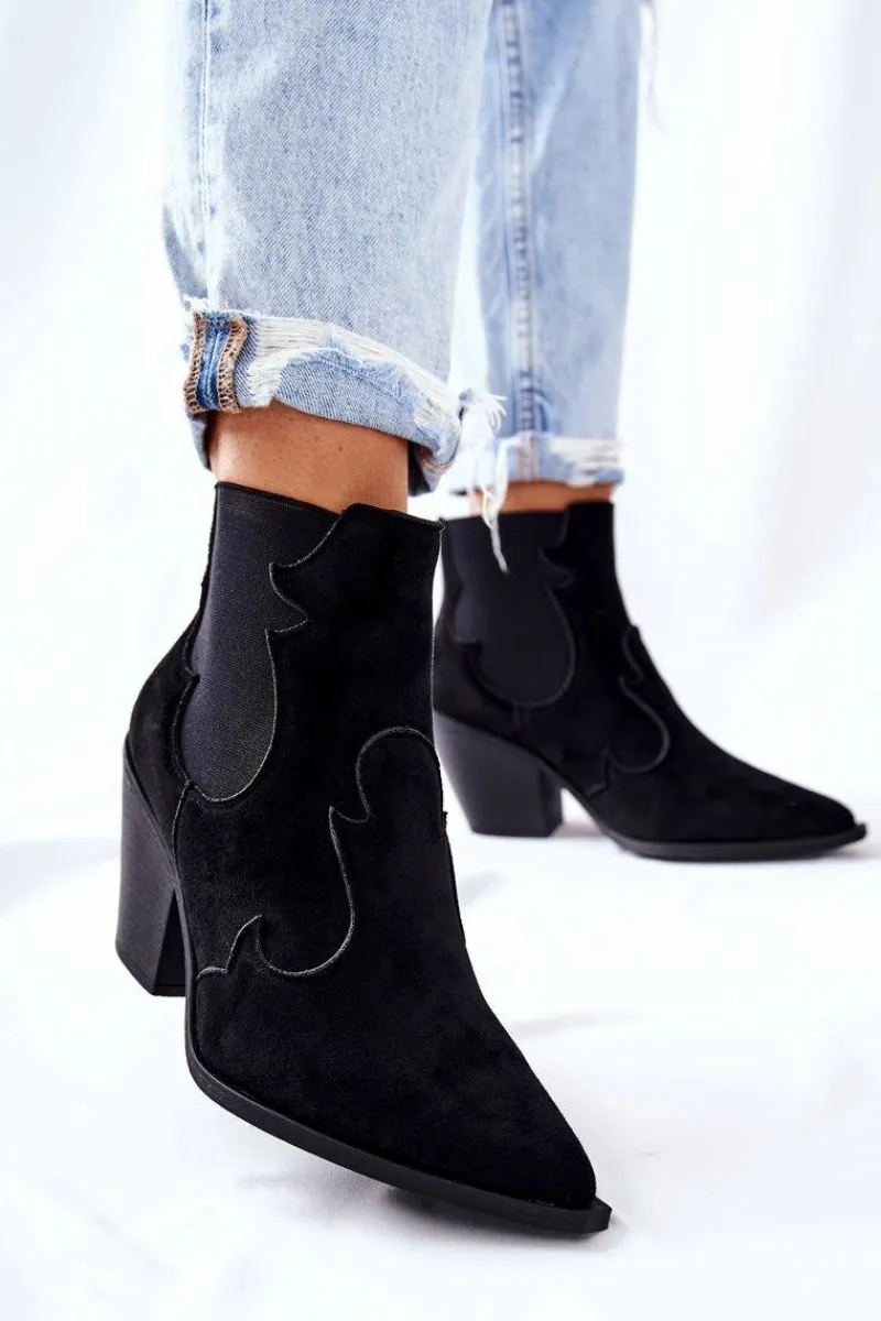 Niezwykły i stylowy model botków! Wykonane z eko zamszu. Posiadają na cholewce z obu stron ściągacze oraz delikatne ocieplenie. Modny wzór w stylu kowbojskim nadaje botkom wyjątkowości! Nosek w szpic. Stabilny obcas. Skorzystaj z oferty już dziś i kup zanim znikną! Przy wyborze rozmiaru prosimy sugerować się tabelą rozmiarów.