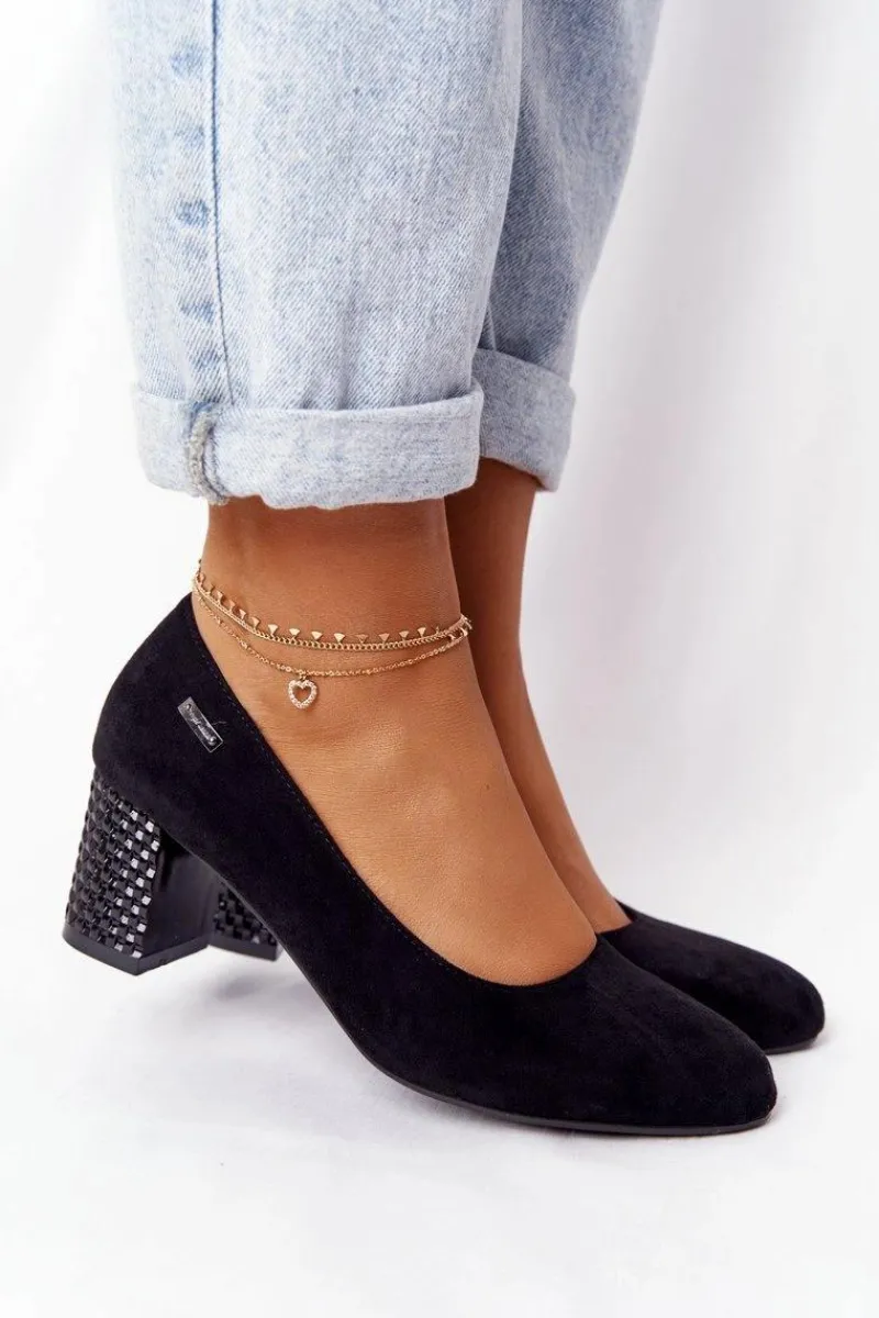 Zamszowe Czółenka Na Karbowanym Słupku Sergio Leone Czarne Damskie Czółenka Zamszowe|Czółenka Na Słupku