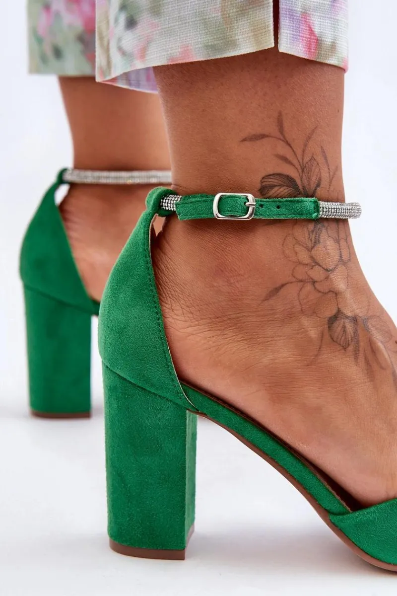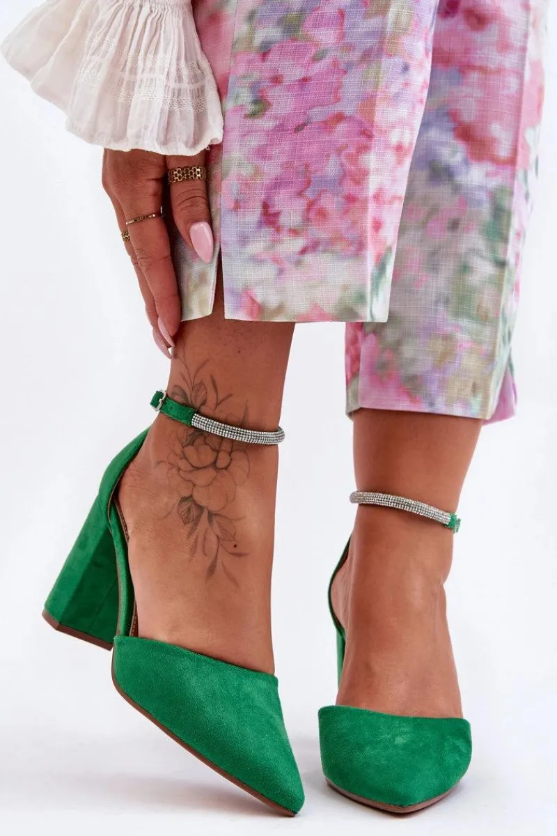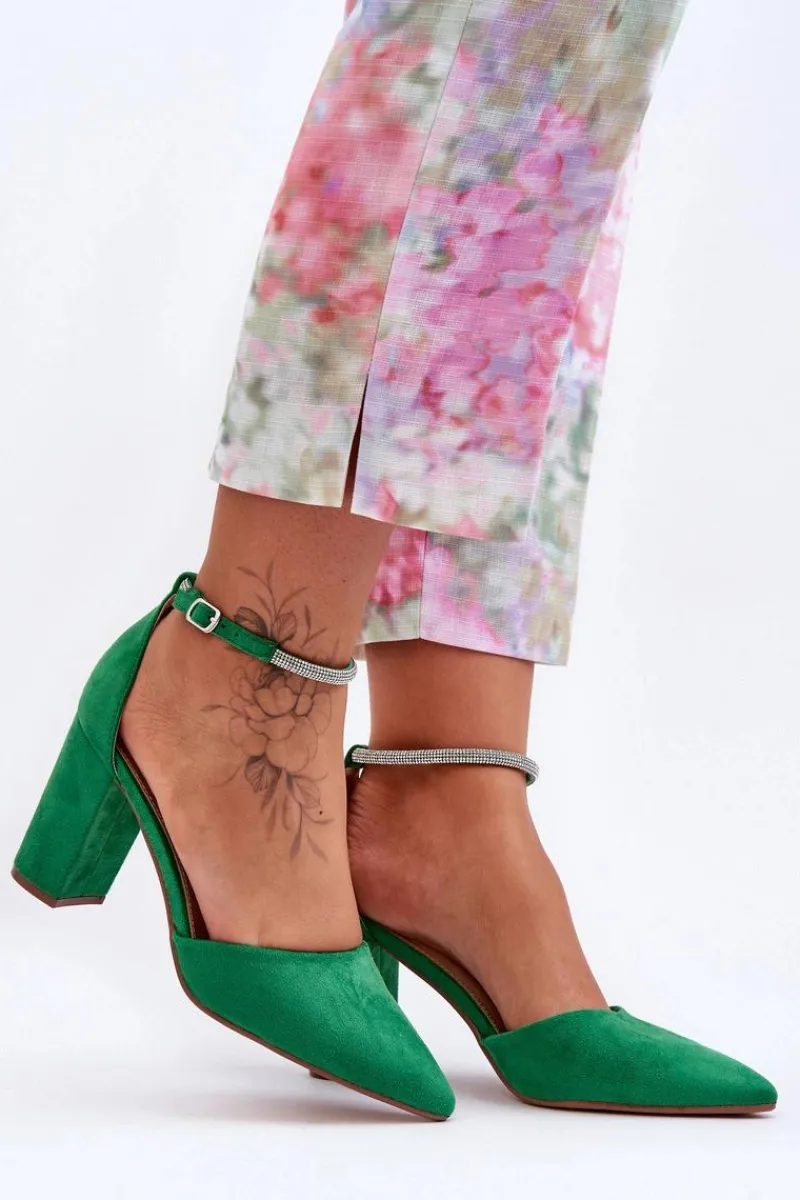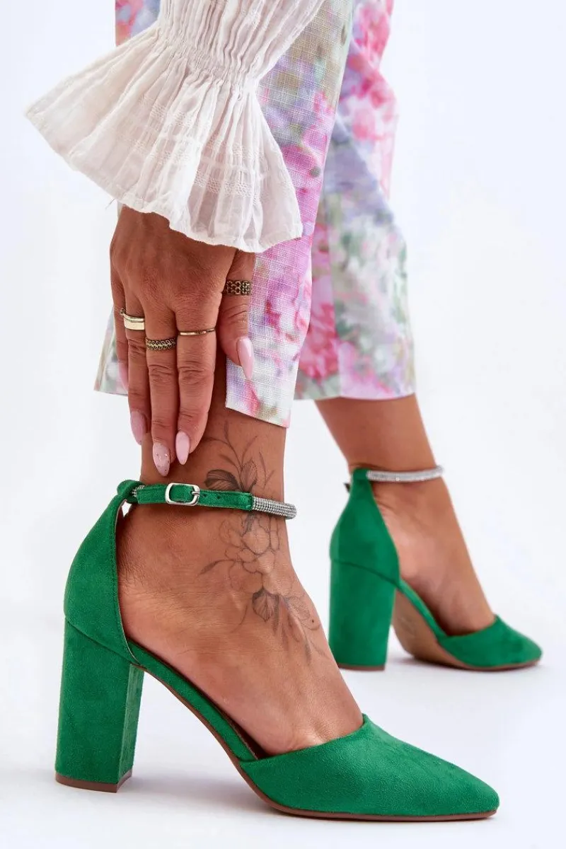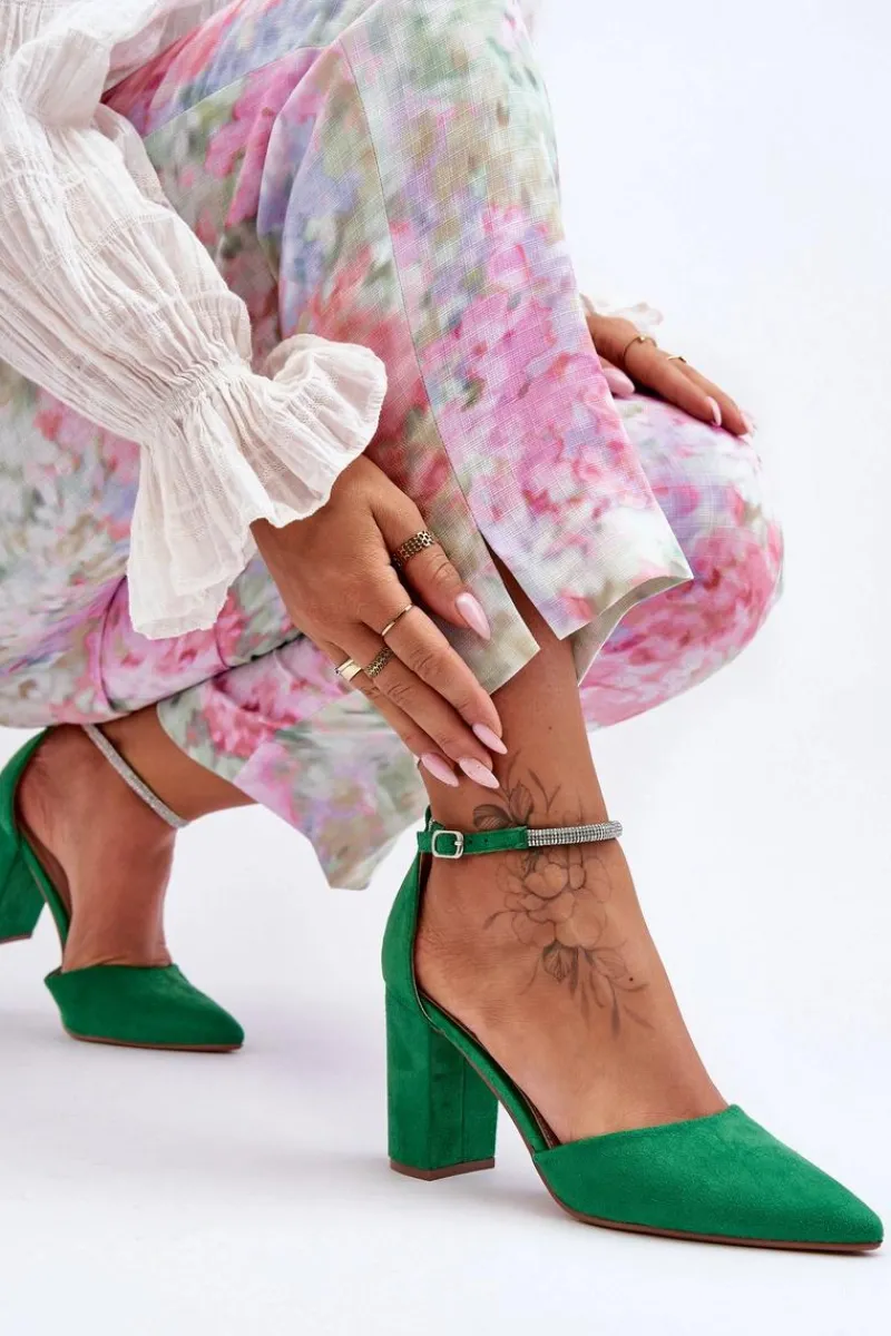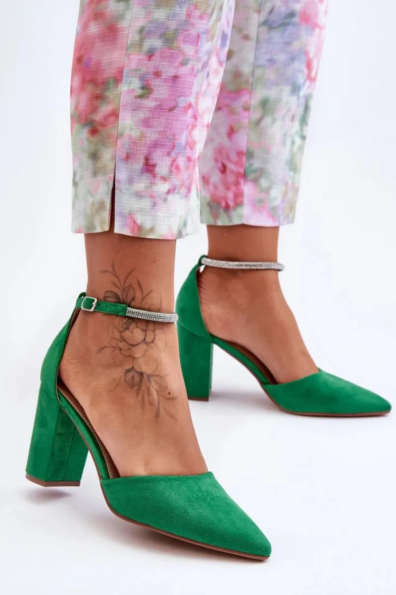 Klasyczne czółenka z noskiem w szpic zostały wykonane z eko zamszu. Zapinane wokół kostki na sprzączkę z regulowanym paskiem ozdobionym dżetami imitującymi cyrkonie. Miękka wkładka z eko skóry zapewnia wysoki komfort użytkowania. Czółenka zostały osadzone na obcasie w postaci stabilnego słupka. Świetnie sprawdzą się w zestawieniu z sukienkami, eleganckimi spodniami czy jeansami. Przy wyborze rozmiaru prosimy kierować się tabelą rozmiarów