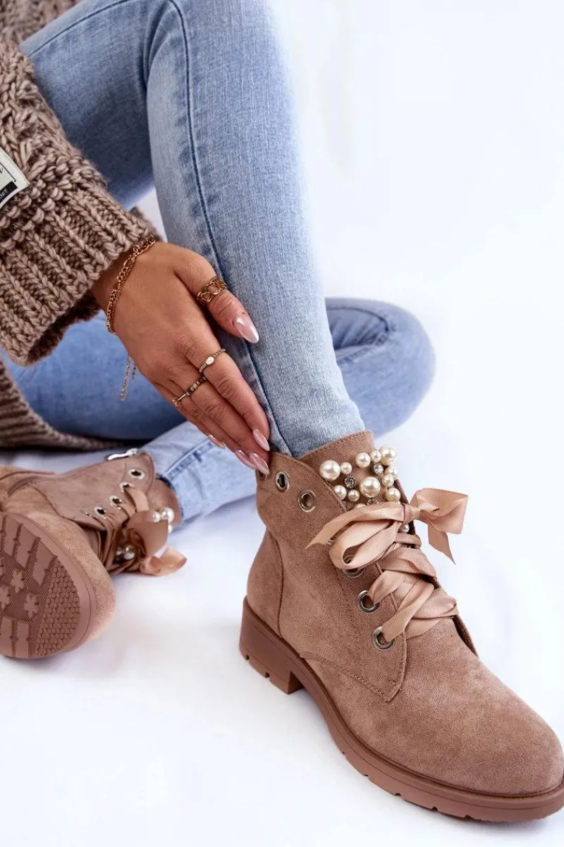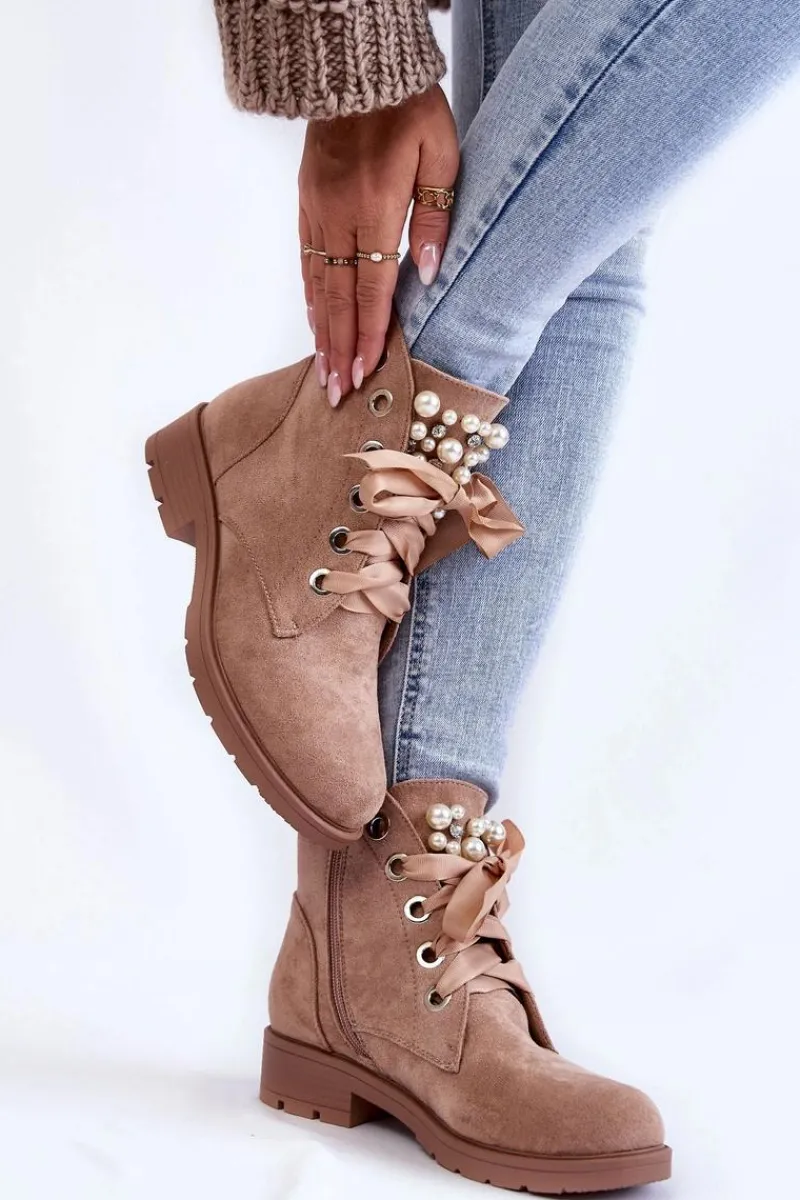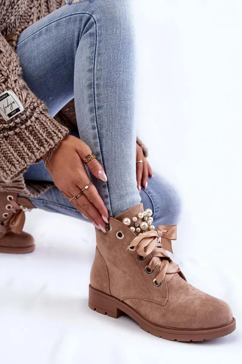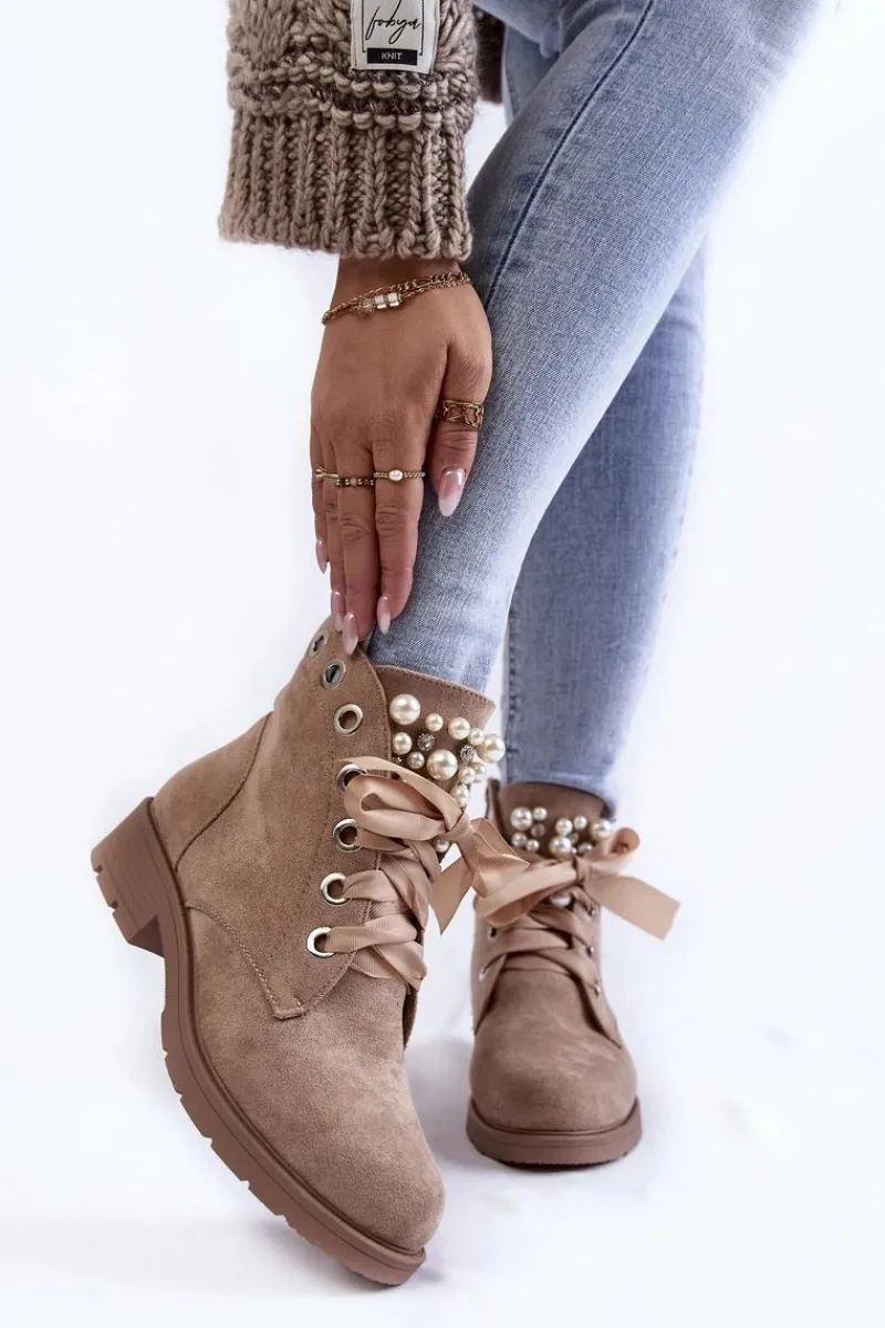 Damskie botki z pięknymi perełkami i dżetami imitującymi cyrkonie podkreślą każdą Twoją stylizację! Wykonane z eko skórzanych materiałów. Nieregularna cholewka została przyozdobiona metalowymi kółeczkami. Botki posiadają ocieplenie w postaci delikatnego koca obuwniczego. Osadzone na płaskim obcasie i delikatnej podeszwie. Ten świetny model nigdy nie wyjdzie z mody, dlatego powinnaś mieć te botki w swojej szafie! Przy wyborze rozmiaru prosimy sugerować się tabelą rozmiarów.