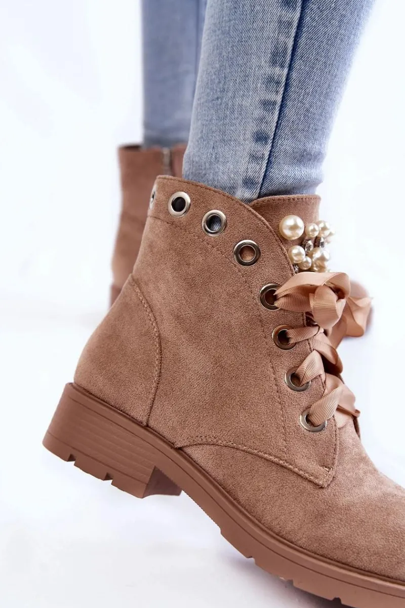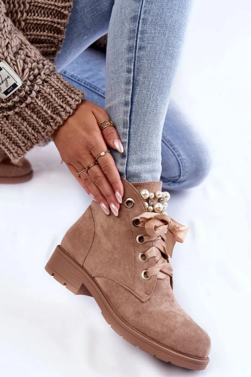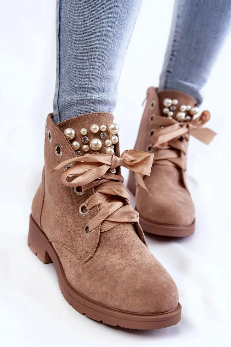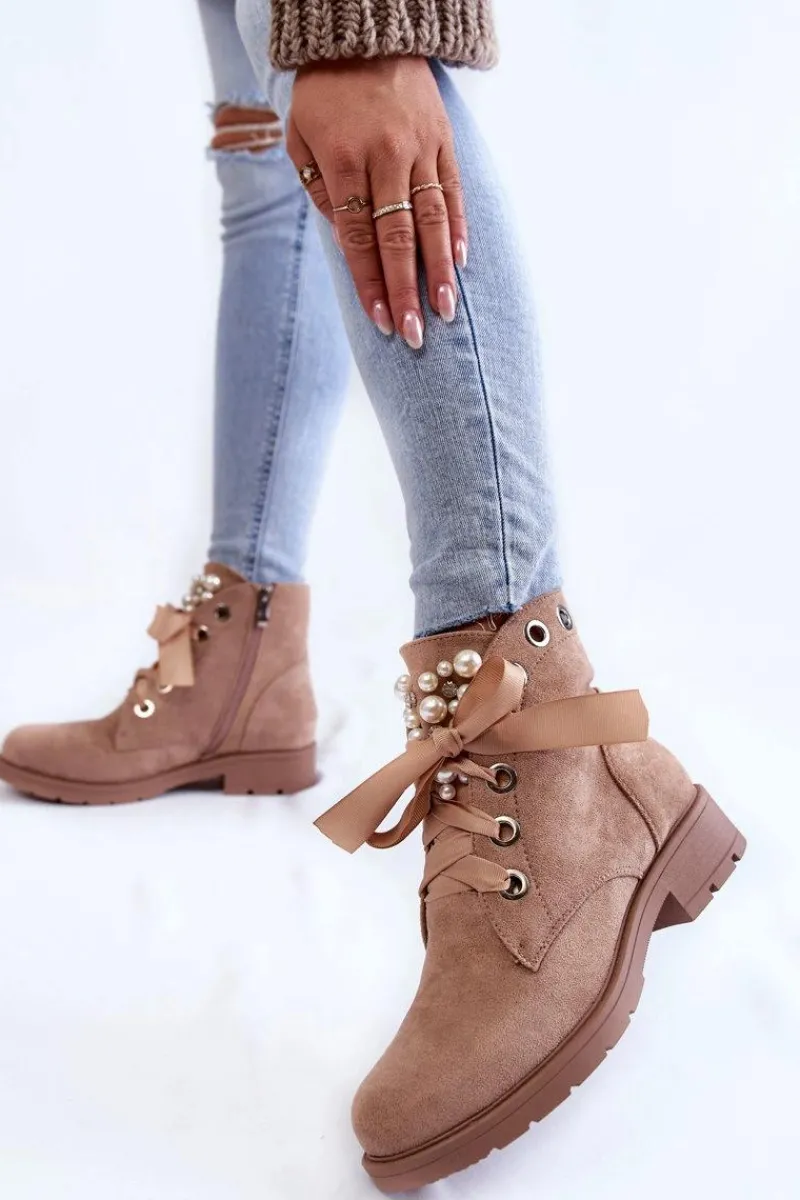 Damskie botki z pięknymi perełkami i dżetami imitującymi cyrkonie podkreślą każdą Twoją stylizację! Wykonane z eko skórzanych materiałów. Nieregularna cholewka została przyozdobiona metalowymi kółeczkami. Botki posiadają ocieplenie w postaci delikatnego koca obuwniczego. Osadzone na płaskim obcasie i delikatnej podeszwie. Ten świetny model nigdy nie wyjdzie z mody, dlatego powinnaś mieć te botki w swojej szafie! Przy wyborze rozmiaru prosimy sugerować się tabelą rozmiarów.