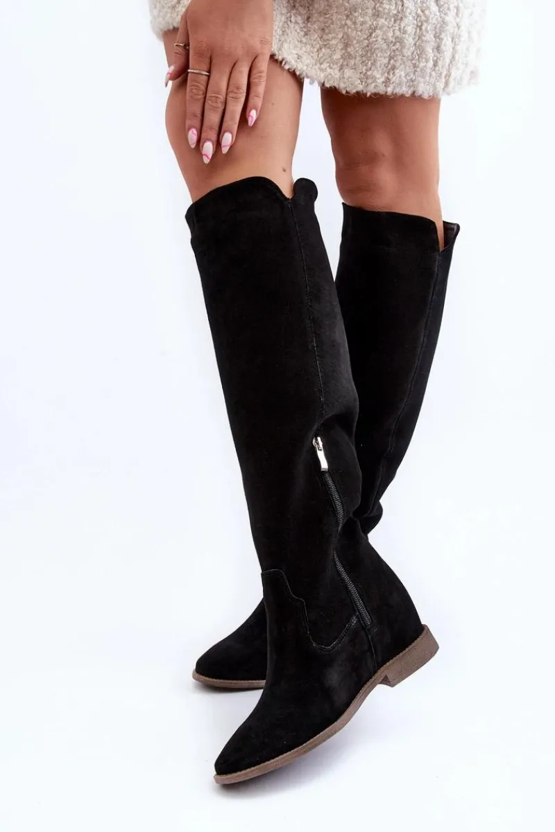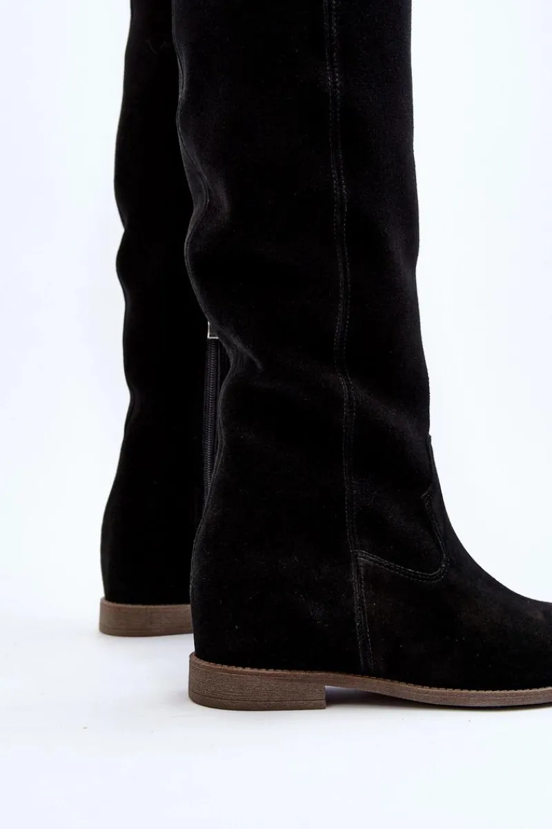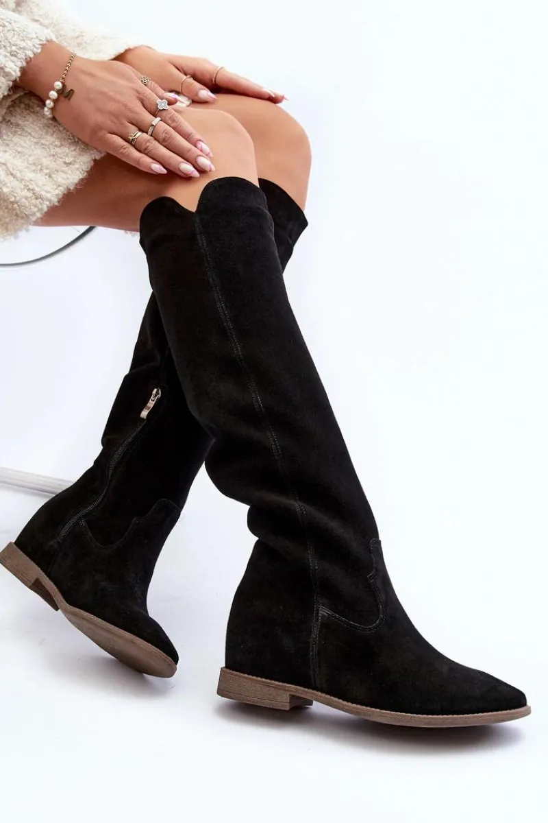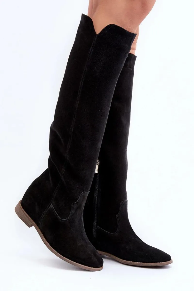 Kozaki damskie zostały wykonane z wysokiej jakości naturalnego zamszu. Osadzone na płaskim obcasie oraz ukrytym koturnie. Cholewka do kolana z wycięciami na bokach. Noski zaokrąglone. Środek lekko ocieplony kocem obuwniczym. Ten modny fason świetnie sprawdzi się w wielu wiosenno-jesiennych stylizacjach! Przy wyborze rozmiaru prosimy sugerować się tabelą rozmiarów.