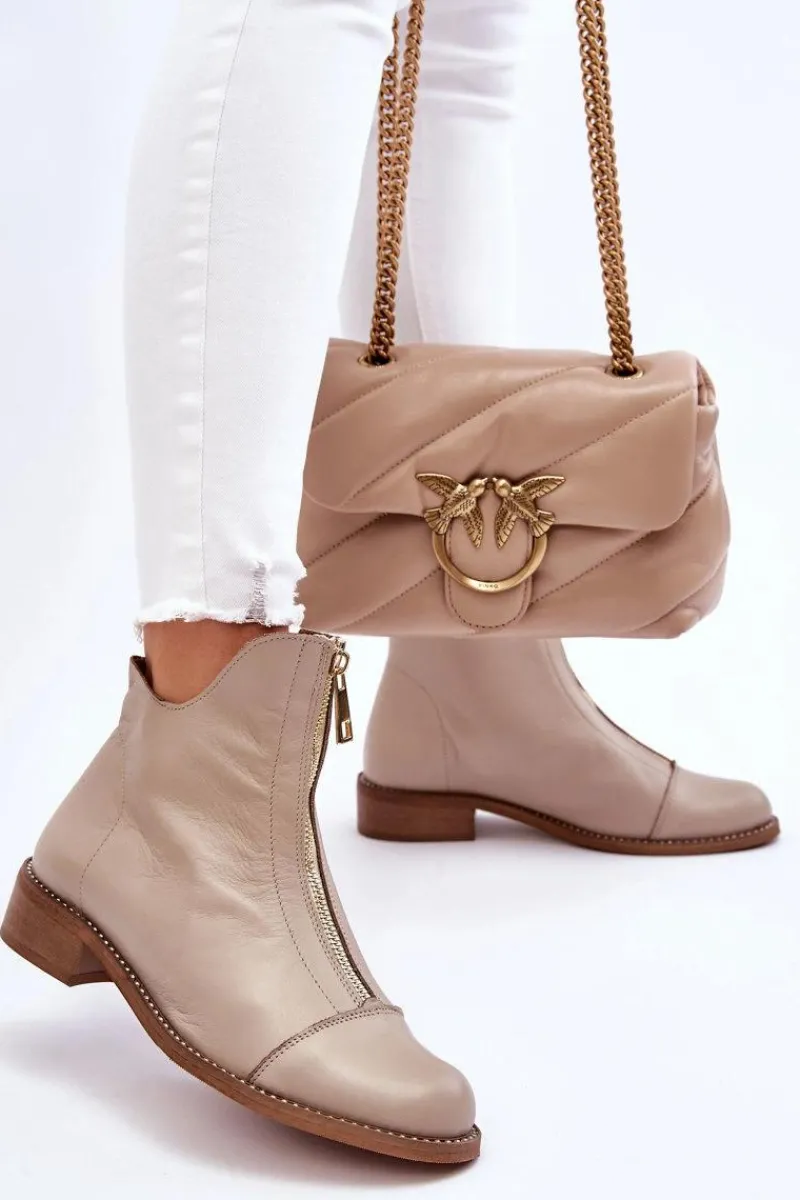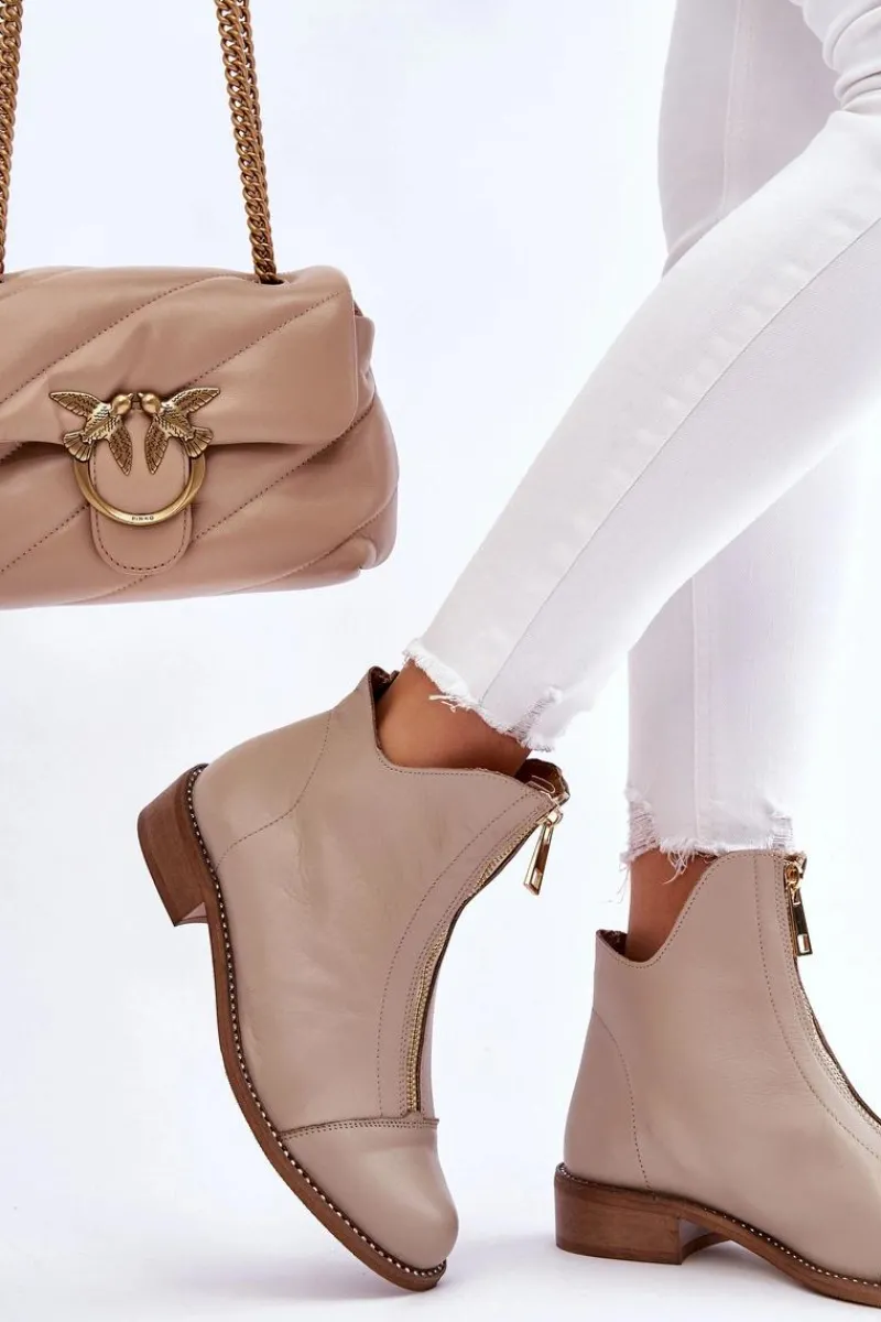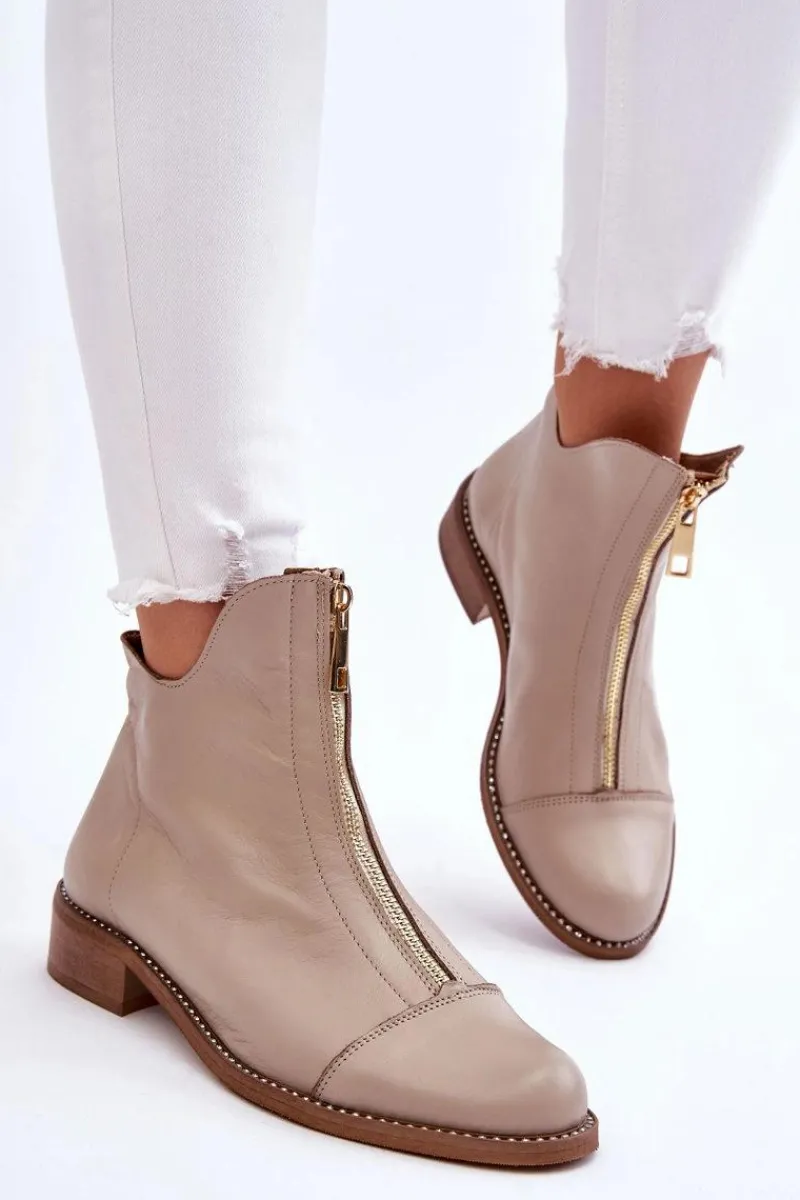 Modne botki damskie zostały wykonane z wysokiej jakości skóry naturalnej. Posiadają suwak na przodzie cholewki. Buty zostały osadzone na płaskim obcasie. Dodatkowo posiadają usztywniany zapiętek. Miękka, skórzana wkładka zapewni Ci wysoki komfort użytkowania przez cały dzień! Koniecznie powinnaś je mieć! Przy wyborze rozmiaru prosimy sugerować się tabelą rozmiarów.