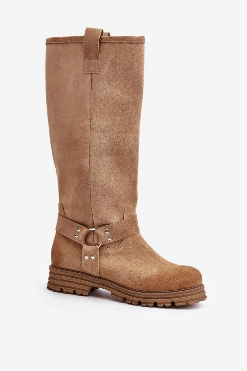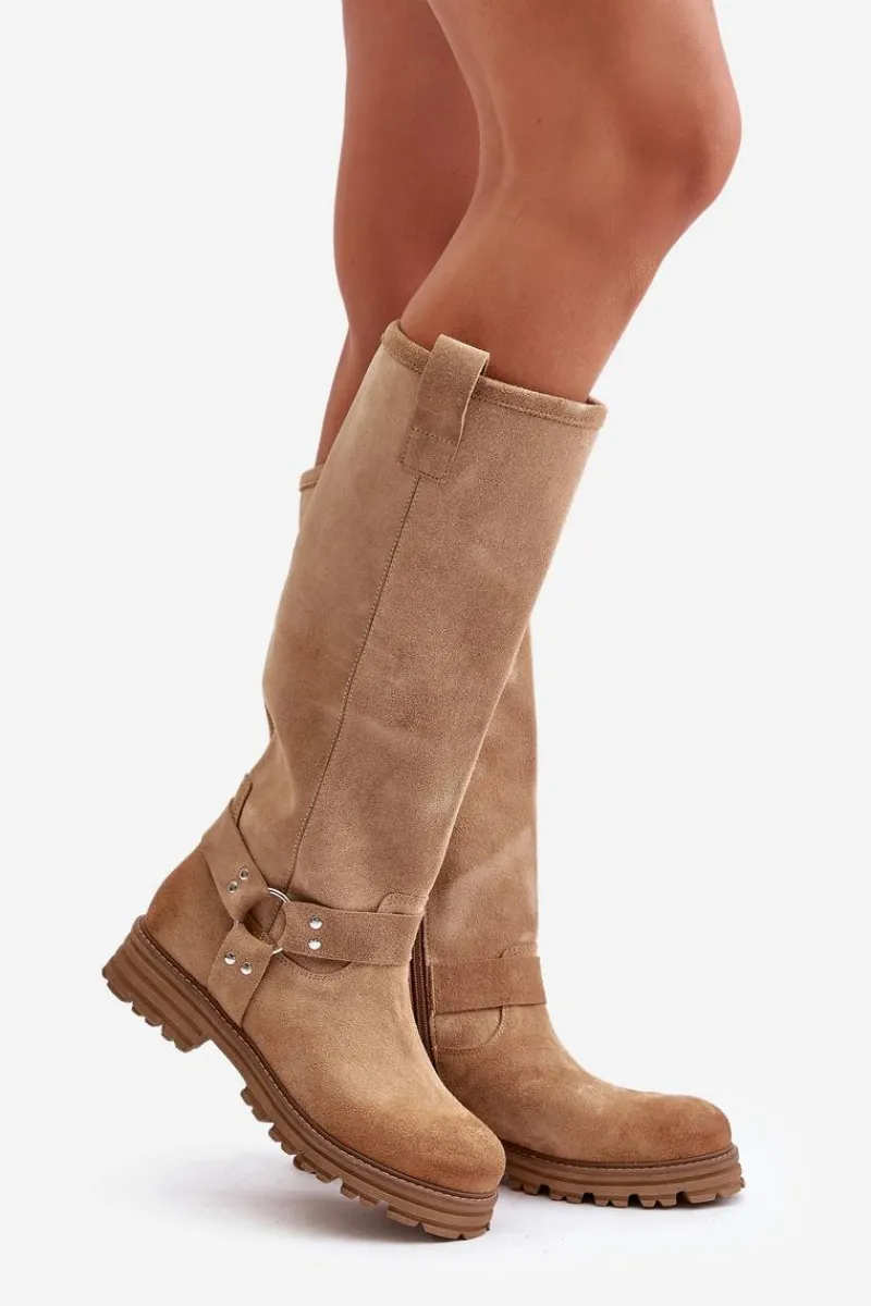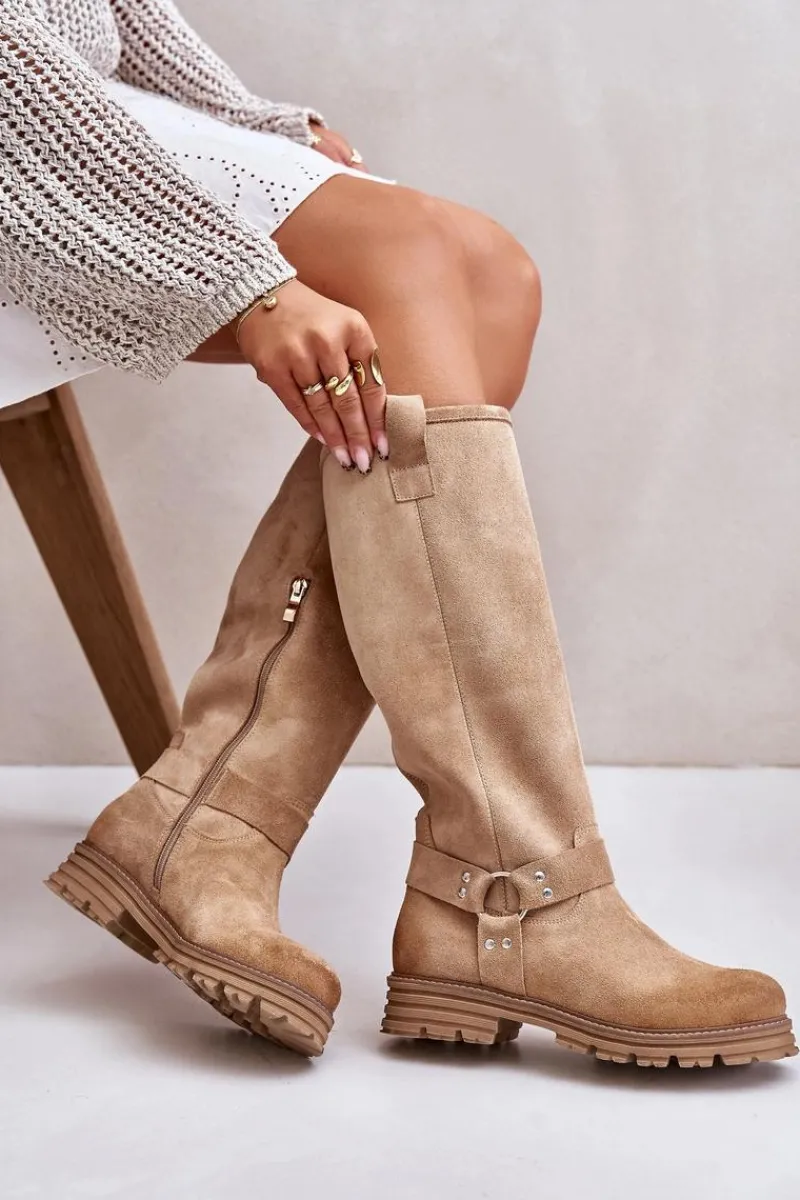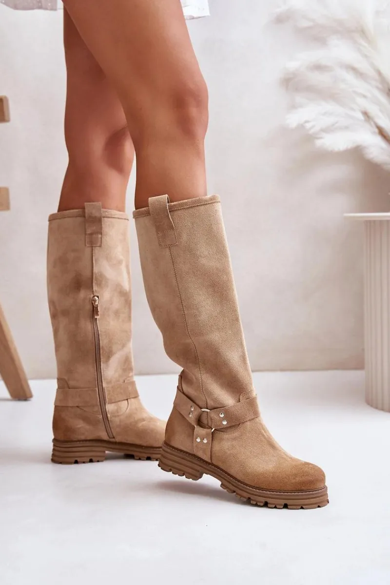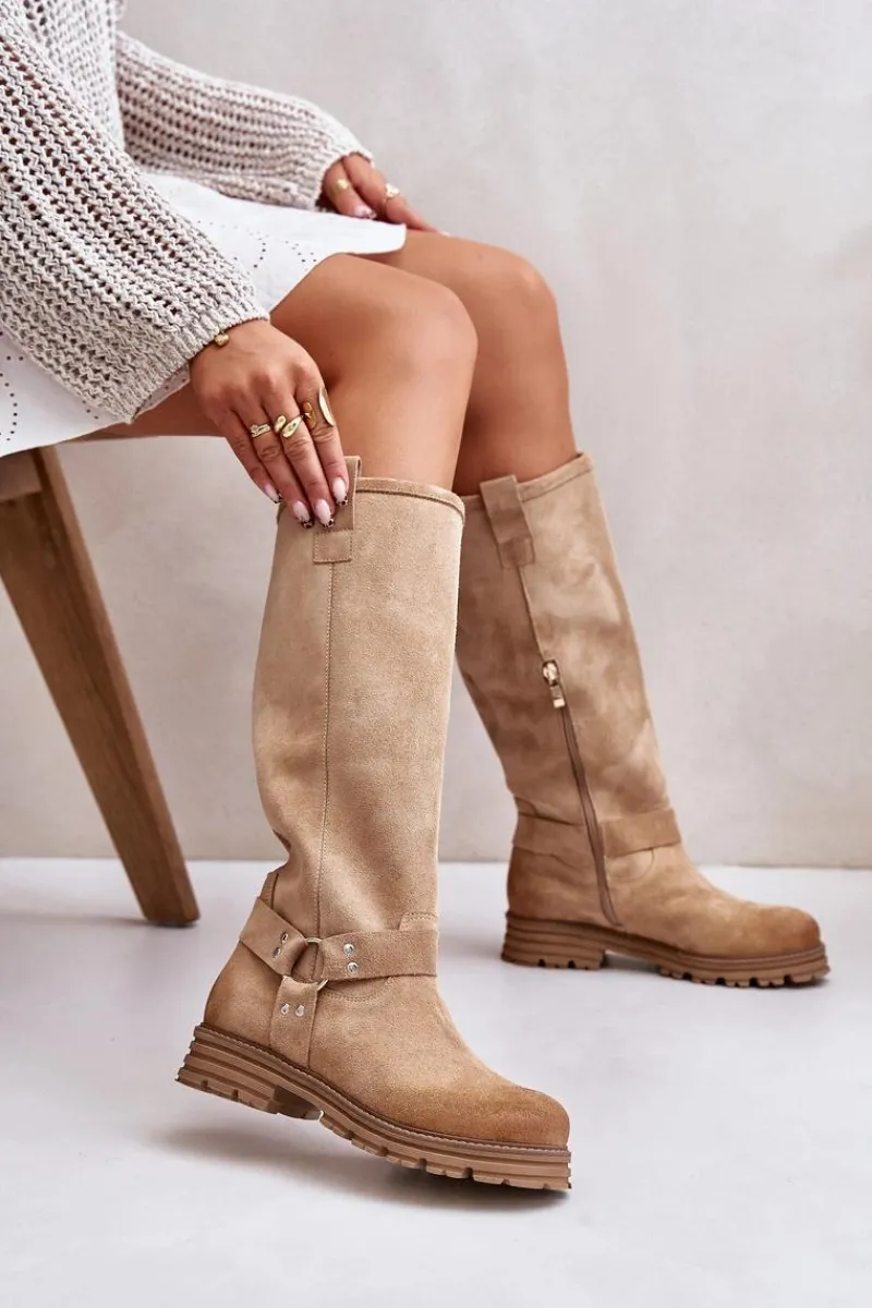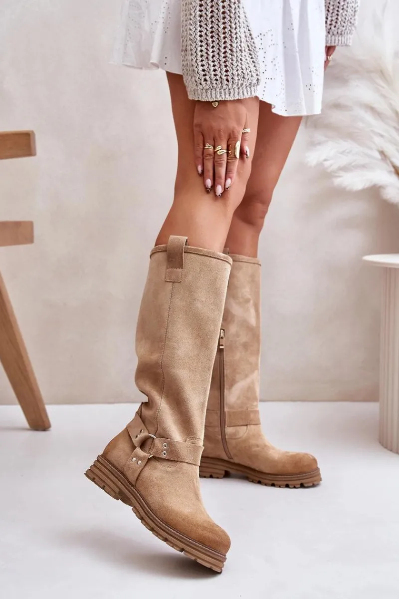 Kozaki damskie z naturalnego zamszu to połączenie elegancji i wygody. Osadzone na płaskim obcasie, zapewniają komfort noszenia przez cały dzień. Cholewka sięga przed kolano, co dodaje szyku i świetnie komponuje się z różnymi stylizacjami. Zaokrąglone noski nadają im subtelnego wyglądu. Model wsuwany z praktycznym zapięciem na zamek ułatwia zakładanie, a ozdobne paski na cholewce dodają charakteru. Idealne na co dzień i wyjątkowe okazje, te kozaki będą doskonałym uzupełnieniem Twojej garderoby! Przy wyborze rozmiaru prosimy sugerować się tabelą rozmiarów.