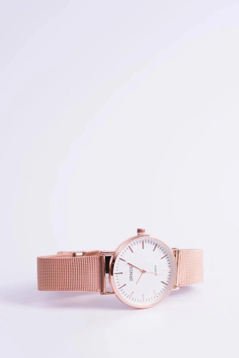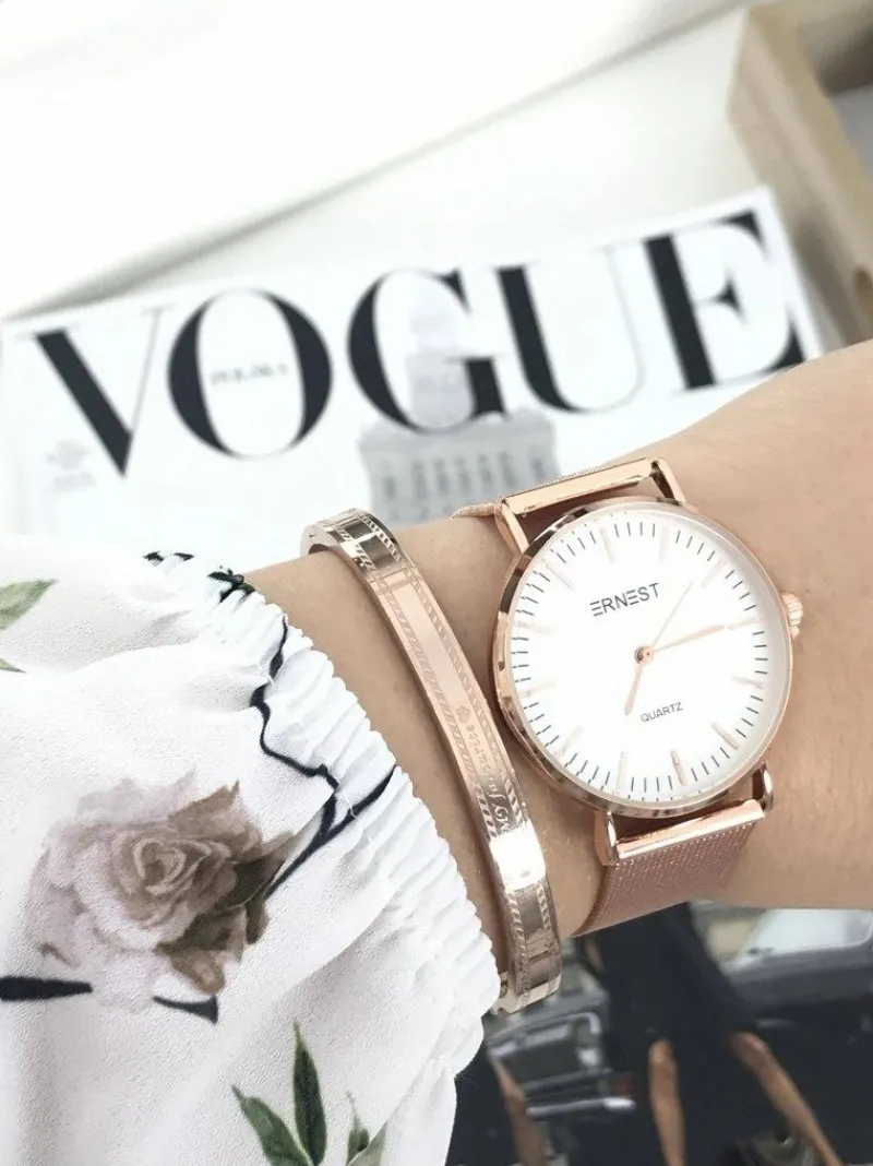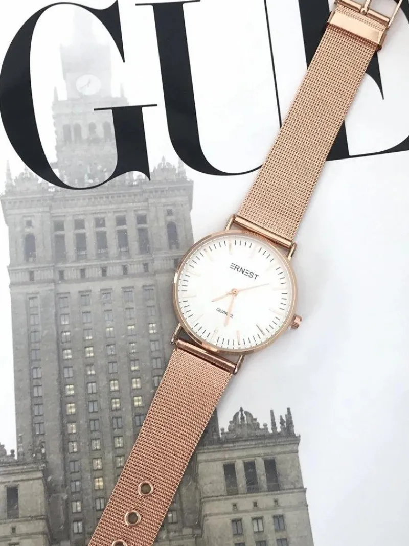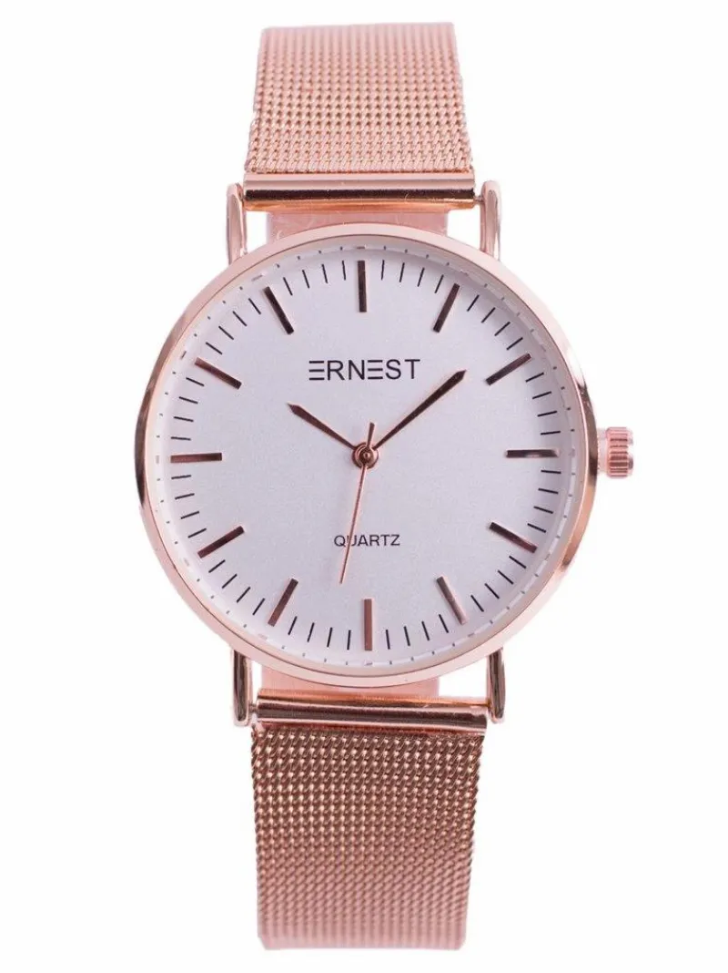 Zegarek Lena marki Ernest to gratka stworzona z myślą o kobietach kochających gustowne dodatki do swoich stylizacji. Zegarek posiada płaskie szkiełko oraz sekundnik. Bransoleta typu mesh w kolorze koperty, wykonana ze stali chirurgicznej z możliwością łatwej i szybkiej regulacji. Wysoka jakość wykonania mechanizmu oraz koperty.