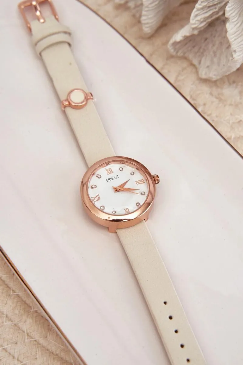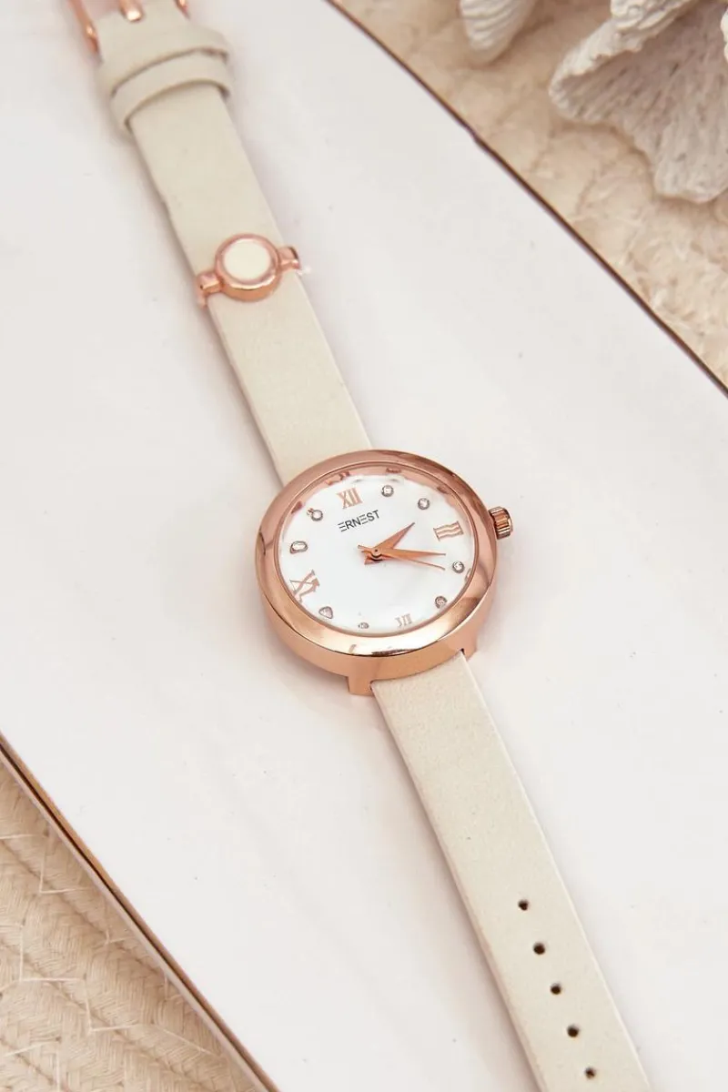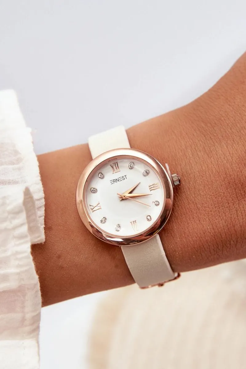 Damski zegarek na eko skórzanym pasku marki Ernest. Tarcza zegarka ozdobiona cyrkoniami dodaje mu wyjątkowego blasku i uroku. Dzięki możliwości regulacji paska, zegarek doskonale dopasowuje się do każdej wielkości nadgarstka, zapewniając komfort noszenia i stylowy wygląd. Idealny wybór zarówno na codzień jak i na bardziej specjalne okazje.