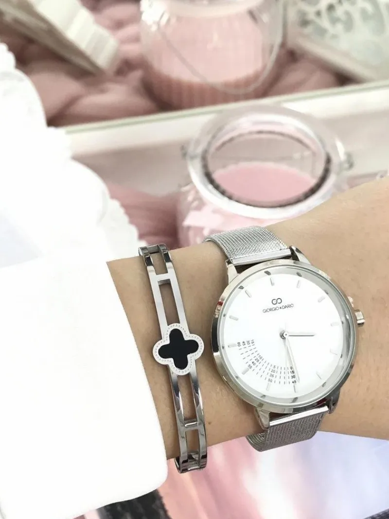 Zegarek Virgo marki Giorgio & Dario to gratka stworzona z myślą o kobietach kochających gustowne dodatki do swoich stylizacji. Zegarek posiada wypukłe szkiełko, które w połączeniu z piękną białą tarczą oraz nietypową skalą nadaje mu niecodziennego wyglądu. Bransoleta typu mesh w kolorze koperty, wykonana ze stali chirurgicznej z możliwością łatwej i szybkiej regulacji. Wysoka jakość wykonania mechanizmu i koperty.