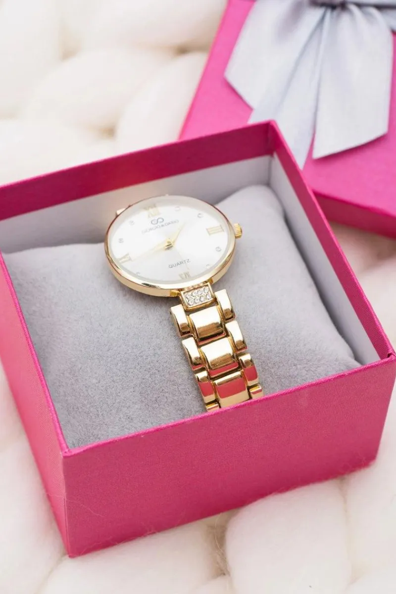 Stylowy damski zegarek marki Giorgio&Dario! Złota bransoleta wraz z ozdobnymi klejnotami to podstawa szyku! Piękna, prosta i elegancko wykończona koperta zadowoli każdą kobietę! Kup teraz w świetnej cenie! W zestawie pudełko w LOSOWYM kolorze oraz poduszeczka.