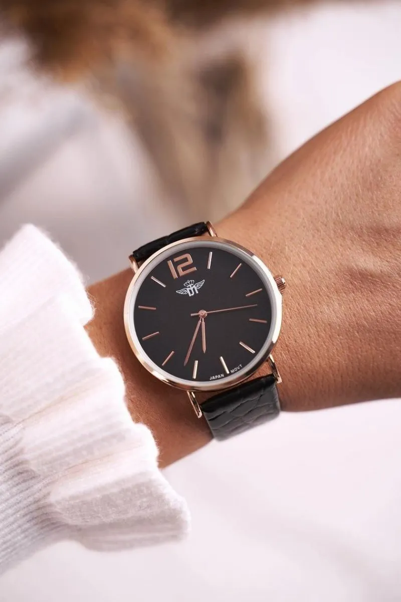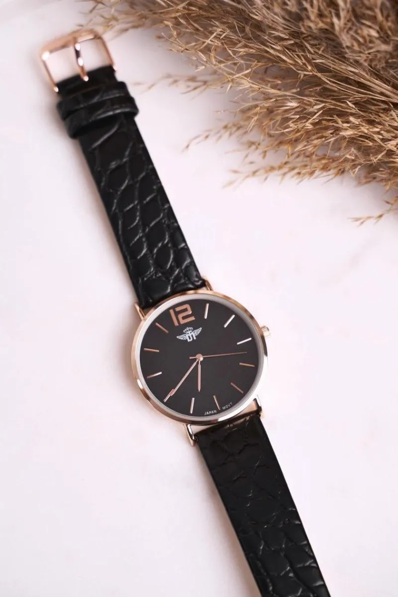 Piękny zegarek Michael John na skórzanym pasku z motywem zwierzęcym. Duża tarcza zegarka została utrzymana w czarnym kolorze co świetnie współgra z różowo-złotą kopertą zegarka.