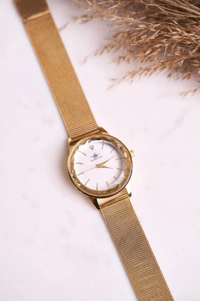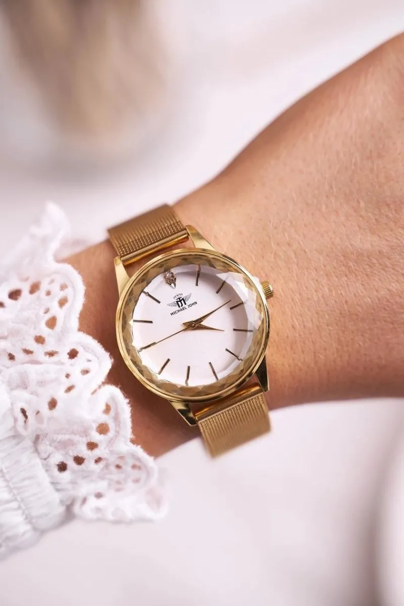 Damski zegarek Michael John charakteryzuje niepowtarzalny design. Złoty zegarek damski posiada średniej wielkości, okrągłą kopertę. Białą tarczę osłania grube szkło o niebanalnym wykończeniu.