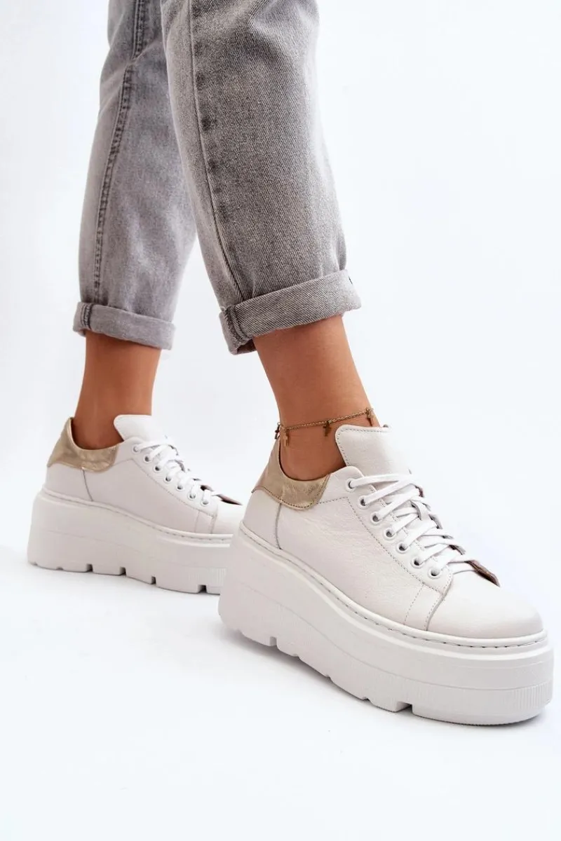 Buty sportowe damskie wykonane ze skóry naturalnej. Masywna platforma sprawia, że prezentują się niezwykle stylowo. Skórzana wkładka zapewni komfort podczas użytkowania. Noski zaokrąglone. Doskonale sprawdzą się w codziennych stylizacjach! Przy wyborze rozmiaru prosimy kierować tabelą rozmiarów.