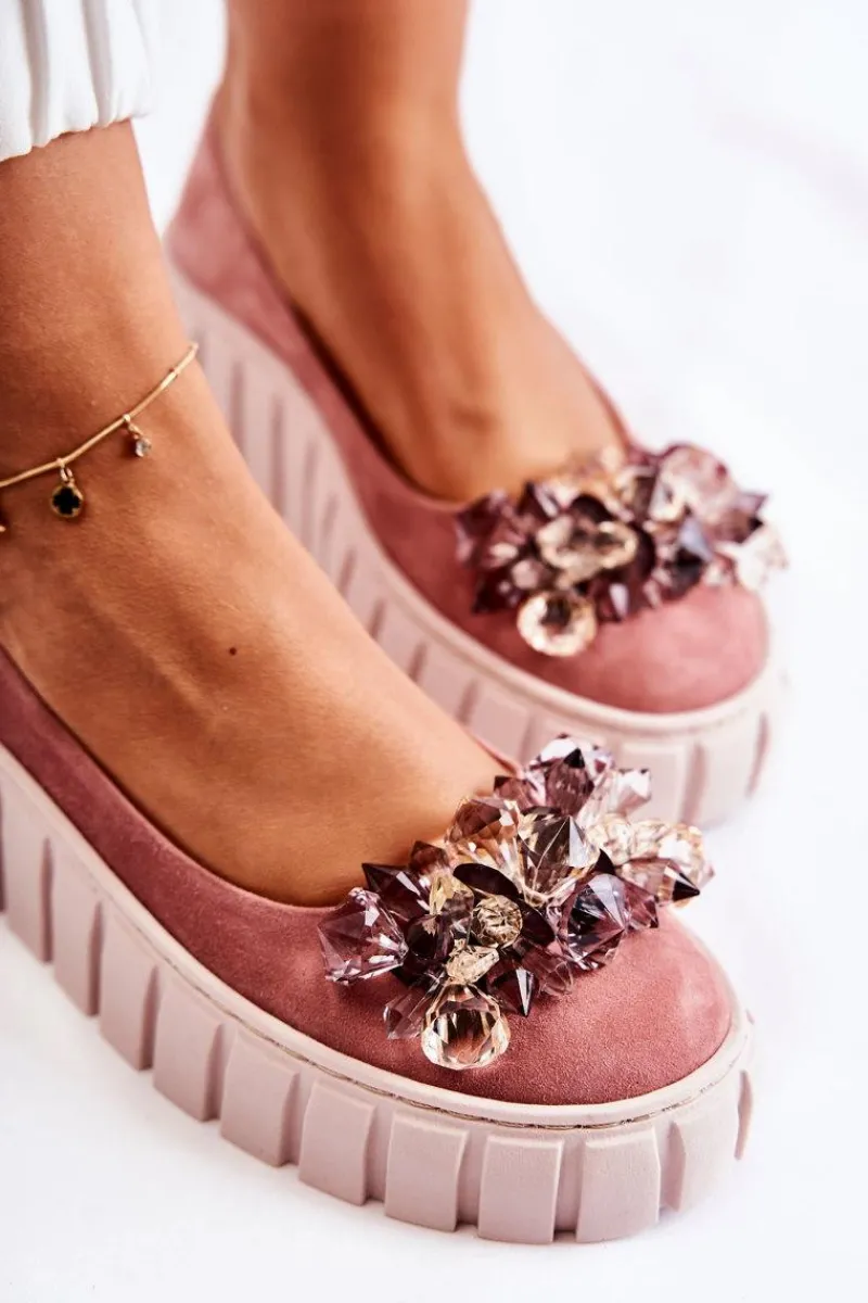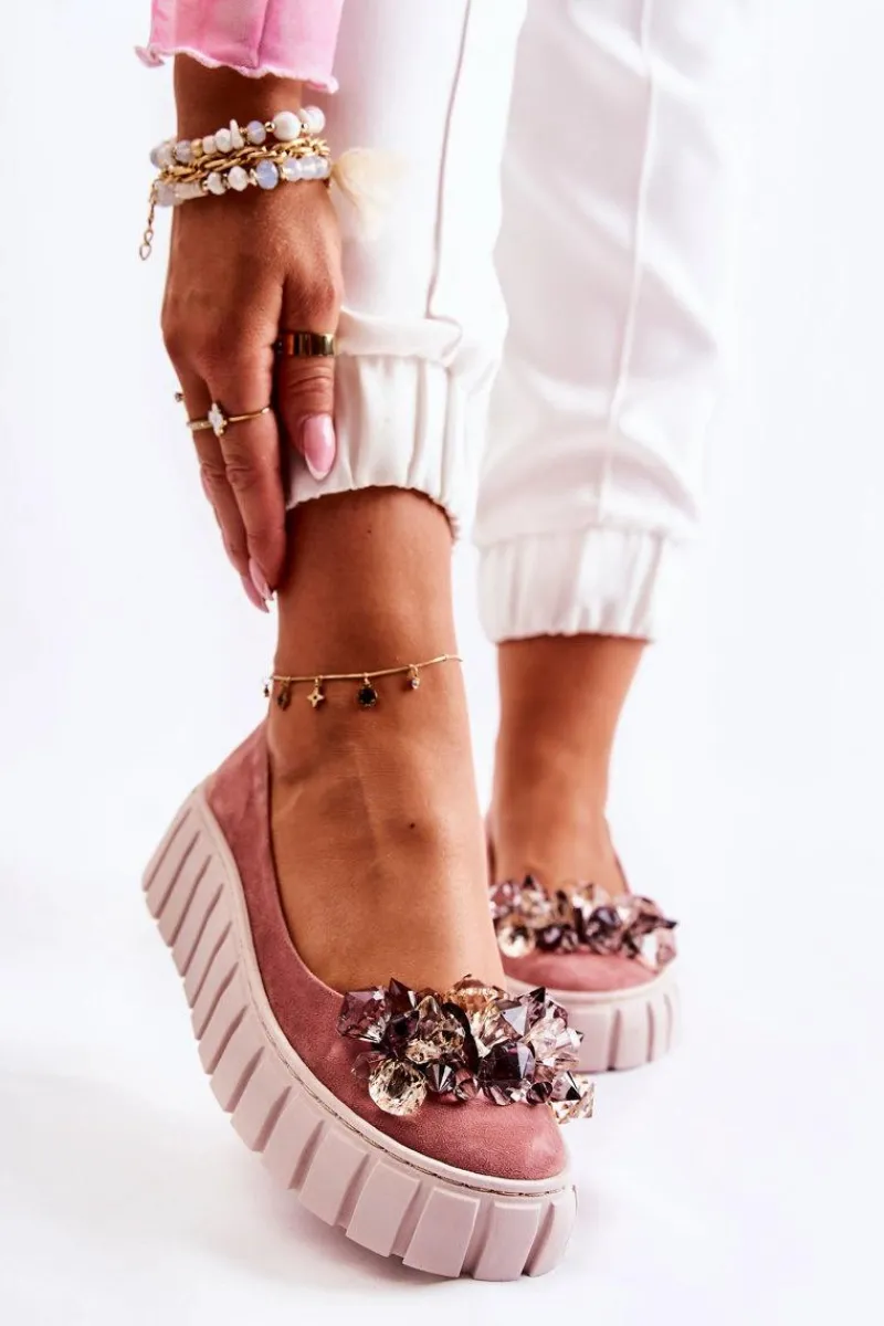 Damskie baleriny wykonane z naturalnego zamszu z dbałością o każdy detal. O komfort zadba miękka, skórzana wkładka. Podeszwa wykonana z gumowego tworzywa ze żłobieniami po bokach. Dodatkowo jest antypoślizgowa. Zapiętek jest usztywniany. Z przodu elegancka ozdoba w postaci imitacji kryształków doda tym butom uroku. Nosek zaokrąglony. Baleriny dopełnią wiele Twoich stylizacji. Przy wyborze rozmiaru prosimy sugerować się tabelą rozmiarów.
