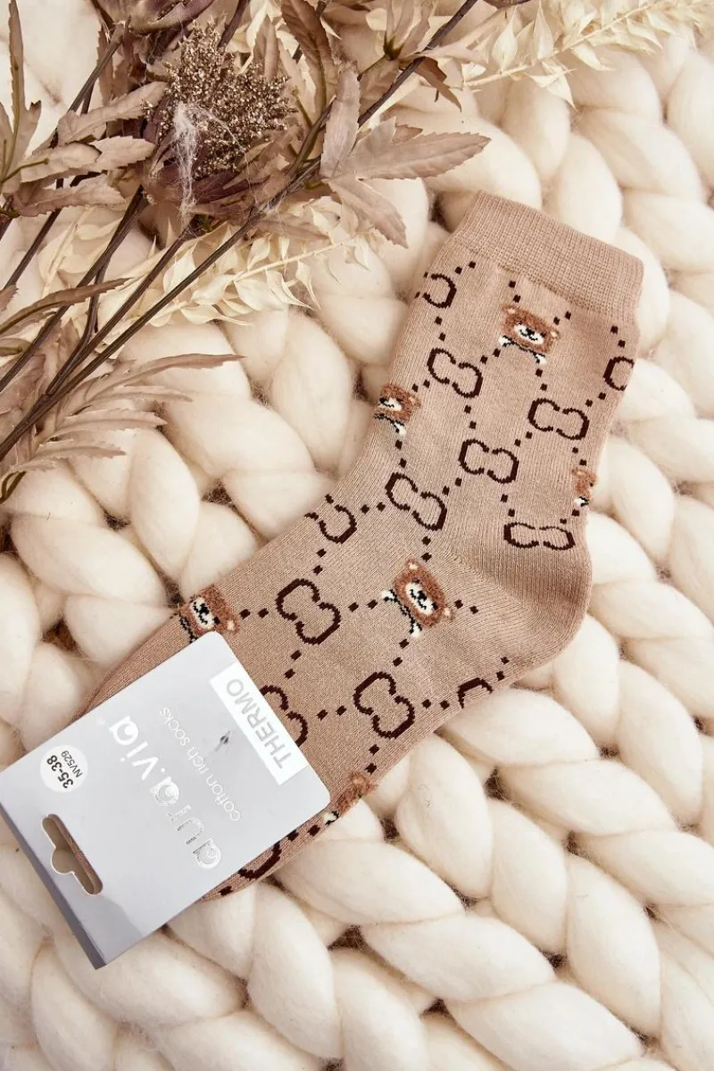 Ciepłe skarpety damskie idealne na mroźne dni. Model z naszywką w postaci misia. Lekki ściągacz sprawi, że będą idealnie dopasowane do tęgości nogi. Koniecznie powinnaś je mieć!