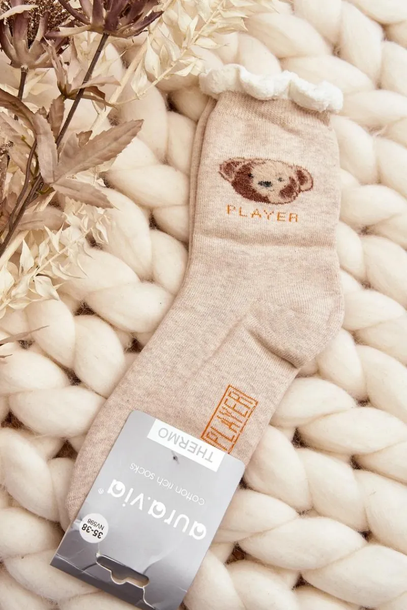 Ciepłe skarpety damskie idealne na mroźne dni. Model z naszywką w postaci misia. Lekki ściągacz sprawi, że będą idealnie dopasowane do tęgości nogi. Koniecznie powinnaś je mieć!