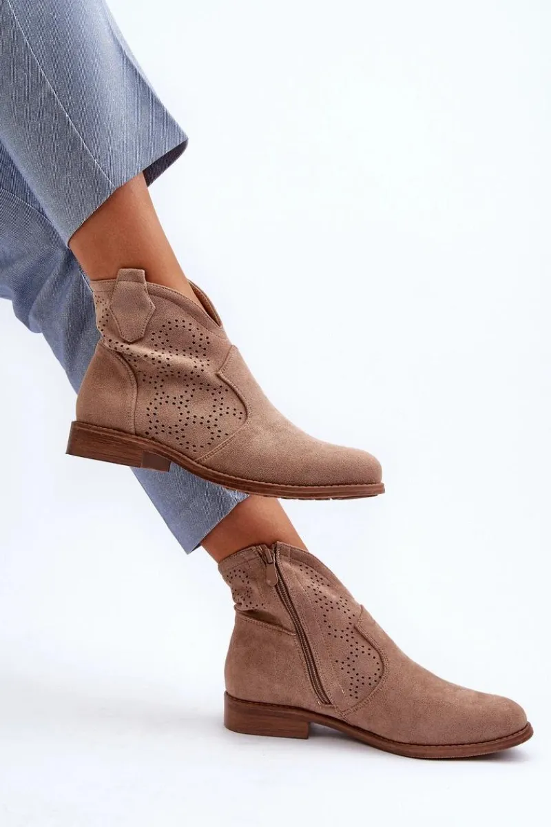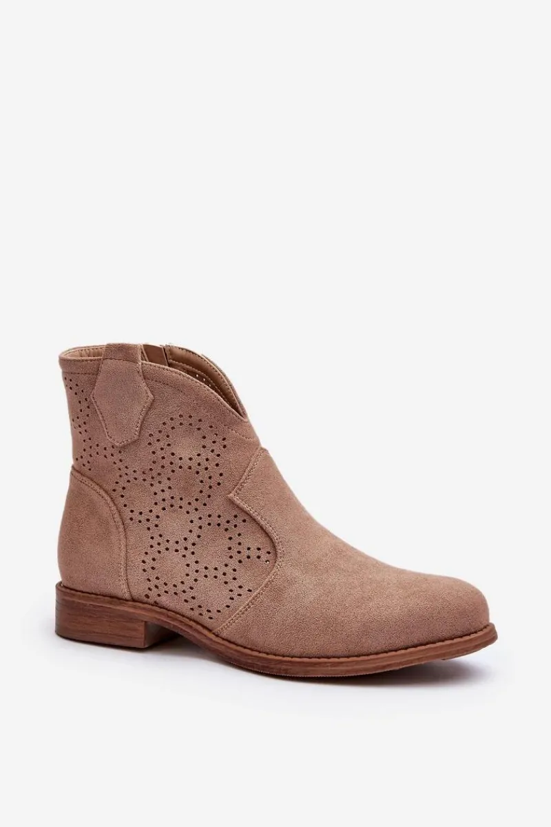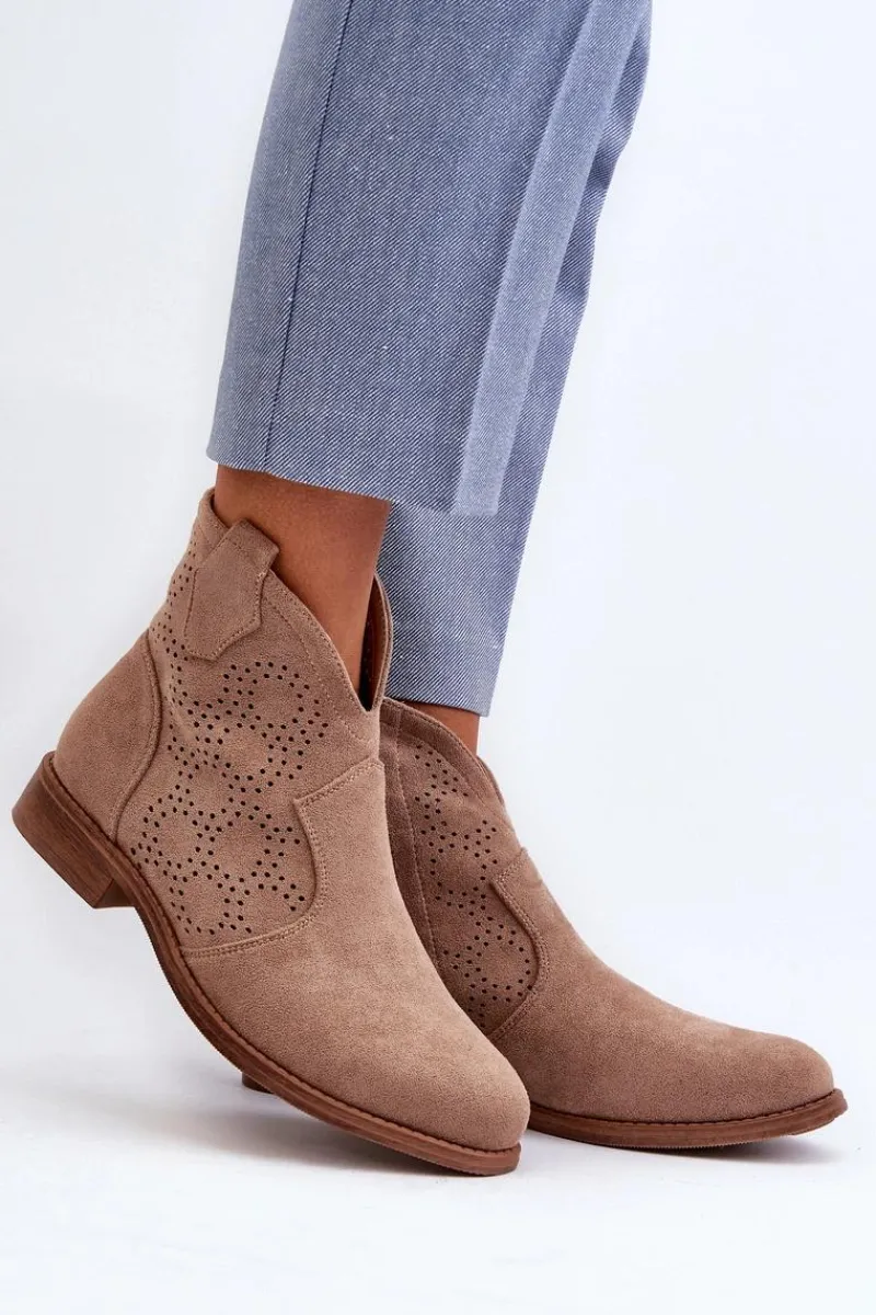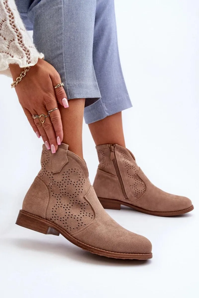 Botki damskie wykonane z eko zamszu to idealny wybór na wiosenne dni. Ażurowa cholewka nadaje im delikatności. Płaski obcas zapewnia stabilność i komfort użytkowania. Zapinanie na zamek ułatwia szybkie zakładanie i zdejmowanie obuwia. Te modne botki będą doskonałym uzupełnieniem Twojej wiosennej garderoby! Koniecznie powinnaś je mieć! Przy wyborze rozmiaru prosimy sugerować się tabelą rozmiarów.