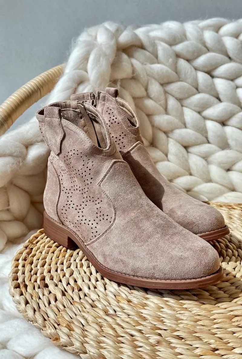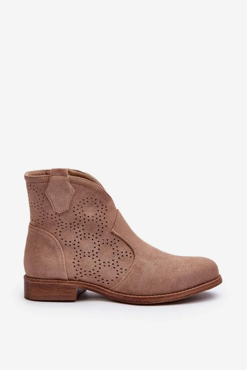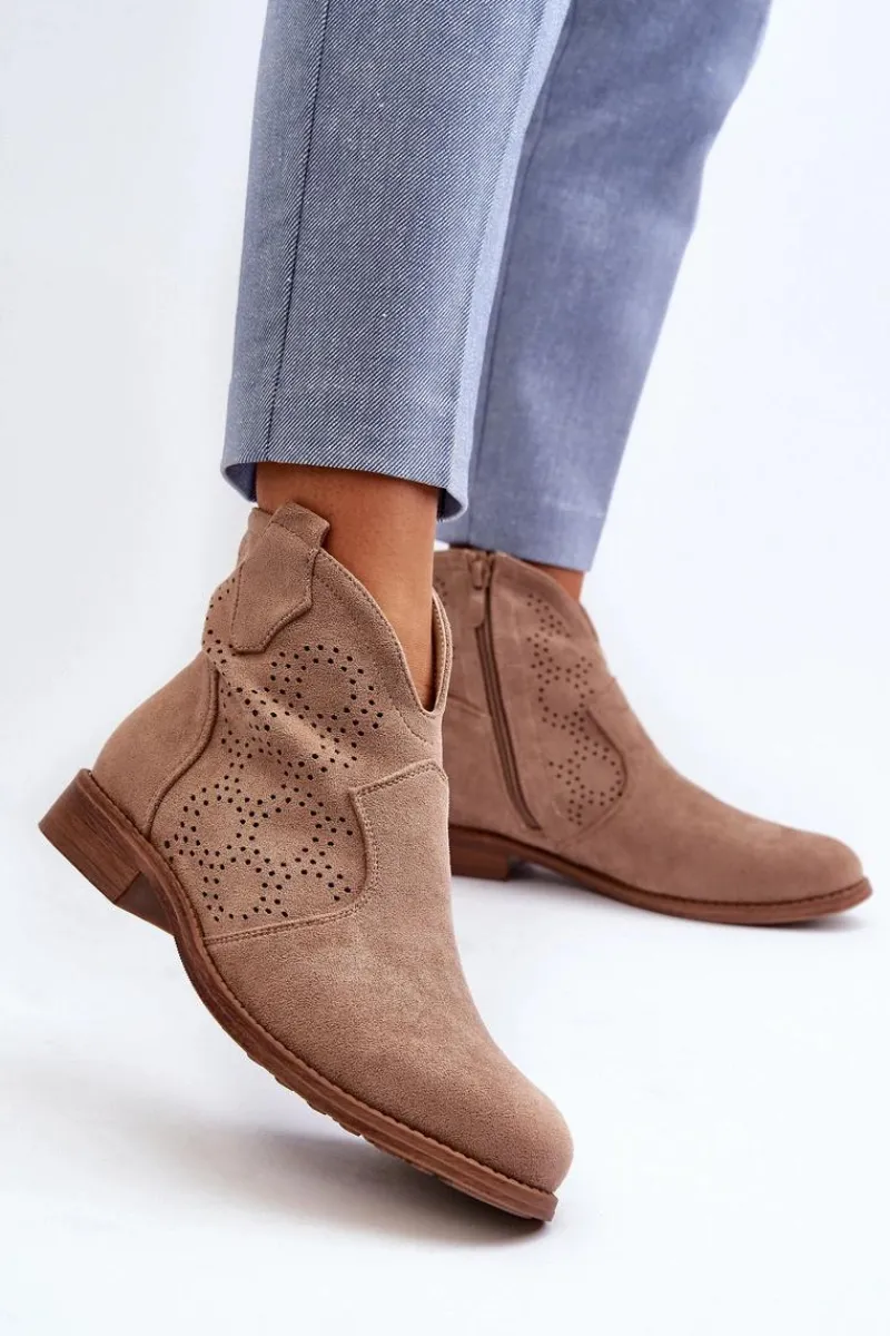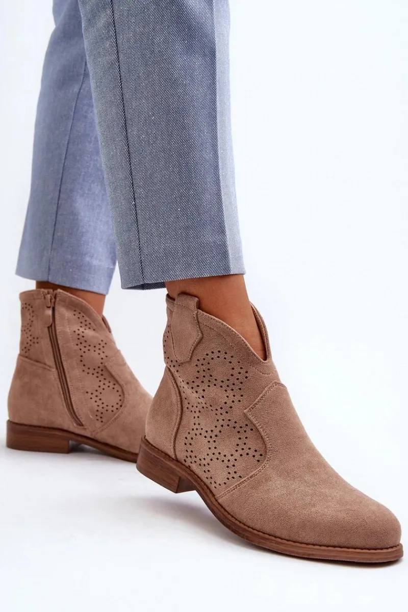 Botki damskie wykonane z eko zamszu to idealny wybór na wiosenne dni. Ażurowa cholewka nadaje im delikatności. Płaski obcas zapewnia stabilność i komfort użytkowania. Zapinanie na zamek ułatwia szybkie zakładanie i zdejmowanie obuwia. Te modne botki będą doskonałym uzupełnieniem Twojej wiosennej garderoby! Koniecznie powinnaś je mieć! Przy wyborze rozmiaru prosimy sugerować się tabelą rozmiarów.