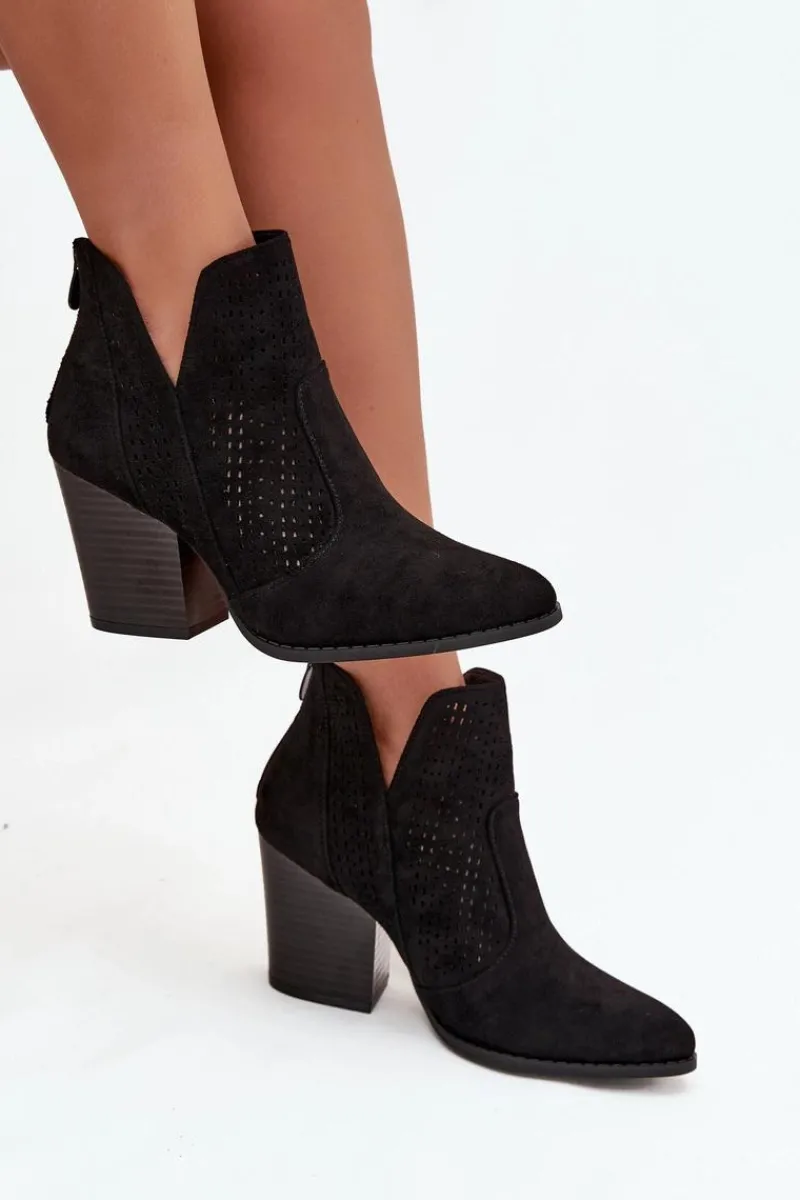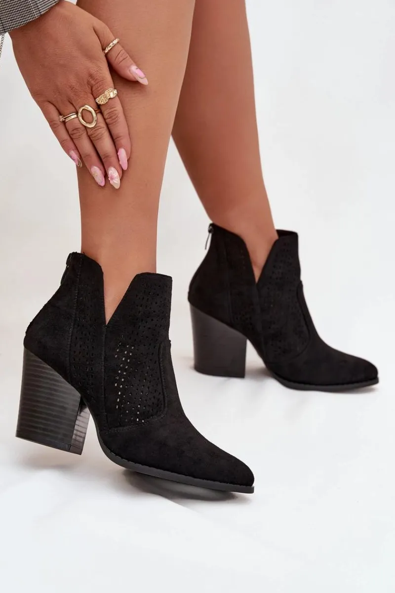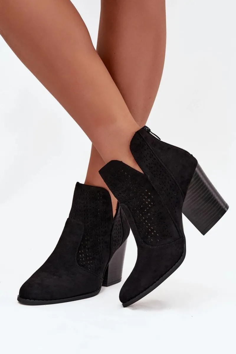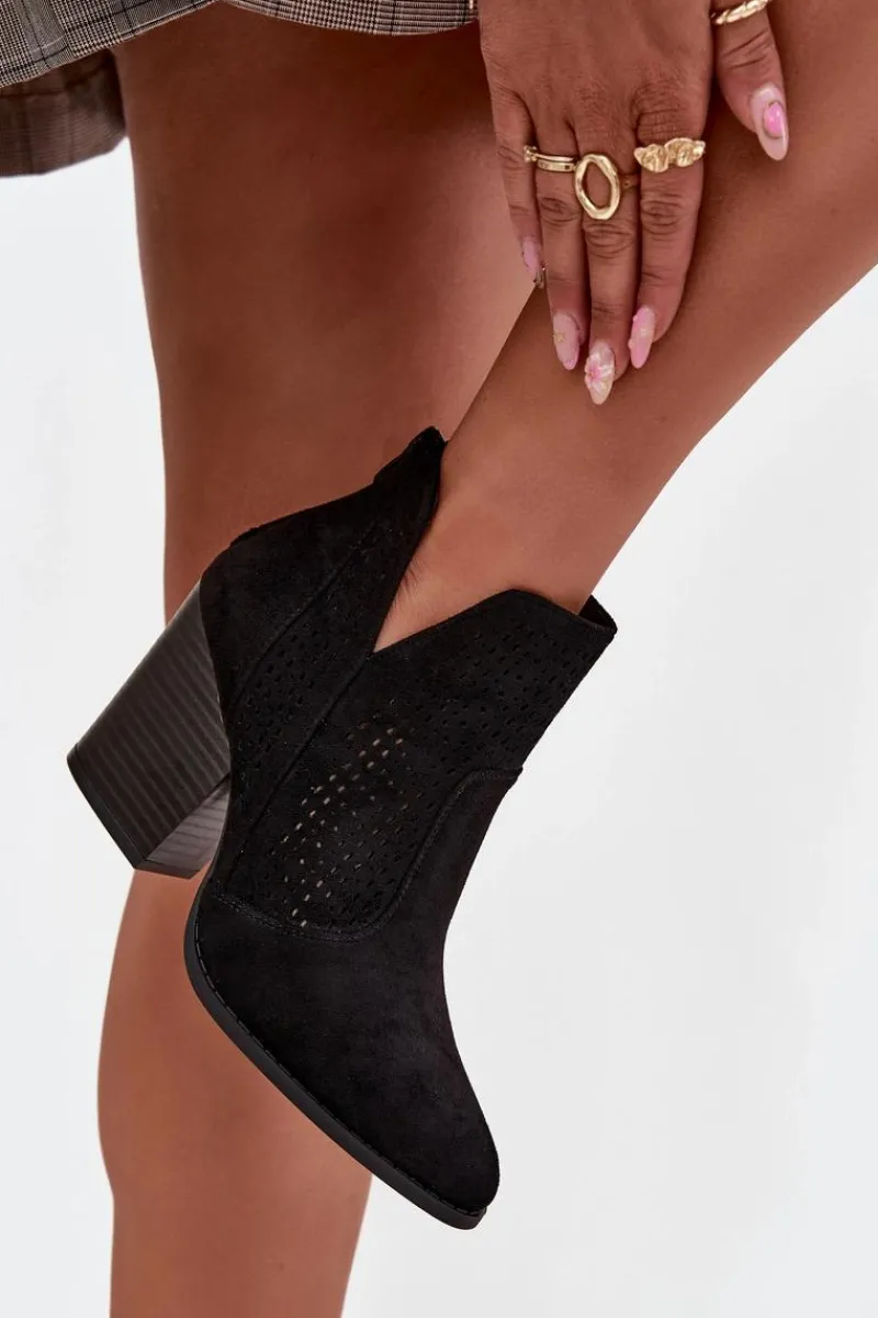 Botki damskie marki S. Barski wykonane z eko zamszu. Osadzone na stabilnym obcasie typu słupek, subtelnie wysmuklają sylwetkę. Model wyróżnia się modnymi wycięciami oraz ażurowym wzorem na cholewce, które nadają całości oryginalnego charakteru. Zamek umieszczony z tyłu ułatwia zakładanie i zdejmowanie butów. To botki, które świetnie sprawdzą się zarówno w casualowych, jak i bardziej eleganckich stylizacjach.