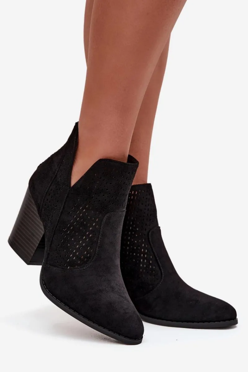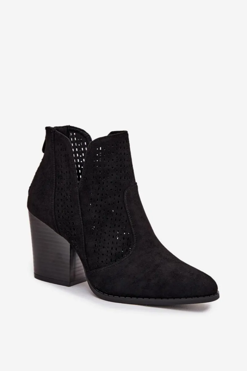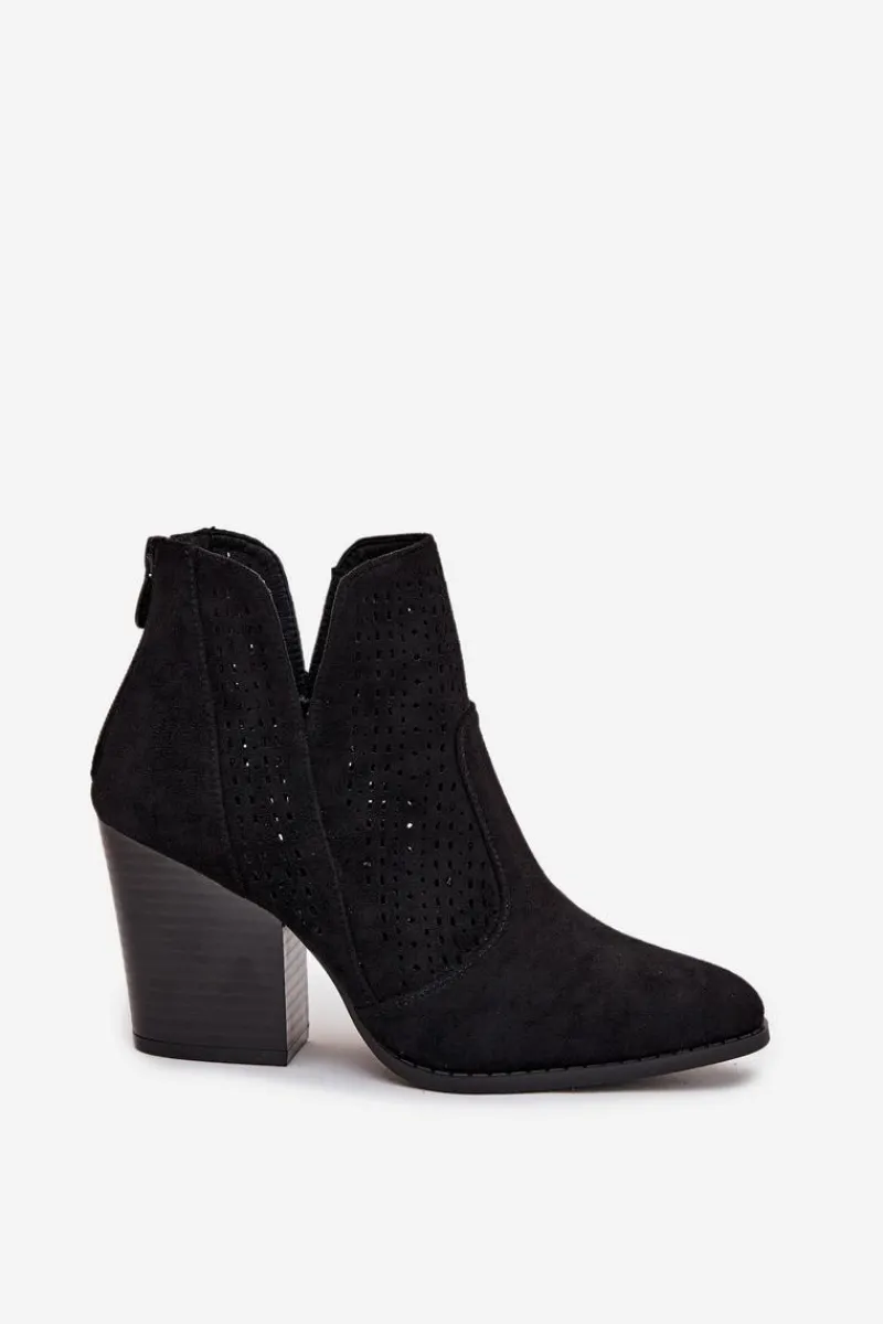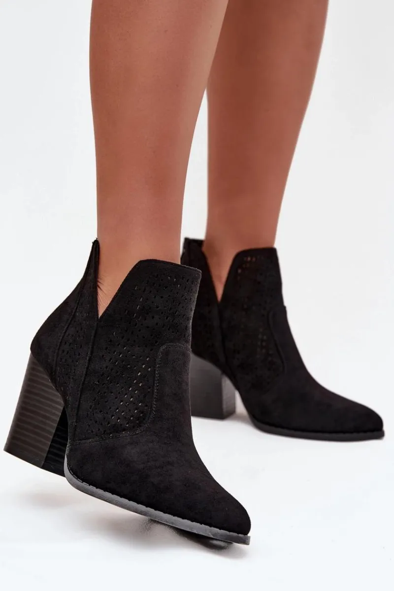 Botki damskie marki S. Barski wykonane z eko zamszu. Osadzone na stabilnym obcasie typu słupek, subtelnie wysmuklają sylwetkę. Model wyróżnia się modnymi wycięciami oraz ażurowym wzorem na cholewce, które nadają całości oryginalnego charakteru. Zamek umieszczony z tyłu ułatwia zakładanie i zdejmowanie butów. To botki, które świetnie sprawdzą się zarówno w casualowych, jak i bardziej eleganckich stylizacjach.