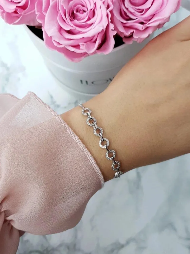 My kobiety kochamy błyskotki. Każda stylizacja potrzebuje dodatków, a nawet te najmniejsze są bardzo ważne. Mowa tu o pięknej biżuterii, która podkreśli to co najlepsze. Wspaniała bransoletka na łańcuszku z drobnymi kółeczkami zdobionymi cyrkoniami. Wzór został wykonany z wysokiej jakości tworzywa. Modny wzór na który każda z nas zwróci uwagę. Możliwość regulacji długości bransoletki. Sprawdź całą naszą kolekcję biżuterii i wybierz swój ulubiony dodatek.