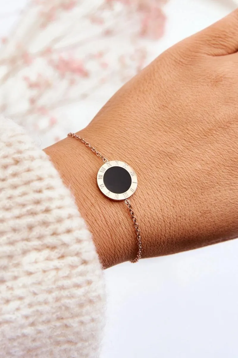 Damska bransoletka została wykonana ze stali nierdzewnej. Możliwość regulacji długości zapewni odpowiednie dopasowanie do tęgości nadgarstka. Całość wykonana z małych ogniw. Na środku znajduje się koło z cyframi rzymskimi. Bransoletka prezentuje się niezwykle elegancko. Sprawdź także pozostałą naszą ofertę biżuterii.