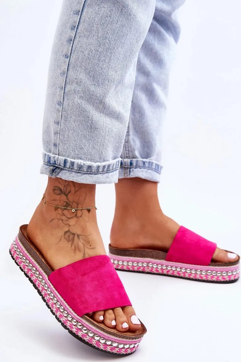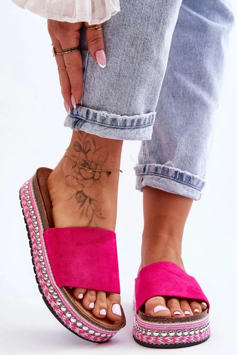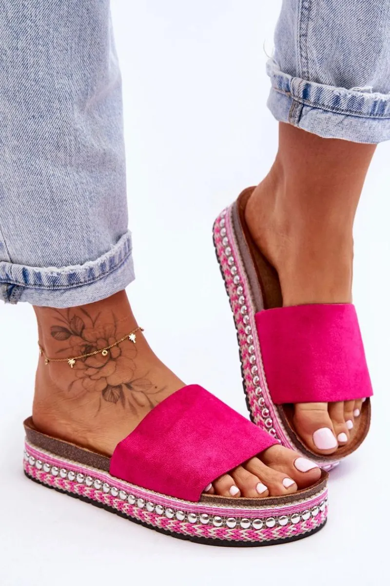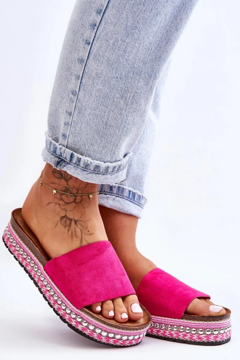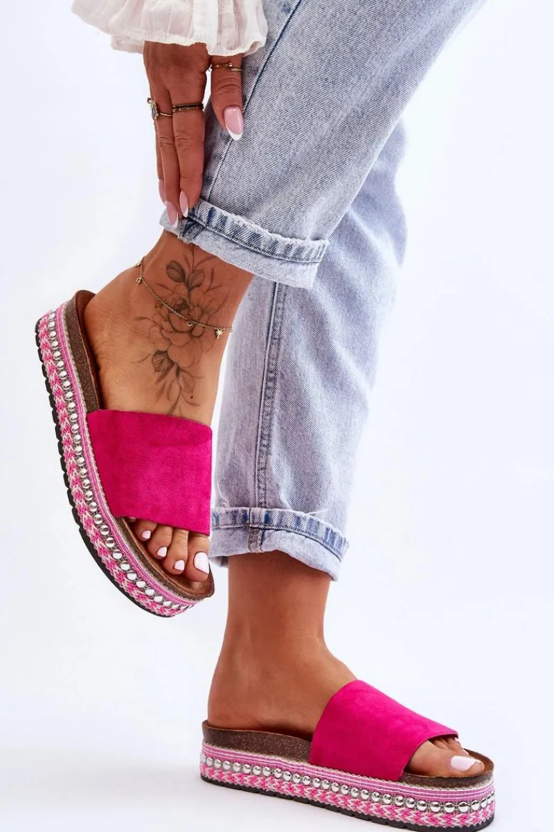 Damskie klapki zostały osadzone na masywnej platformie ze zdobieniami w postaci sznureczków oraz ćwieków. Profilowana wkładka jest wykonana z przyjemnego w dotyku eko zamszu. Platforma została ozdobiona sznureczkami oraz ćwiekami. Nosek jest odkryty i zaokrąglony. Ten model powinien być Twój! Przy wyborze rozmiaru prosimy sugerować się tabelą rozmiarów.