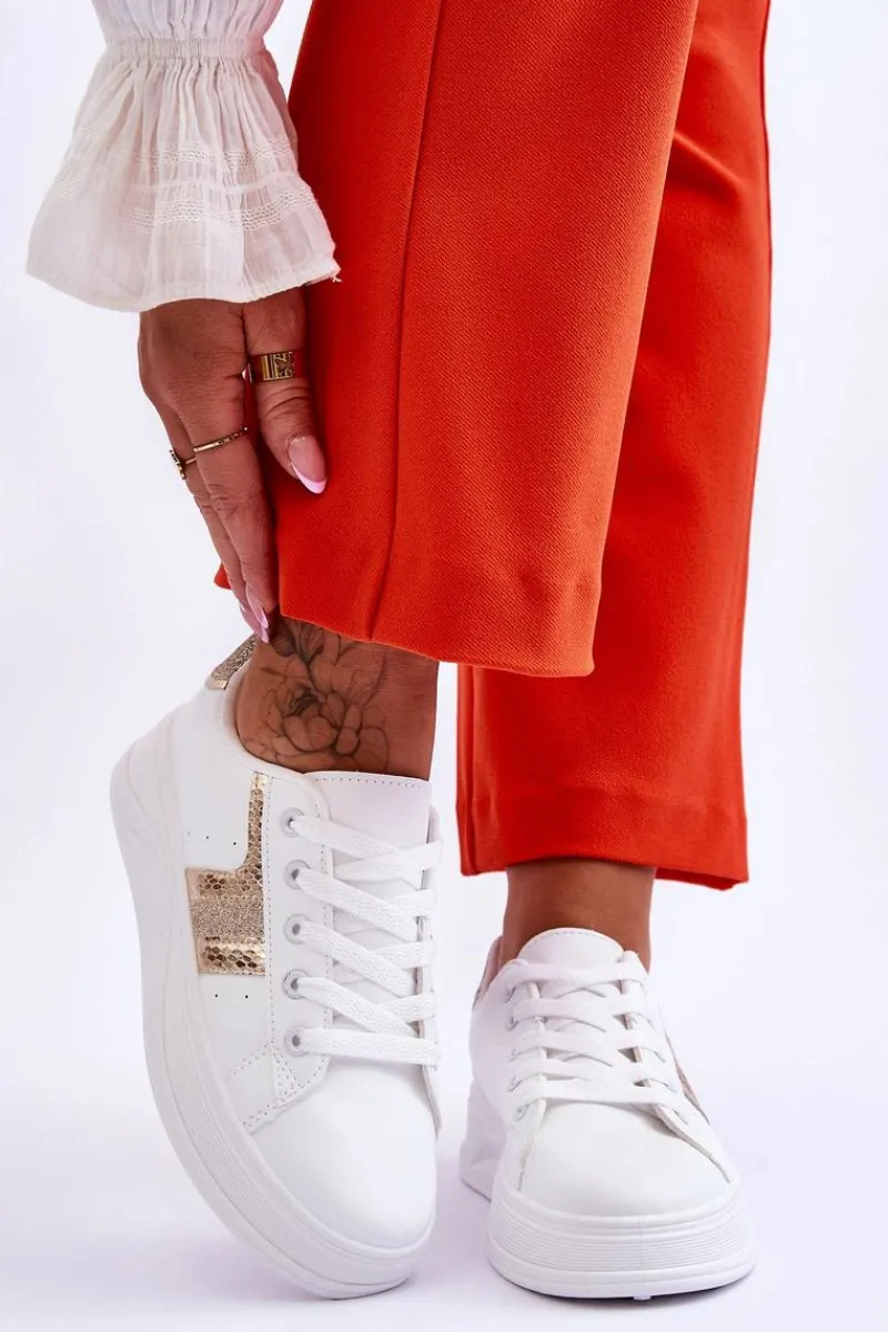 Klasyczne, damskie sneakersy zostały wykonane z eko skóry. Z boku oraz z tyłu cholewki zostały dodatkowo ozdobione brokatem. Buty sportowe posiadają klasyczne sznurowanie. Model ten został osadzony na masywnej platformie z gumowego tworzywa. Te buty sportowe z pewnością sprawdzą się w wielu stylizacjach! Przy wyborze rozmiaru prosimy kierować tabelą rozmiarów.