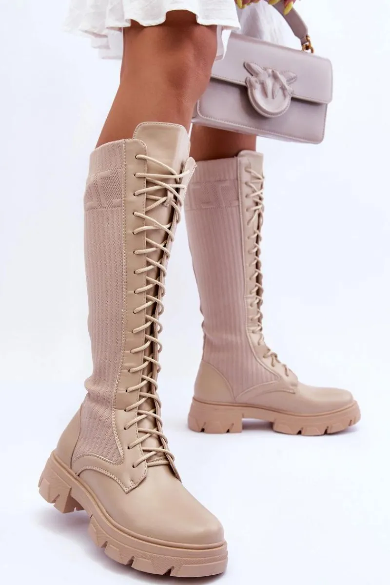 Modne damskie kozaki zostały wykonane z połączenia eko skóry oraz elastycznej tkaniny. Cholewka do kolana. Model osadzony na płaskim obcasie i platformie. Buty te posiadają usztywniany zapiętek. Model wsuwany z dodatkowym wiązaniem. Te klasyczne kozaki świetnie będą pasować do jesiennych stylizacji. Modny fason, który powinnaś mieć! Przy wyborze rozmiaru prosimy kierować tabelą rozmiarów.