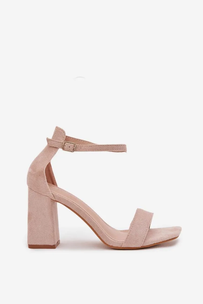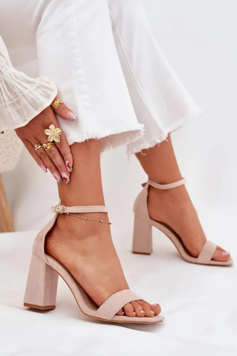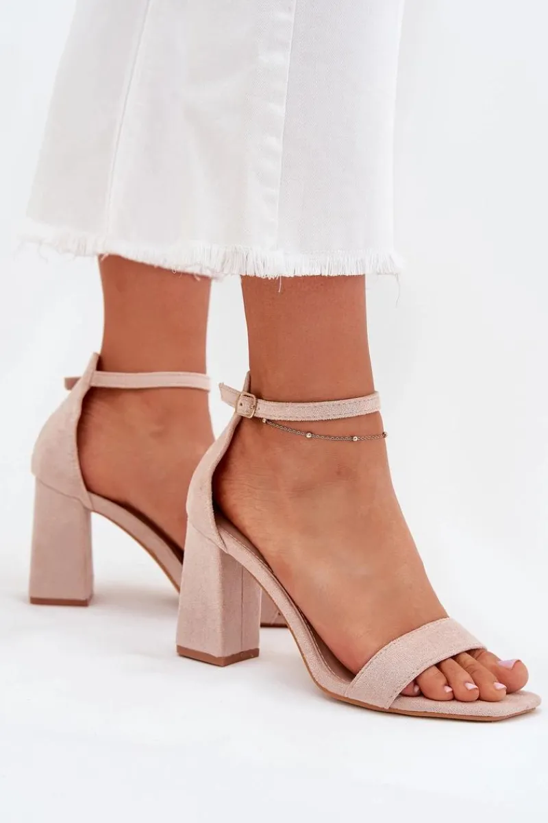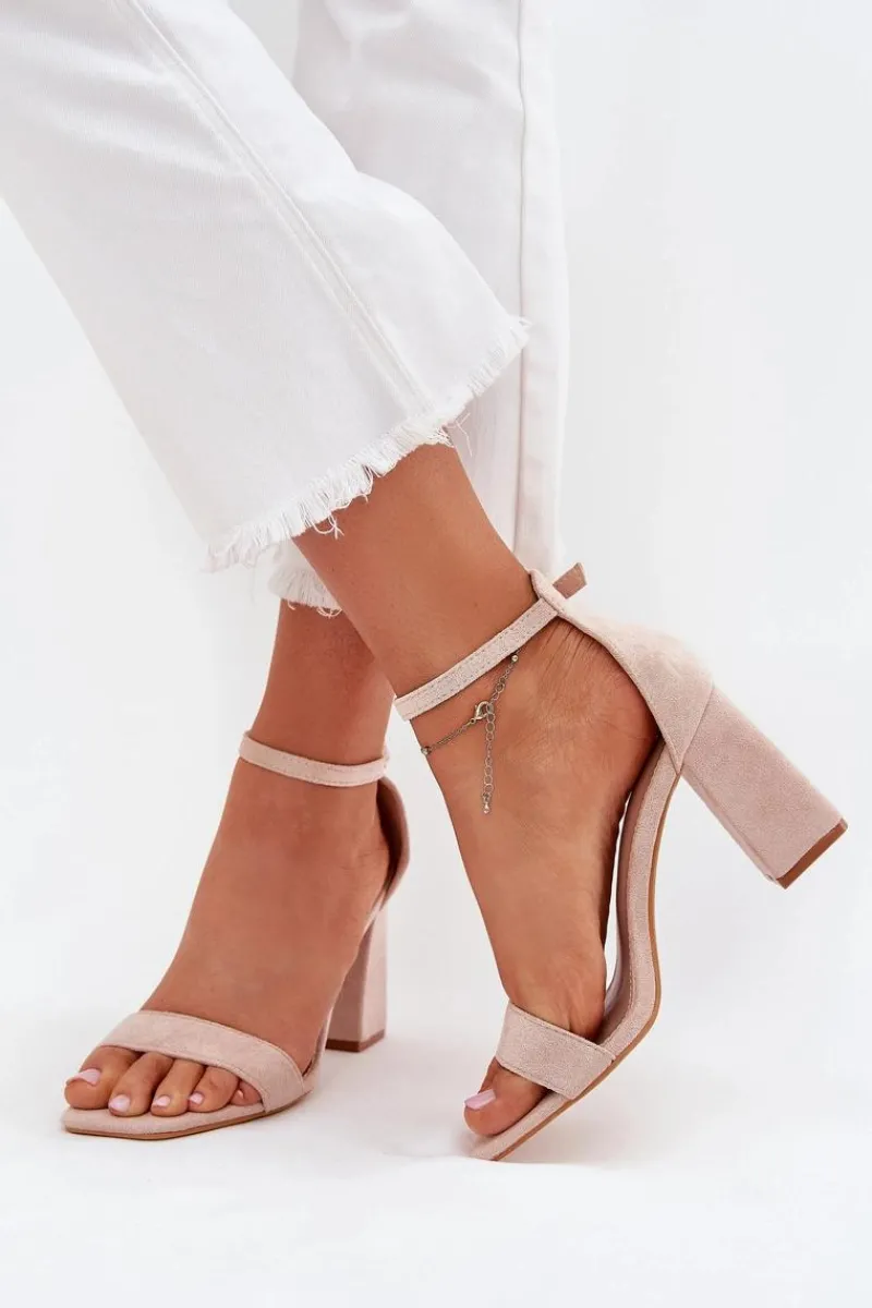Sandały damskie z eko zamszu, osadzone na słupkowym obcasie, to klasyczna propozycja na różne okazje. Zapinane na sprzączkę z regulowanym paskiem, zapewniają idealne dopasowanie i komfort przez cały dzień. Doskonałe na wieczorne wyjścia, wesela czy inne uroczystości. Przy wyborze rozmiaru prosimy kierować tabelą rozmiarów.