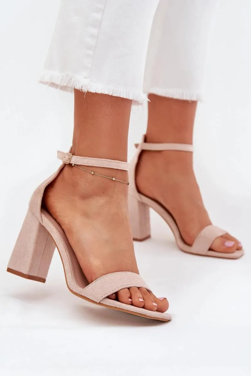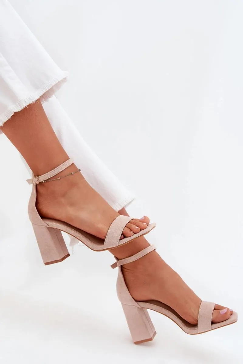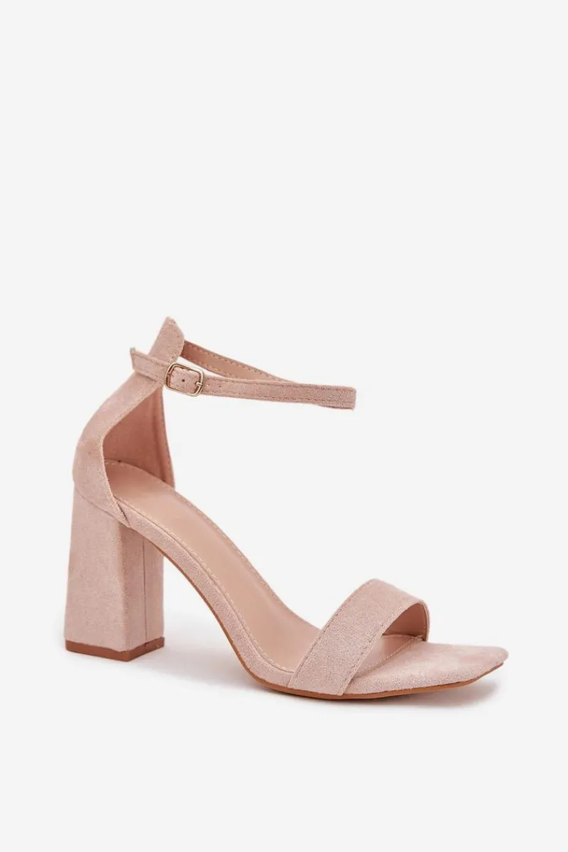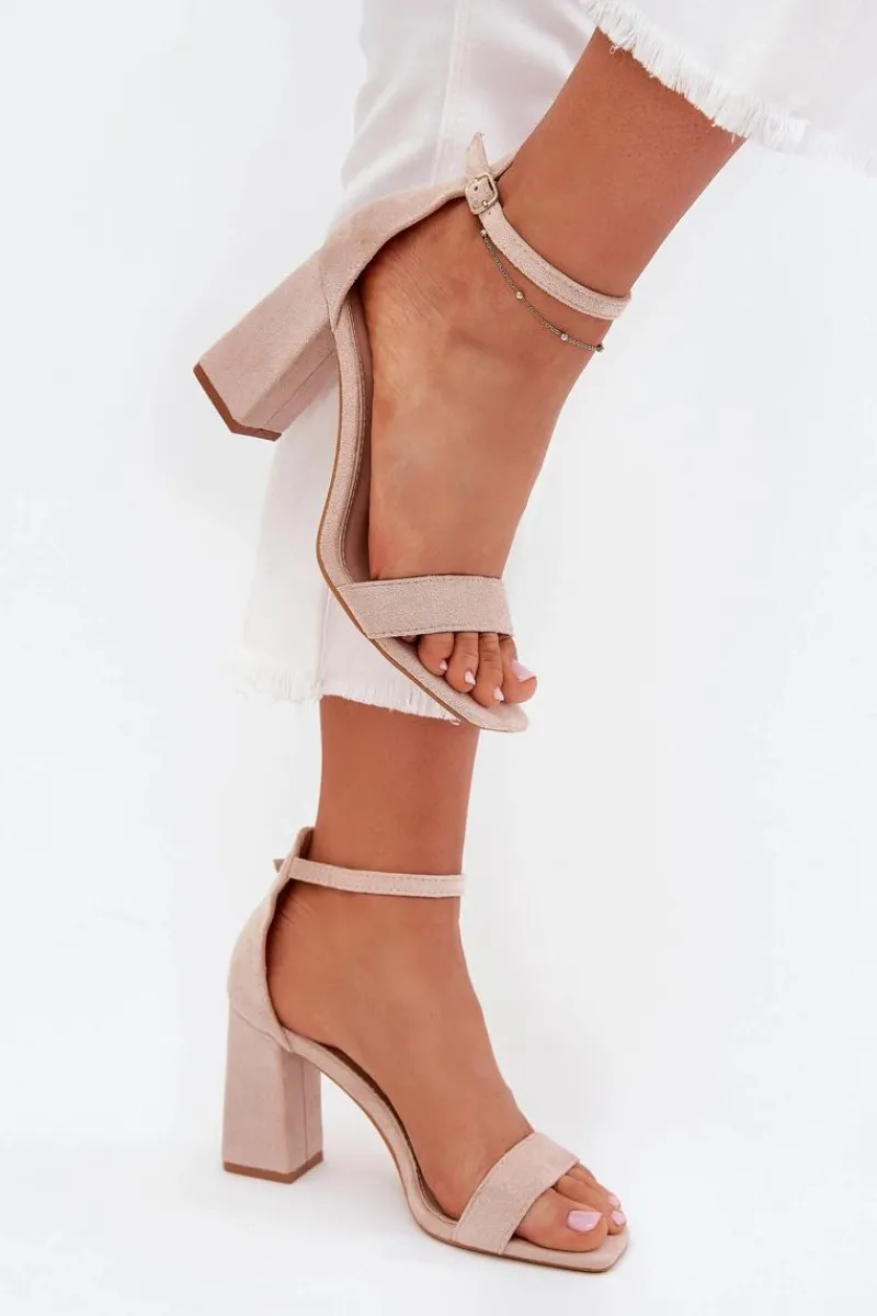 Sandały damskie z eko zamszu, osadzone na słupkowym obcasie, to klasyczna propozycja na różne okazje. Zapinane na sprzączkę z regulowanym paskiem, zapewniają idealne dopasowanie i komfort przez cały dzień. Doskonałe na wieczorne wyjścia, wesela czy inne uroczystości. Przy wyborze rozmiaru prosimy kierować tabelą rozmiarów.