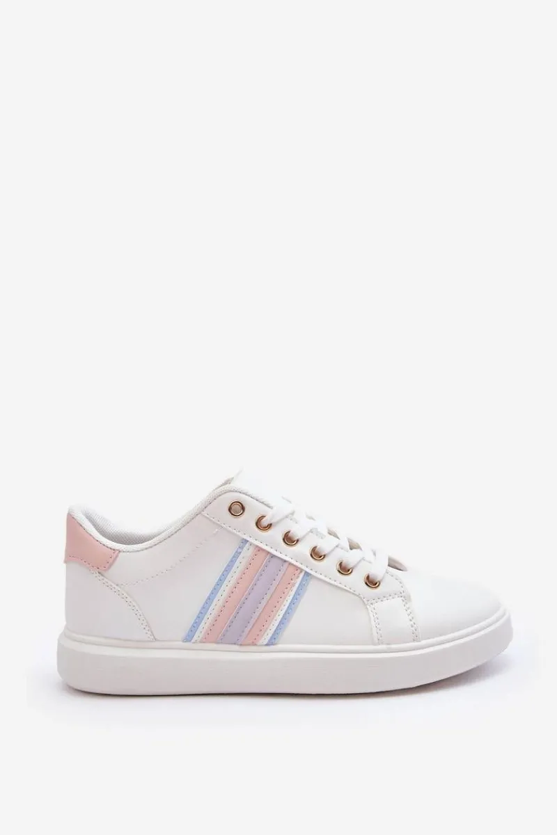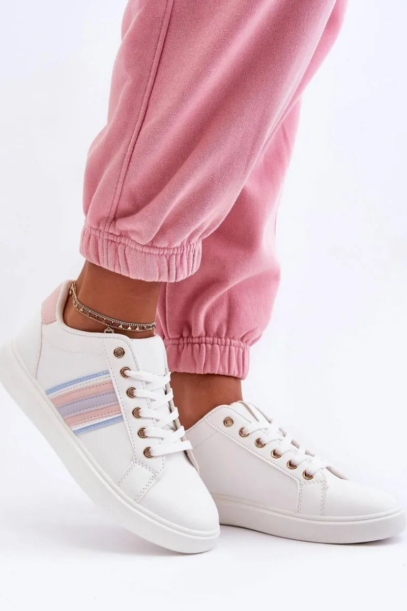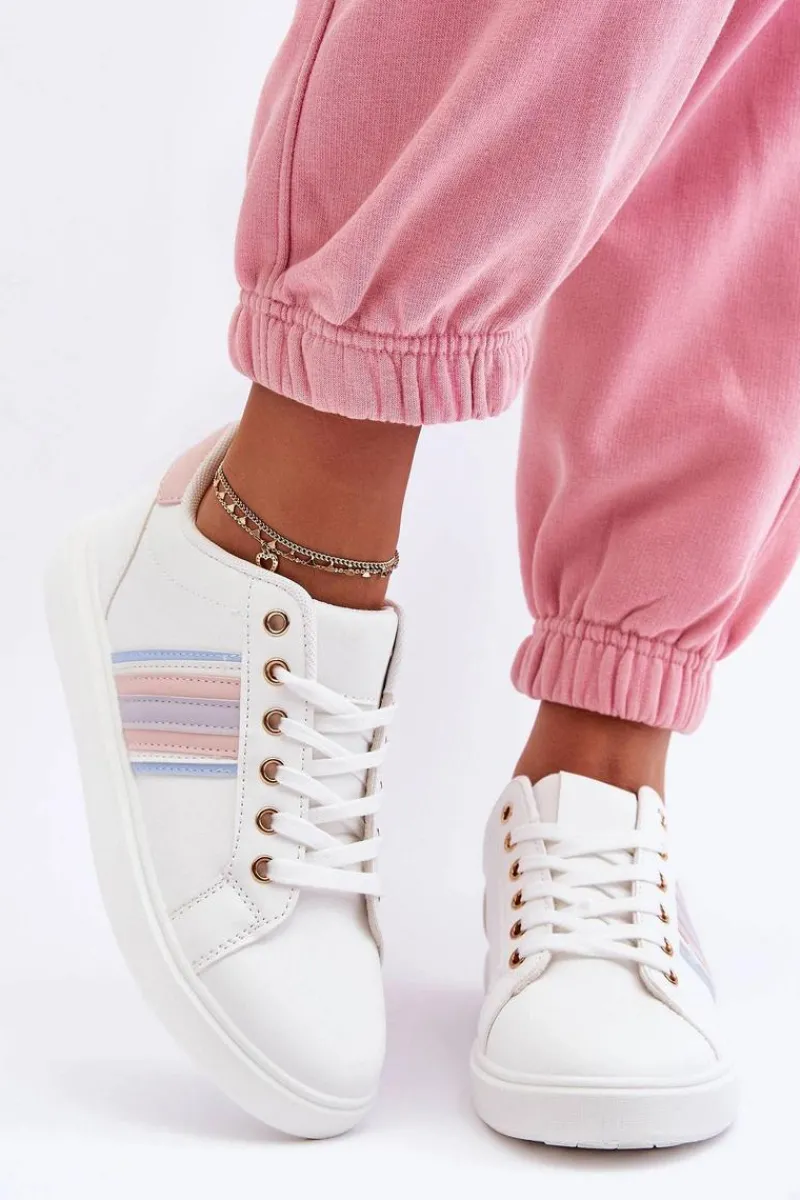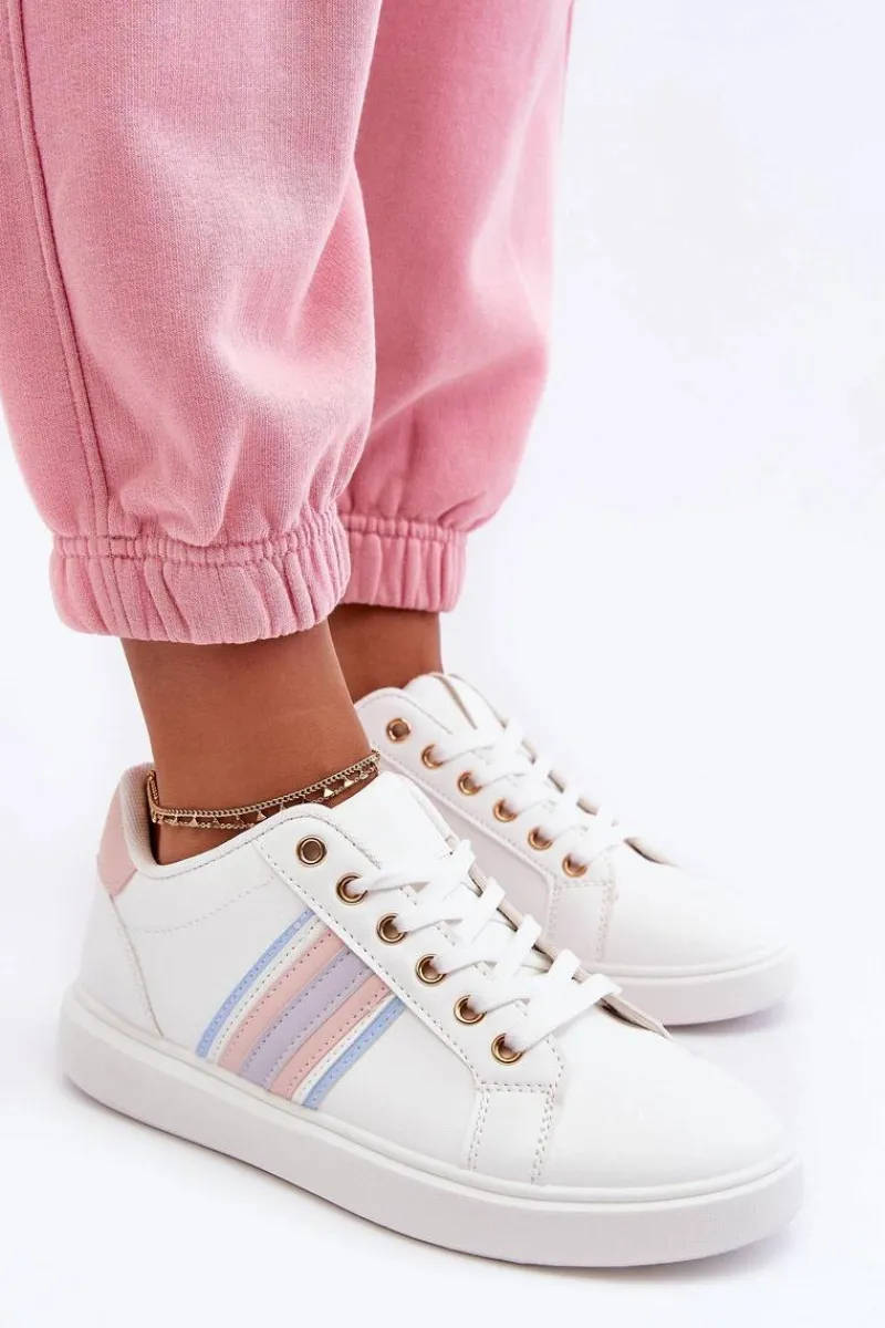 Klasyczne sneakersy damskie zostały wykonane z eko skóry. Buty te posiadają klasyczne sznurowanie i zdobienia w postaci cienkich pasków. Model został osadzony na platformie z zaokrąglonym noskiem. Szukasz butów do codziennego użytkowania, do pracy czy szkoły? Ten model będzie idealny! Przy wyborze rozmiaru prosimy kierować tabelą rozmiarów.