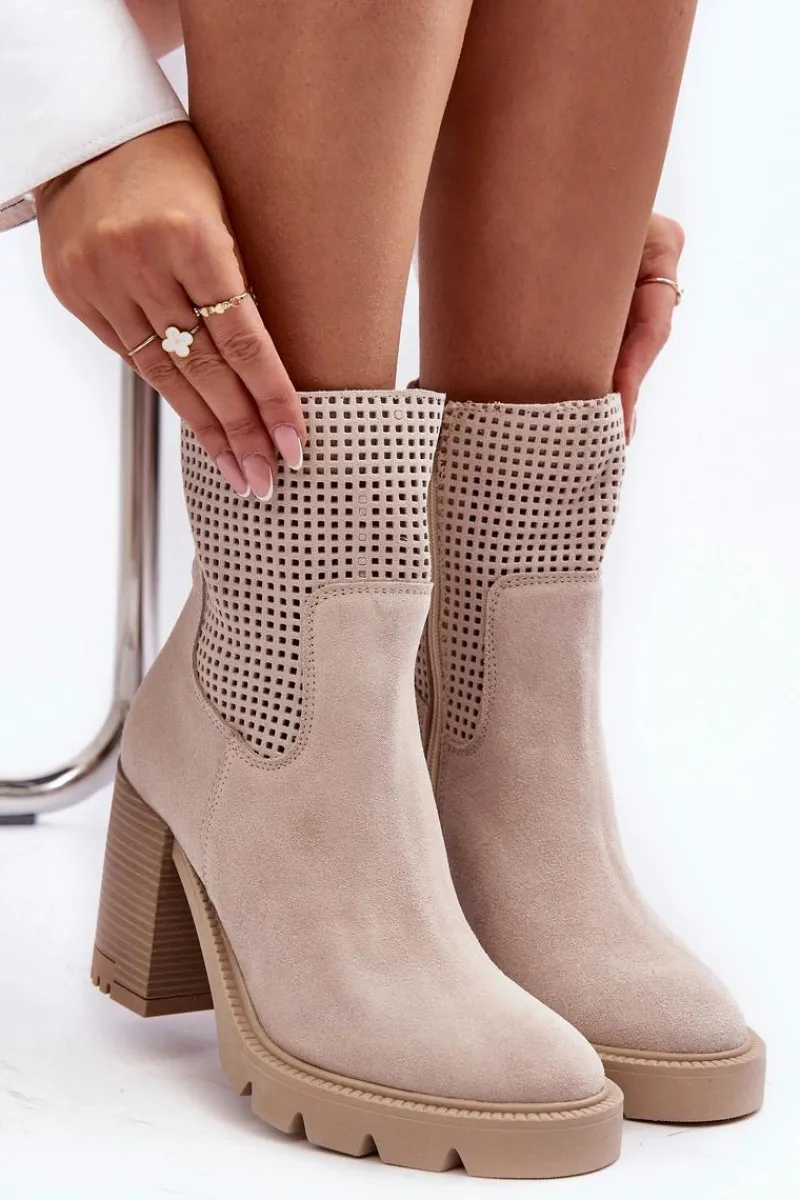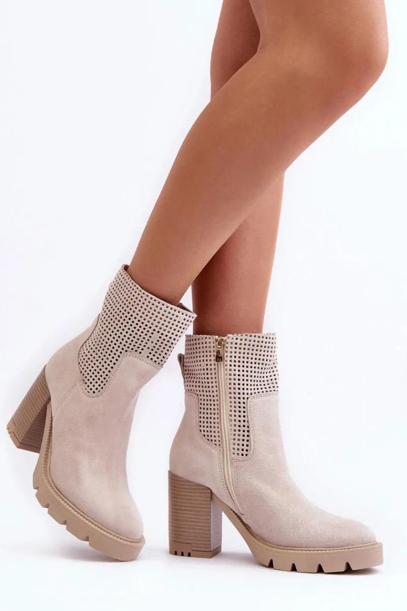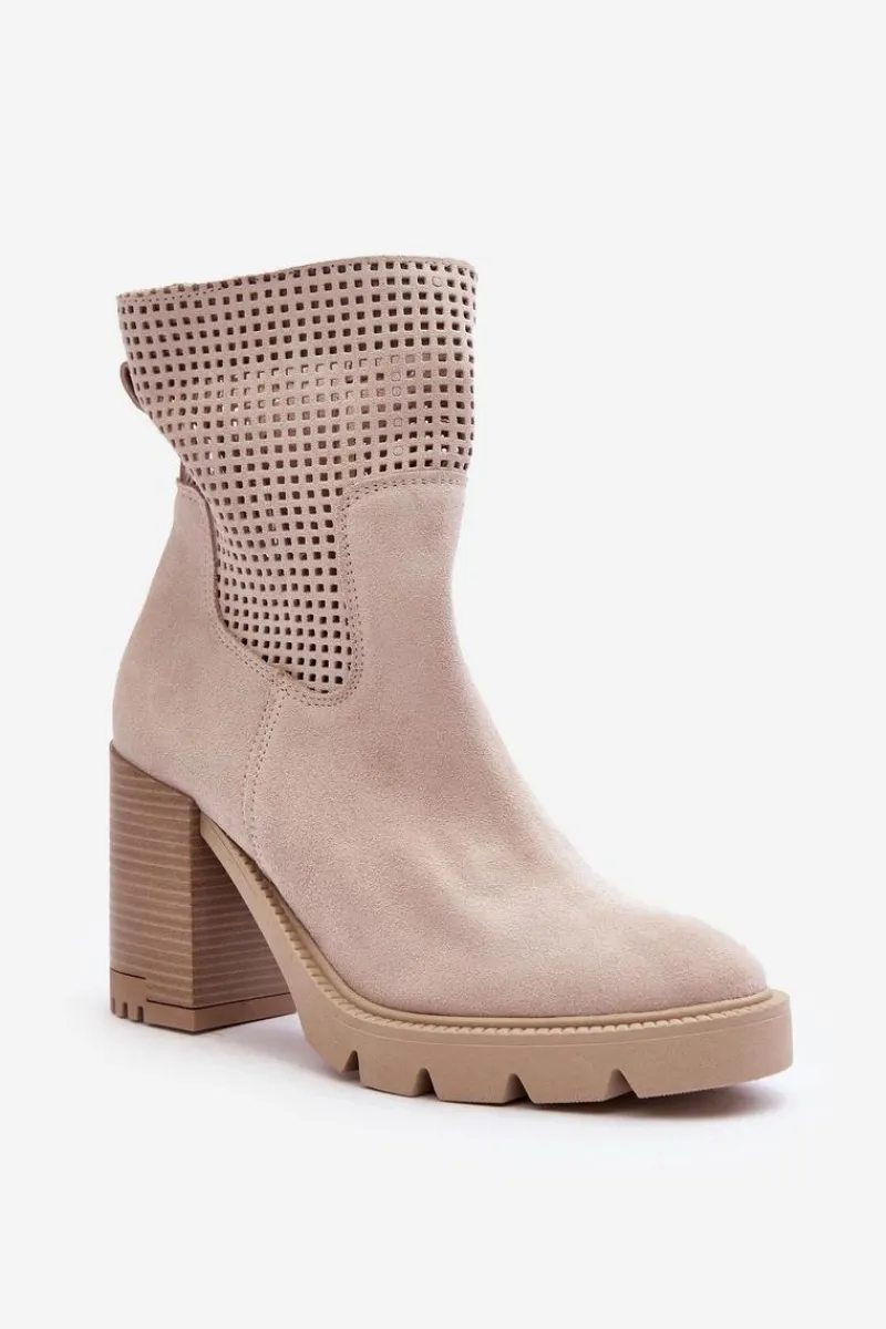 Modne, ażurowe botki na obcasie w postaci słupka zostały wykonane z wysokiej jakości skóry naturalnej. Zapinane na suwak z boku cholewki. Miękka, niezwykle wygodna wkładka została wykonana również z naturalnej skóry. Świetny model do wielu stylizacji! Przy wyborze rozmiaru prosimy sugerować się tabelą rozmiarów.