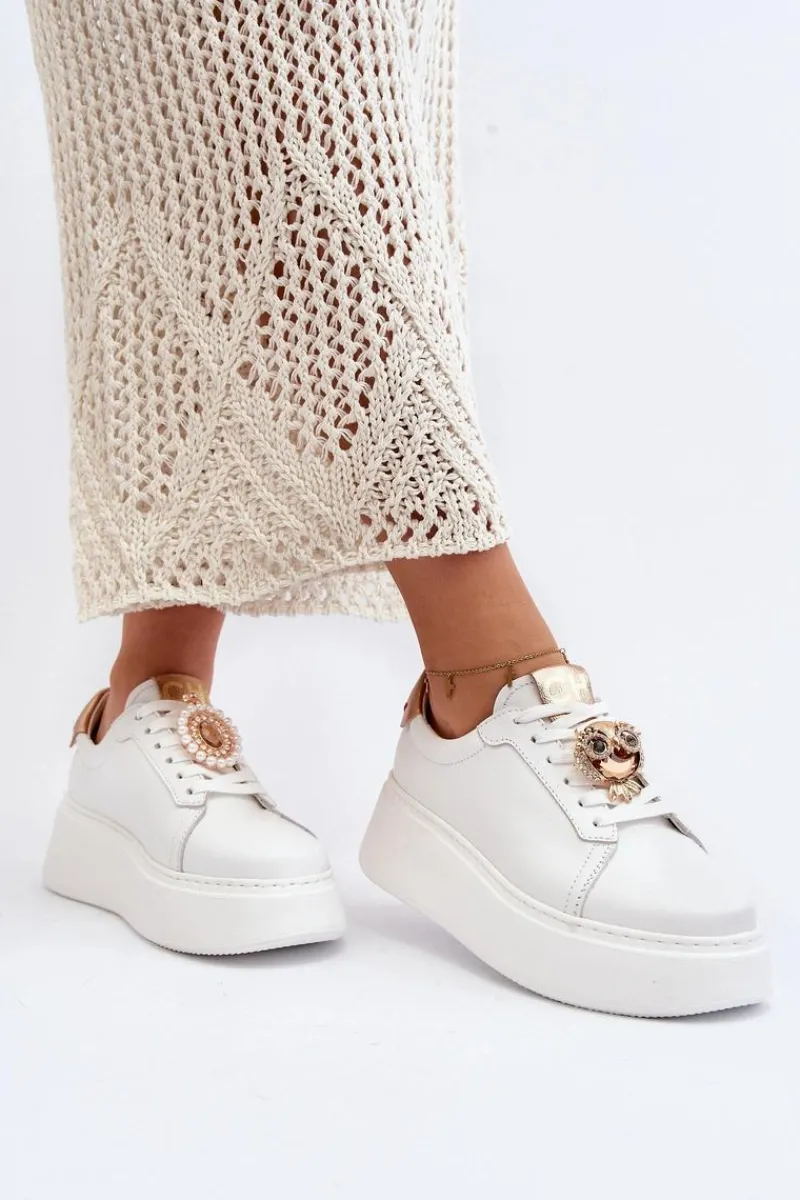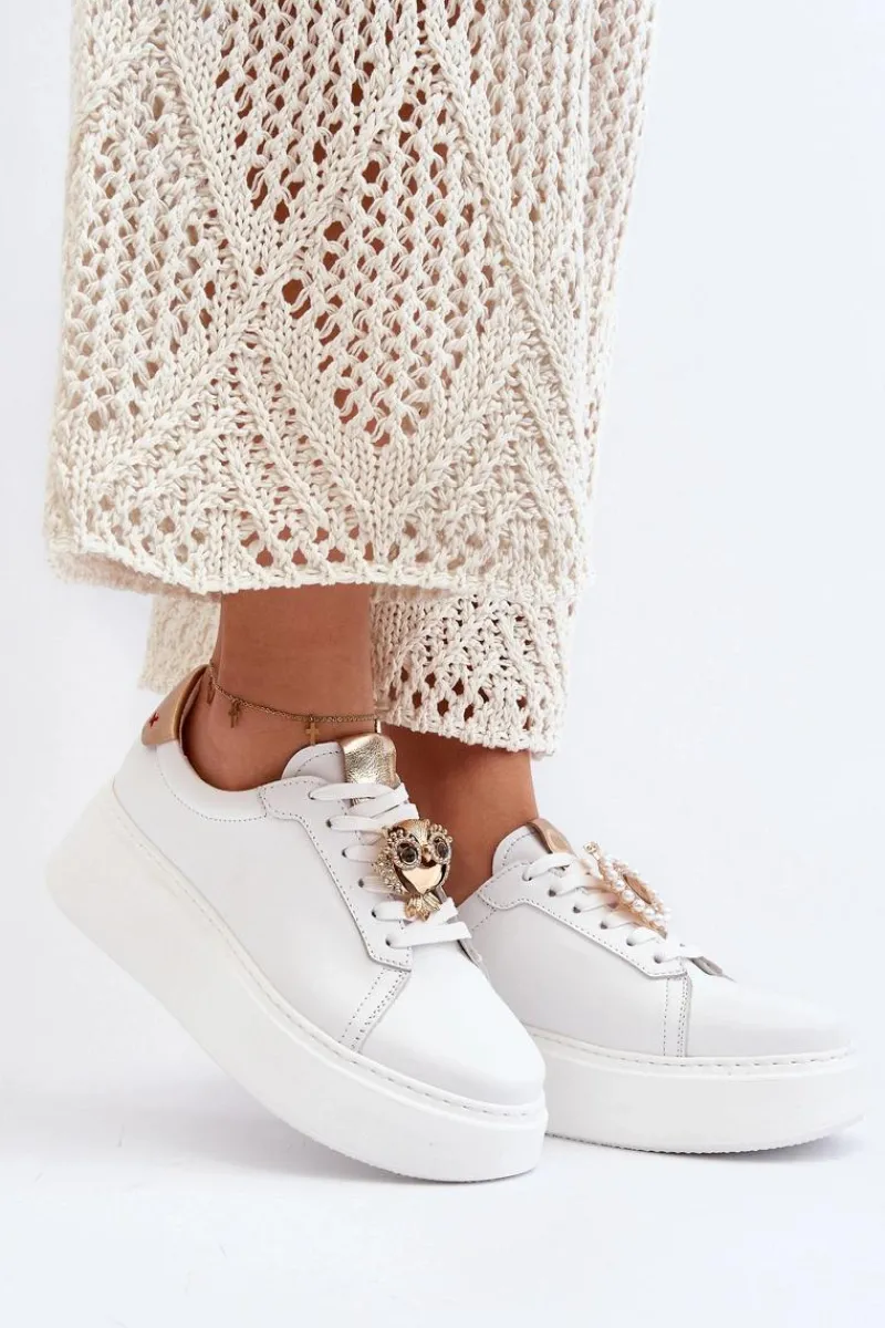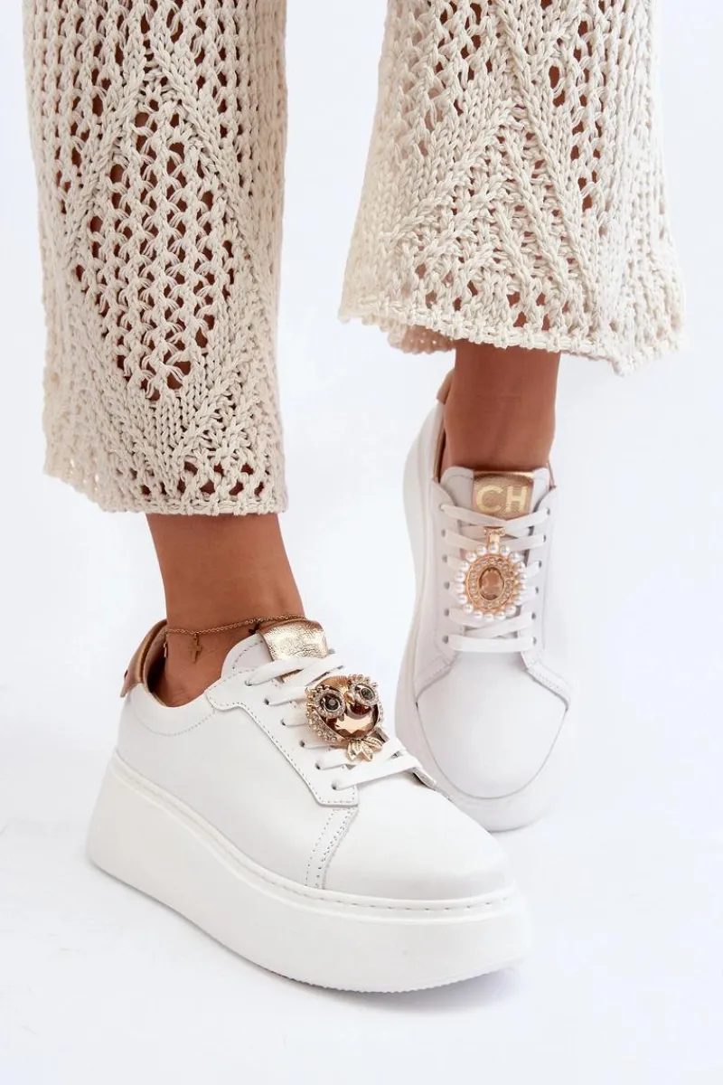 Sneakersy damskie od marki CheBello. Wykonane z wysokiej jakości skóry naturalnej. Osadzone na platformie z gumowego tworzywa. Na sznurowaniu znajduje się ozdobna broszka. Model ten to świetna propozycja dla osób, które chcą połączyć wygodę z elegancją w codziennych stylizacjach! Przy wyborze rozmiaru prosimy sugerować się tabelą rozmiarów.